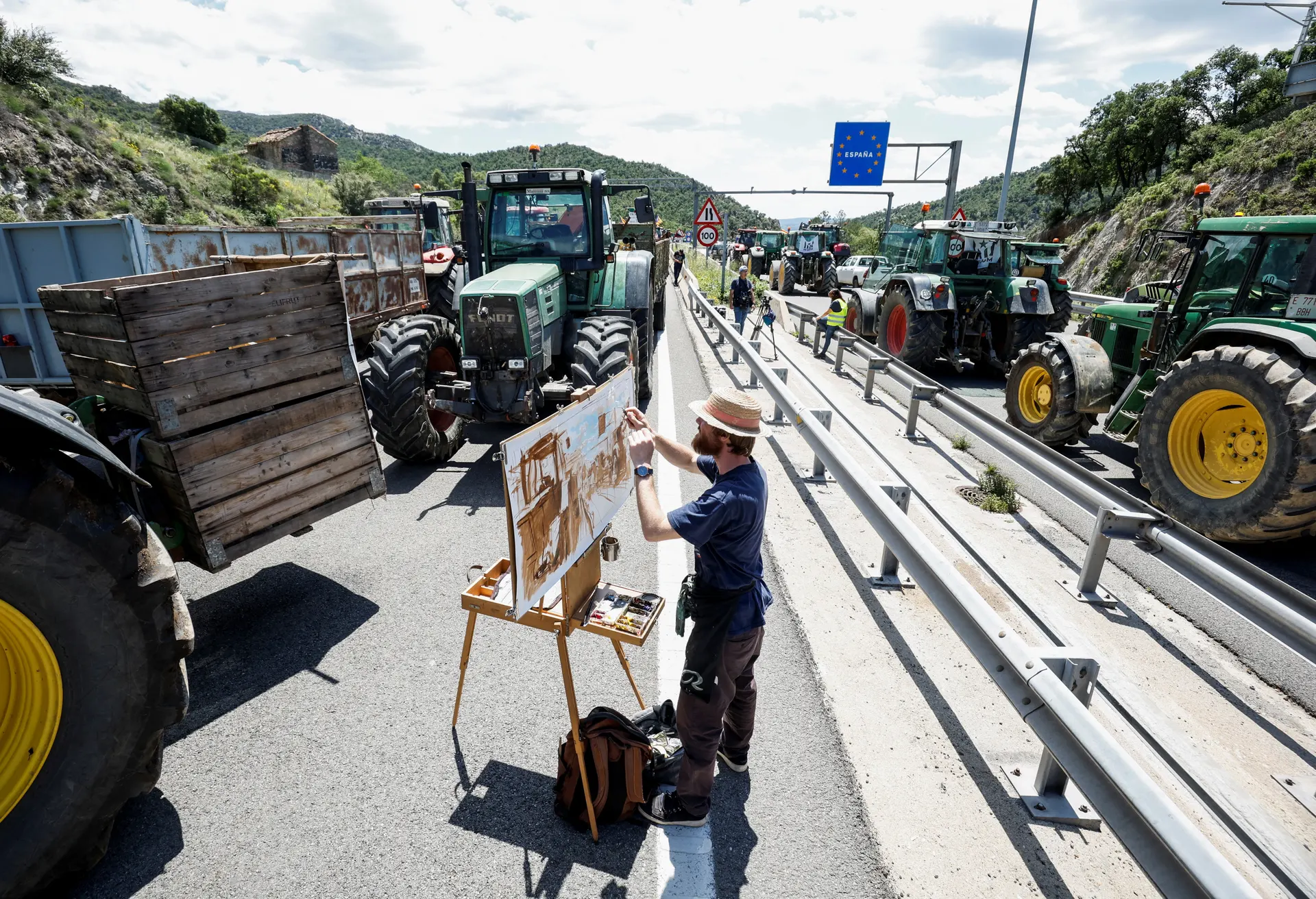 Голландский художник Седрик Виссер рисует, как фермеры с тракторами блокируют шоссе AP-7. Голландский художник Седрик Виссер рисует, как фермеры с тракторами блокируют шоссе AP-7 недалеко от границы между Испанией и Францией во время демонстрации с требованием улучшения условий перед европейскими выборами. Фотография: Альберт Геа/Reuters. Фотография: Альберт Геа/Reuters
