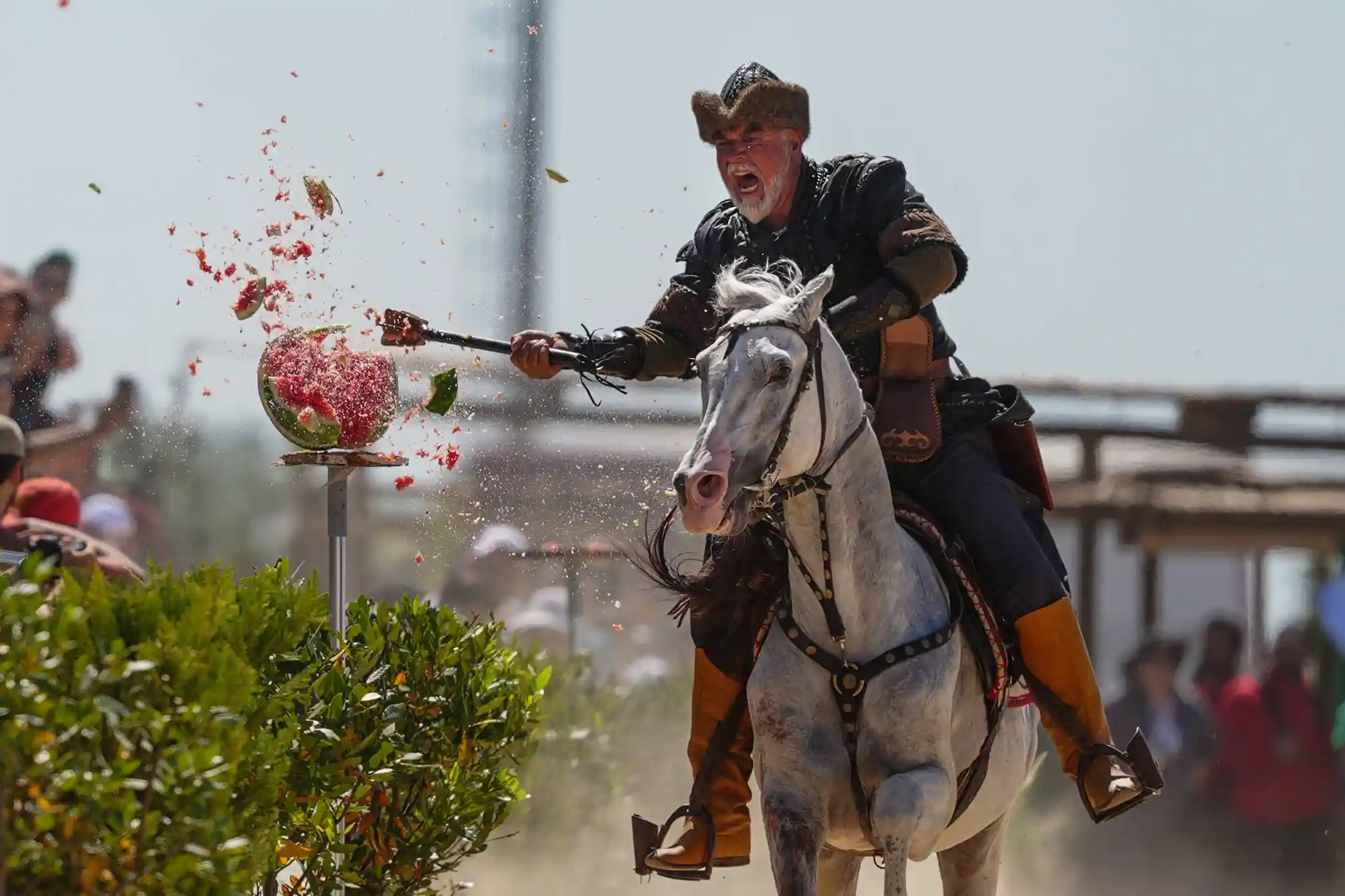 Всадник разбивает арбуз во время фестиваля культуры «Этноспорт» в Турции. Фотография: Адем Кутуку/Анадолу через Getty Images