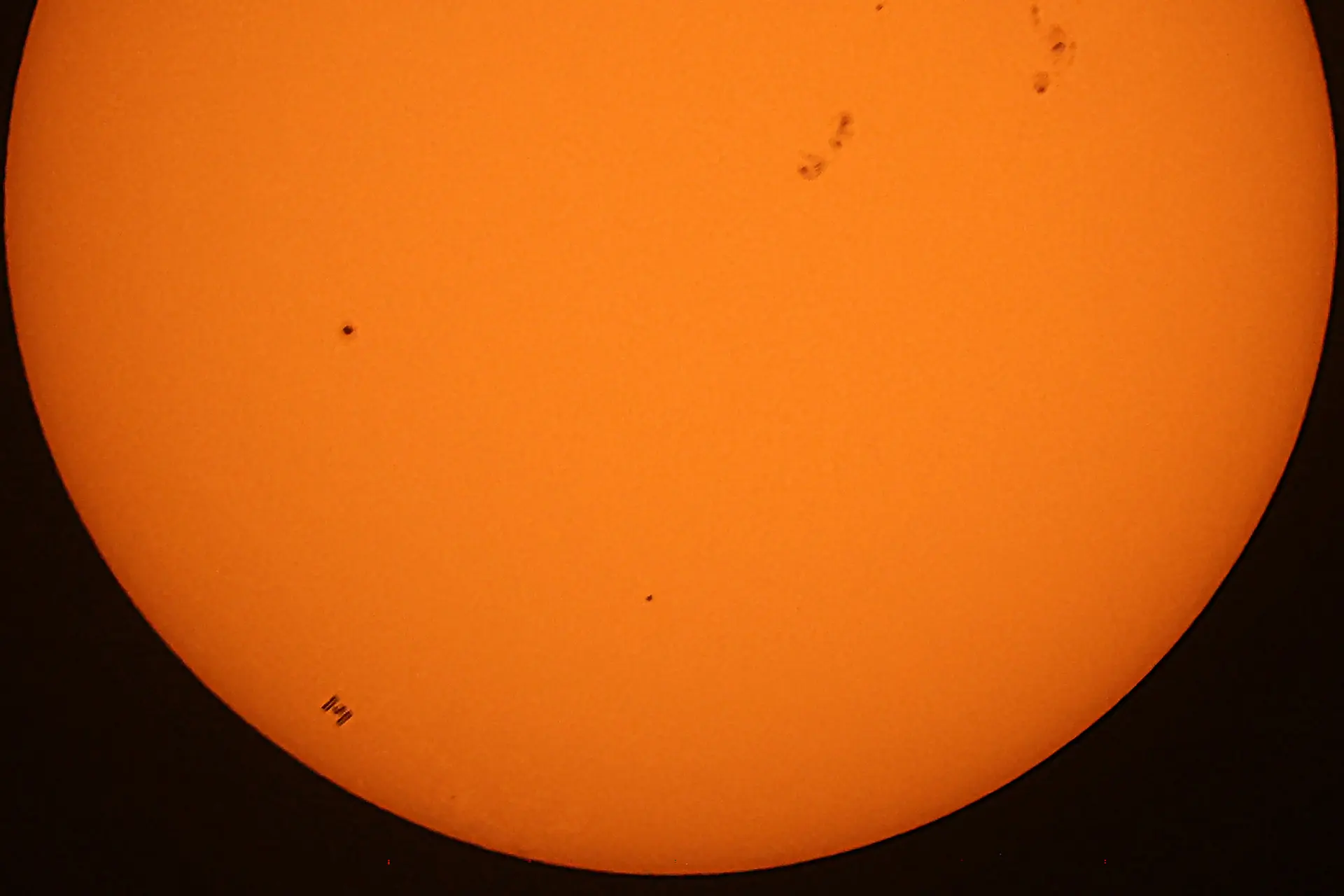 Международная космическая станция движется поперек Солнца на снимке, сделанном из Аль-Масаеля в Кувейте. Фотография: Ясир Аль-Зайят/AFP/Getty Images