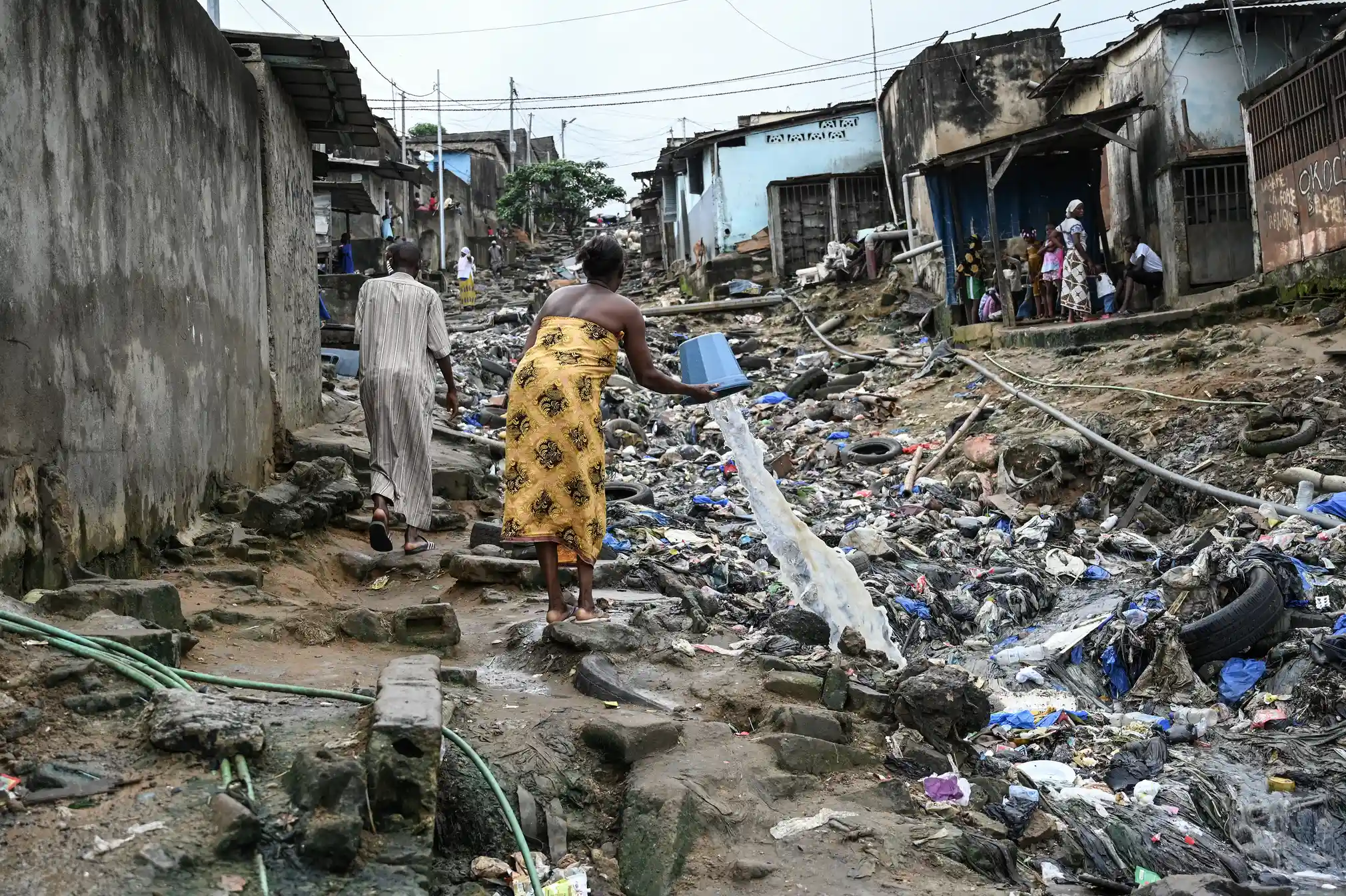 Женщина выливает воду на заваленную пластиковыми отходами улицу в коммуне в Абиджане. Аттекубе, Кот-д’Ивуар. Фотография: Сиа Камбоу/AFP/Getty Images