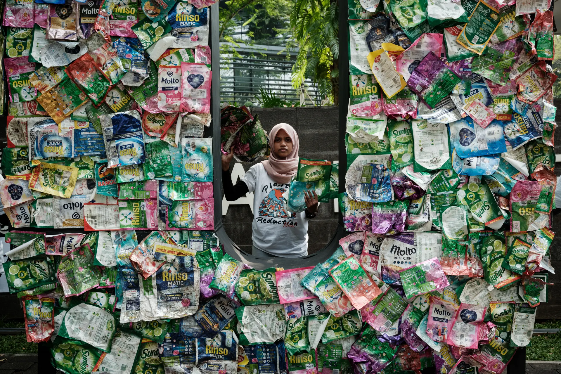 Члены Гринпис демонстрируют пластиковые отходы от продукции Unilever в рамках акции «возврат отправителю» перед офисом компании в Тангеранге, пригороде Джакарты.