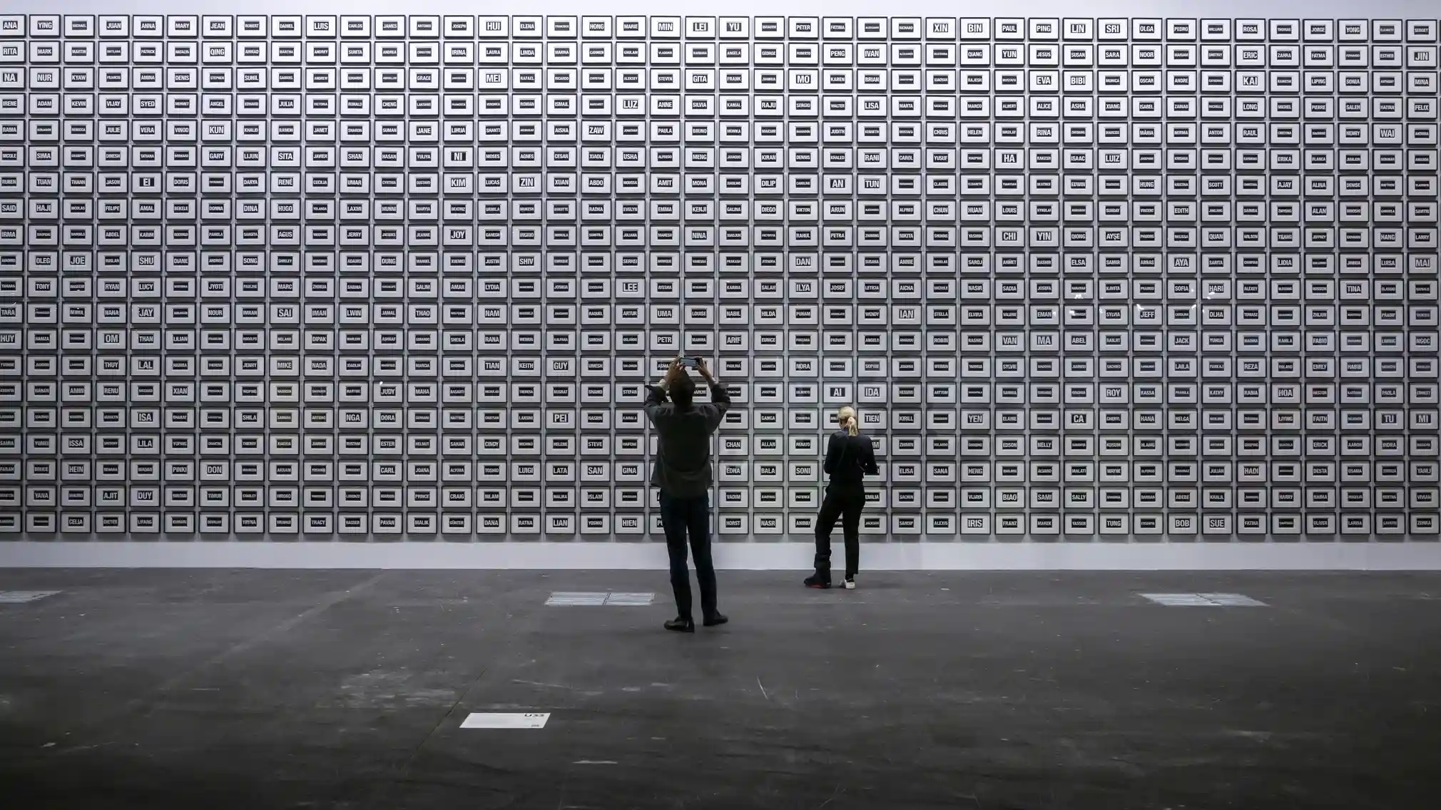 «Мир: Момент во времени» американского художника Аллана МакКоллума представлен на международной выставке Art Basel. Базель, Швейцария. Фотография: Георгиос Кефалас/EPA.