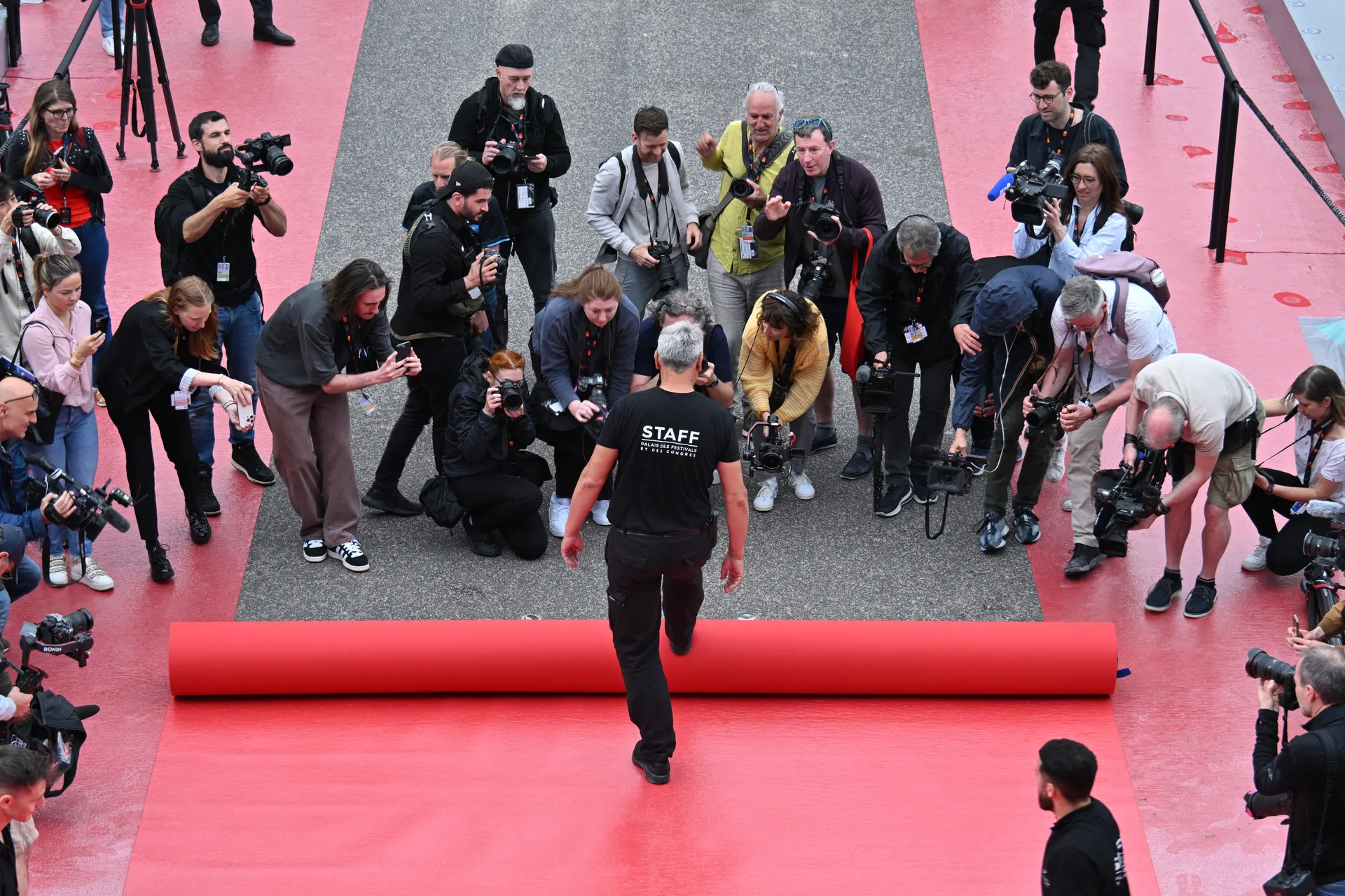 Сотрудник разворачивает красную дорожку во Дворце фестивалей перед церемонией открытия 77-го Каннского кинофестиваля. Фотография: Антонен Тюилье/AFP/Getty Images