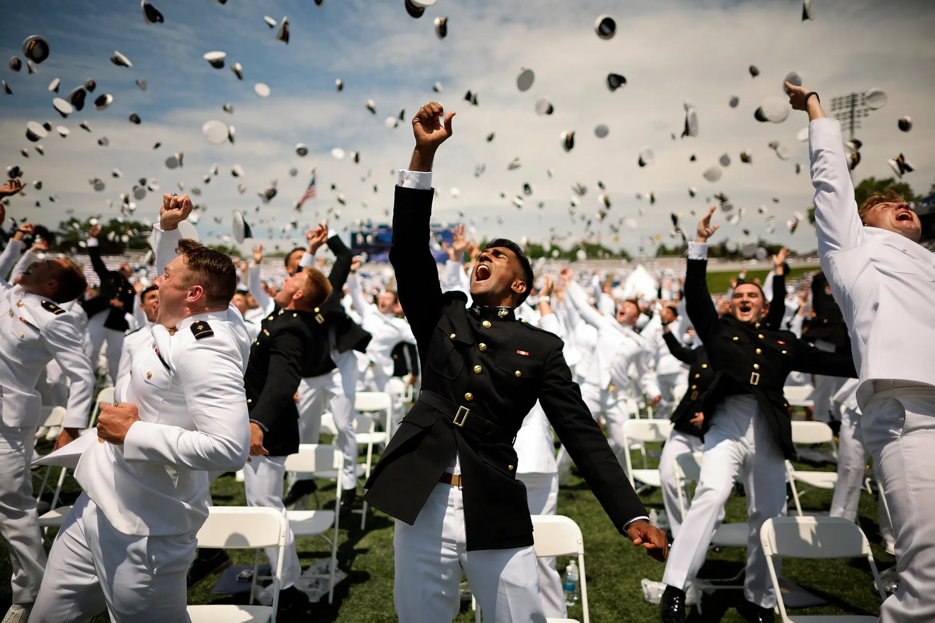Выпускники военно-морской академии празднуют завершение выпускной церемонии на Мемориальном стадионе морской пехоты в Аннаполисе. Мэриленд, США. Фотография: Чип Сомодевилла/Getty Images