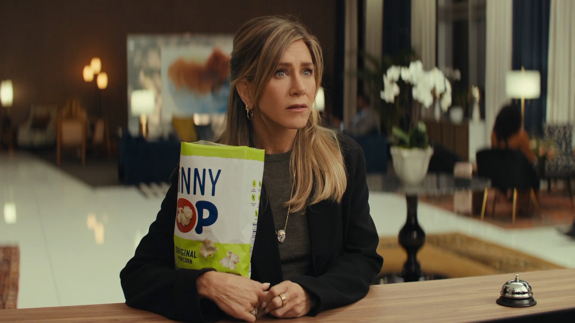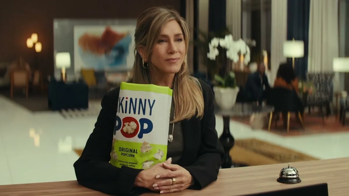 В рекламе показано, как актриса пытается заселиться в отель, поедая пакетик SkinnyPop. Портье начинают волноваться, но не из-за Энистон, а из-за попкорна.