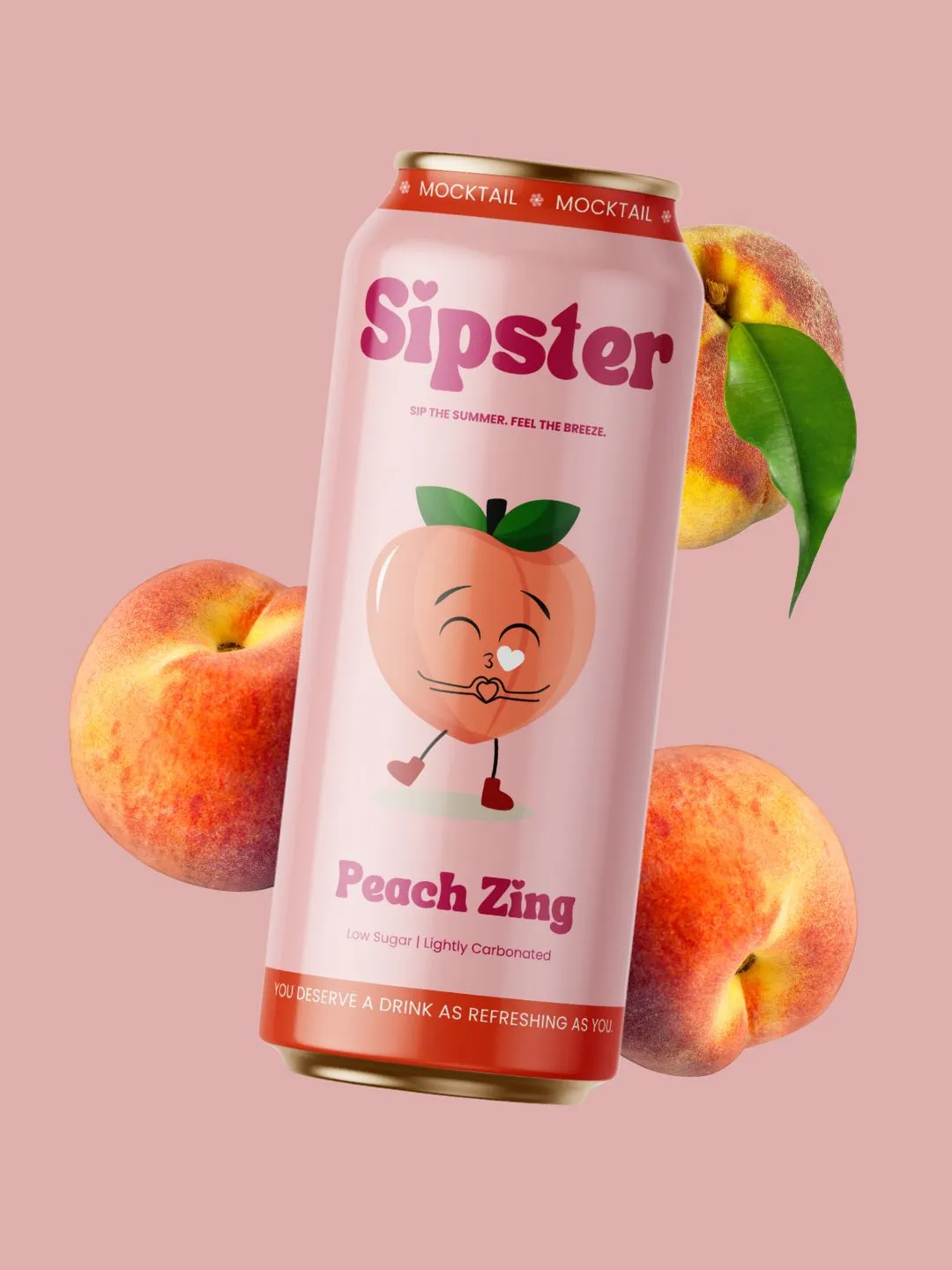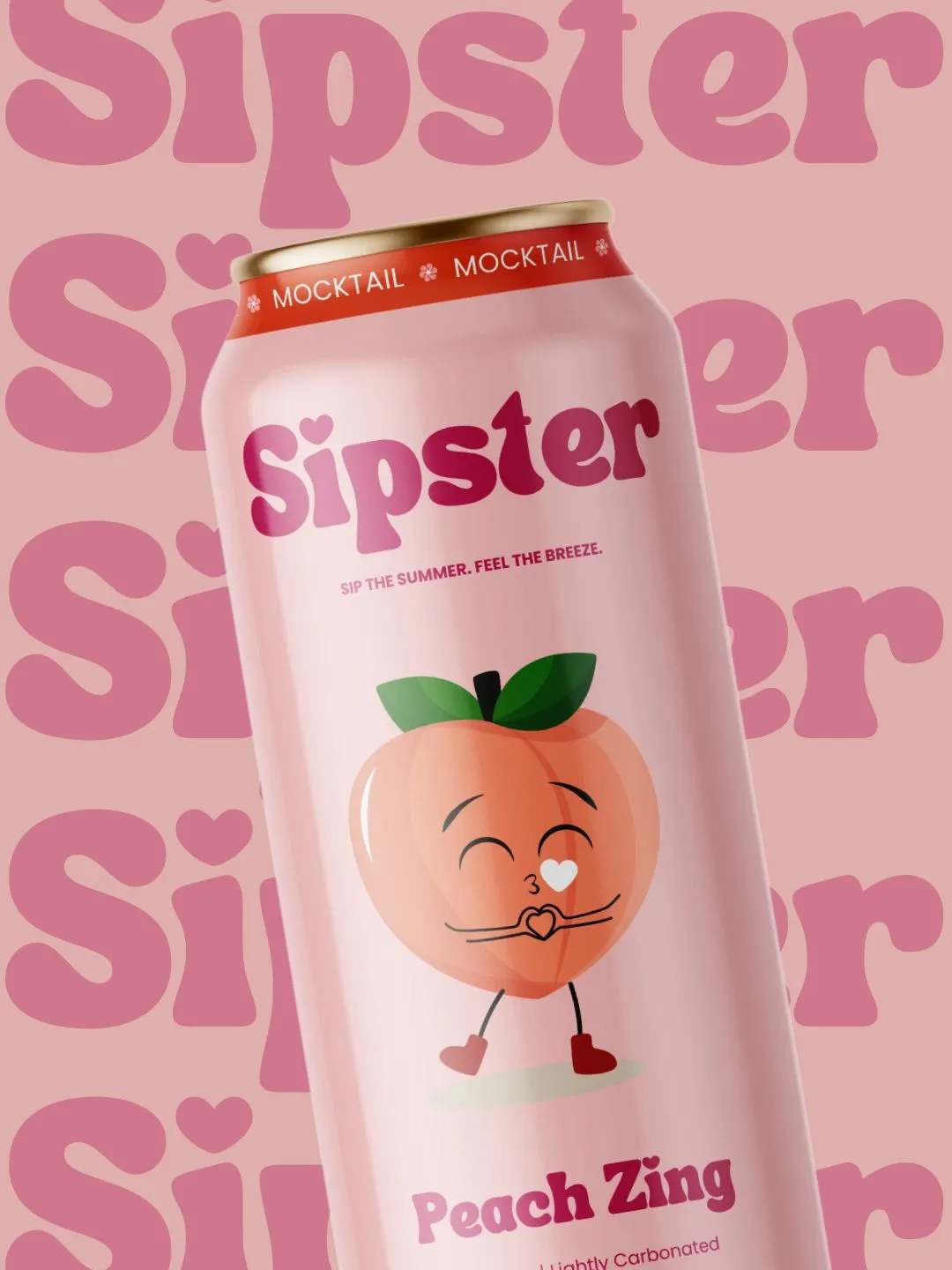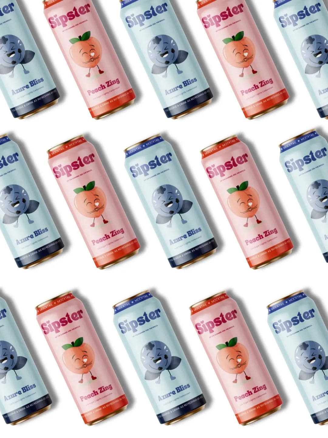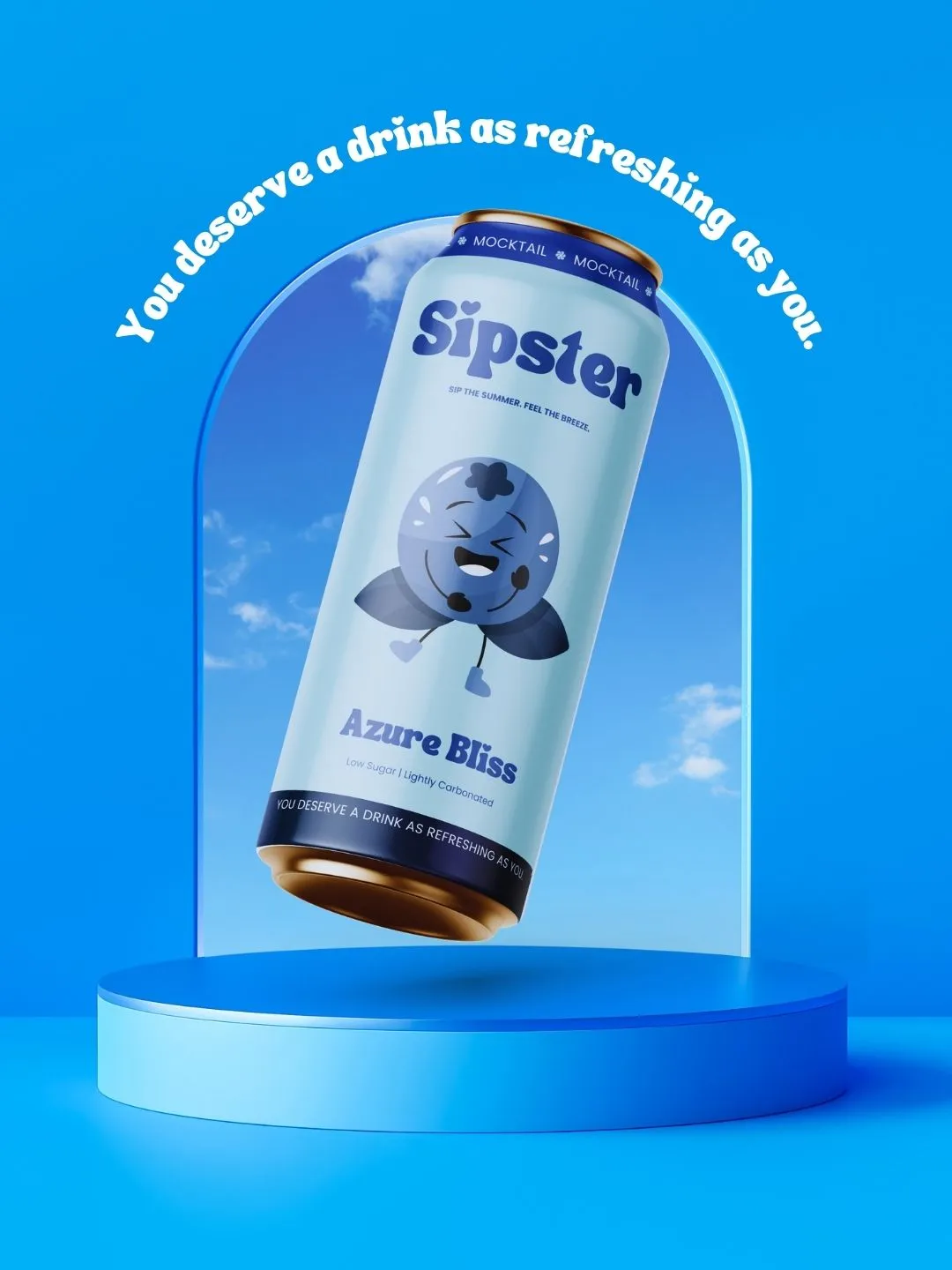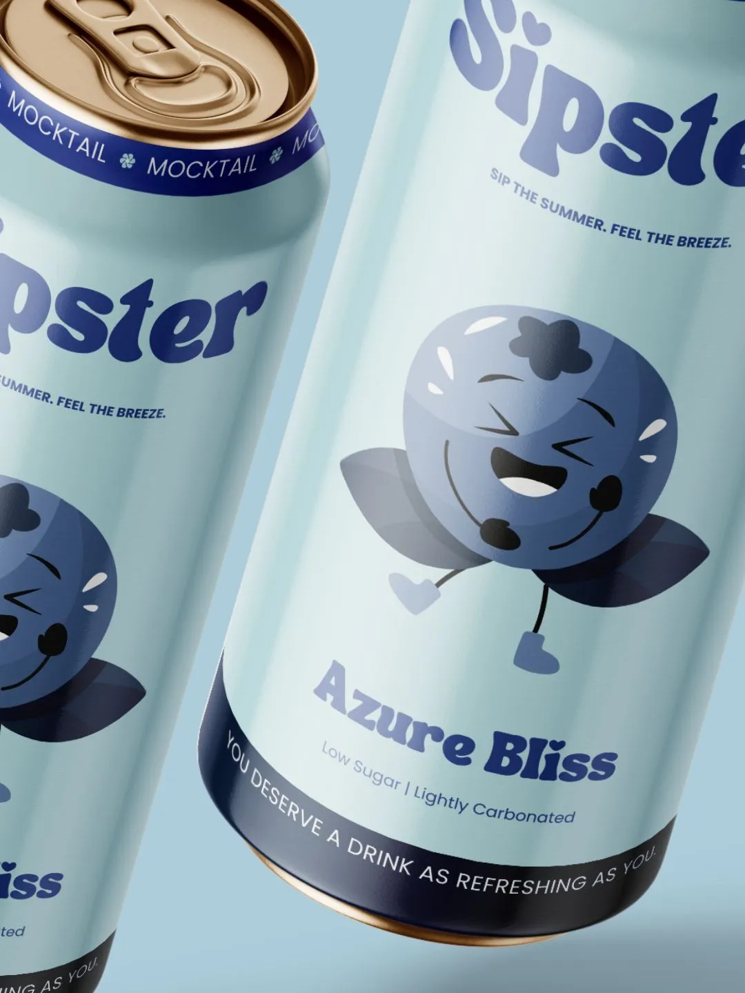 Дизайн упаковки безалкогольных коктейлей Sipster привносит яркую и игривую эстетику в мир напитков, мгновенно привлекая внимание на полках магазинов. Созданная для современных потребителей, заботящихся о здоровье, упаковка украшена очаровательными фруктовыми персонажами, воплощающими насыщенные вкусы каждого напитка — Peach Zing и Azure Bliss.