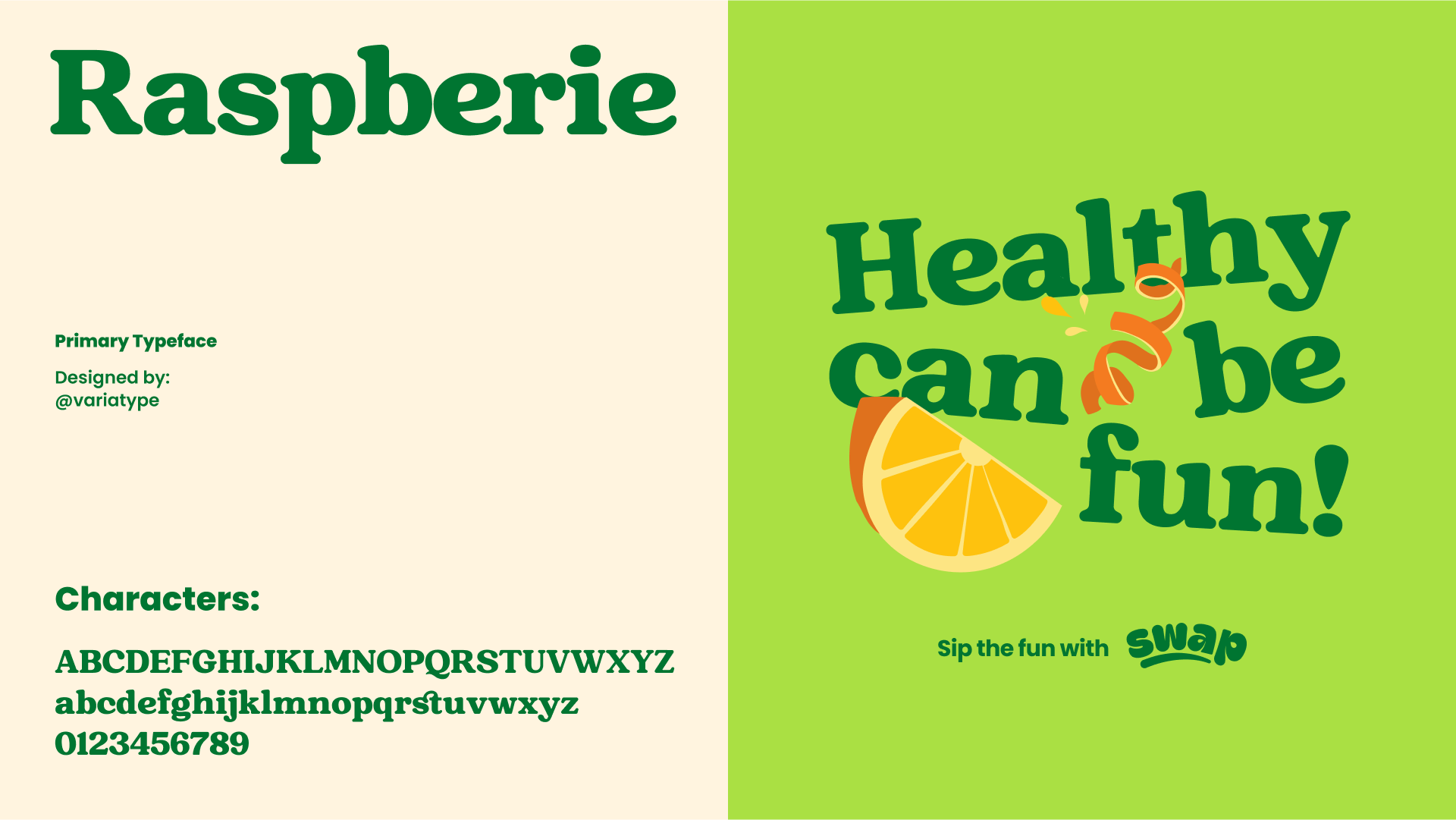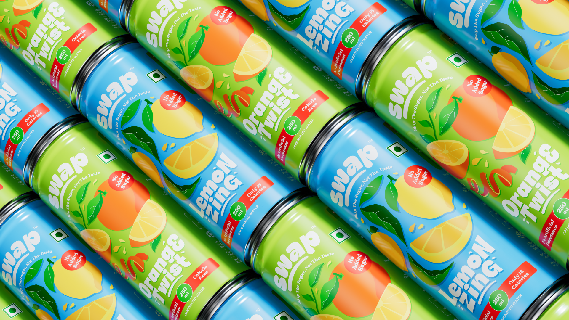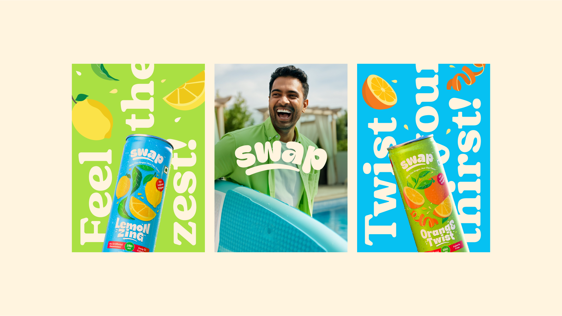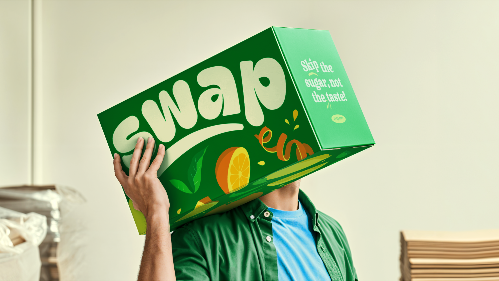 Яркая, выразительная упаковка гарантирует сильное присутствие на полке, сразу транслируя чистый состав, низкое содержание сахара и легкость без чувства вины. Типографика и иллюстрации подчеркивают свежий, авантюрный и ориентированный на здоровье характер бренда, позволяя SWAP выделяться среди конкурентов, которые чрезмерно искусственны. Каждое дизайнерское решение — от динамичного, пузырькового логотипа до насыщенной цветовой палитры — отражает главную миссию бренда: заменяй сахар, но не вкус.