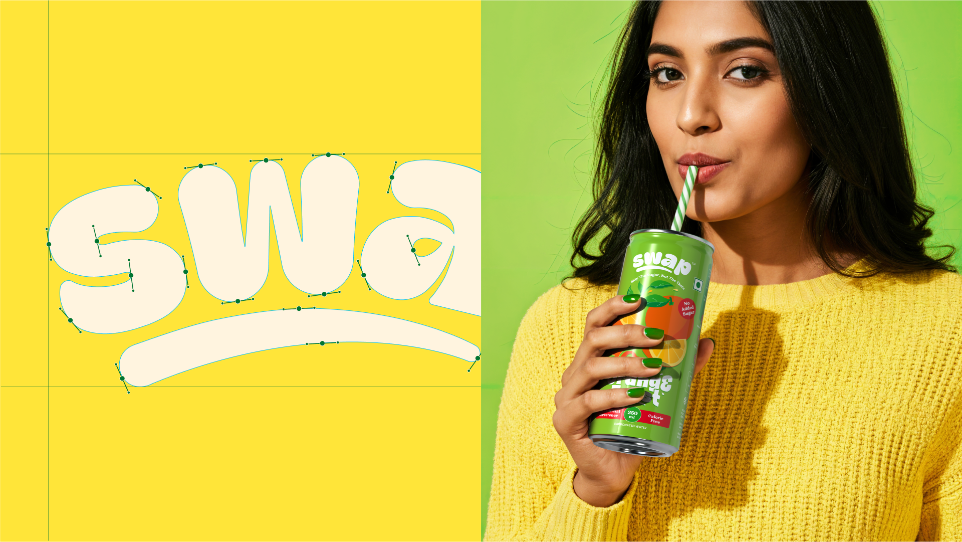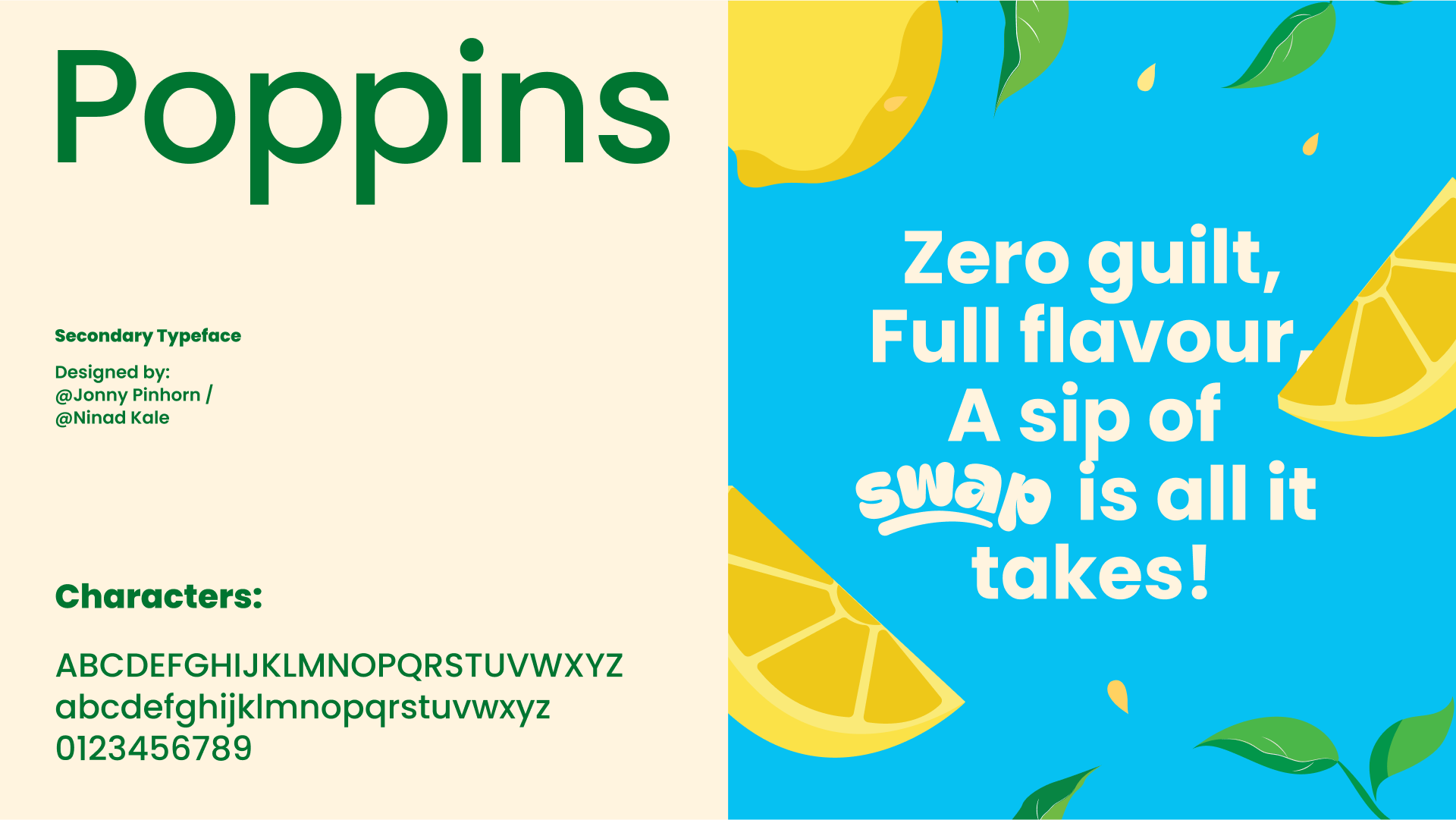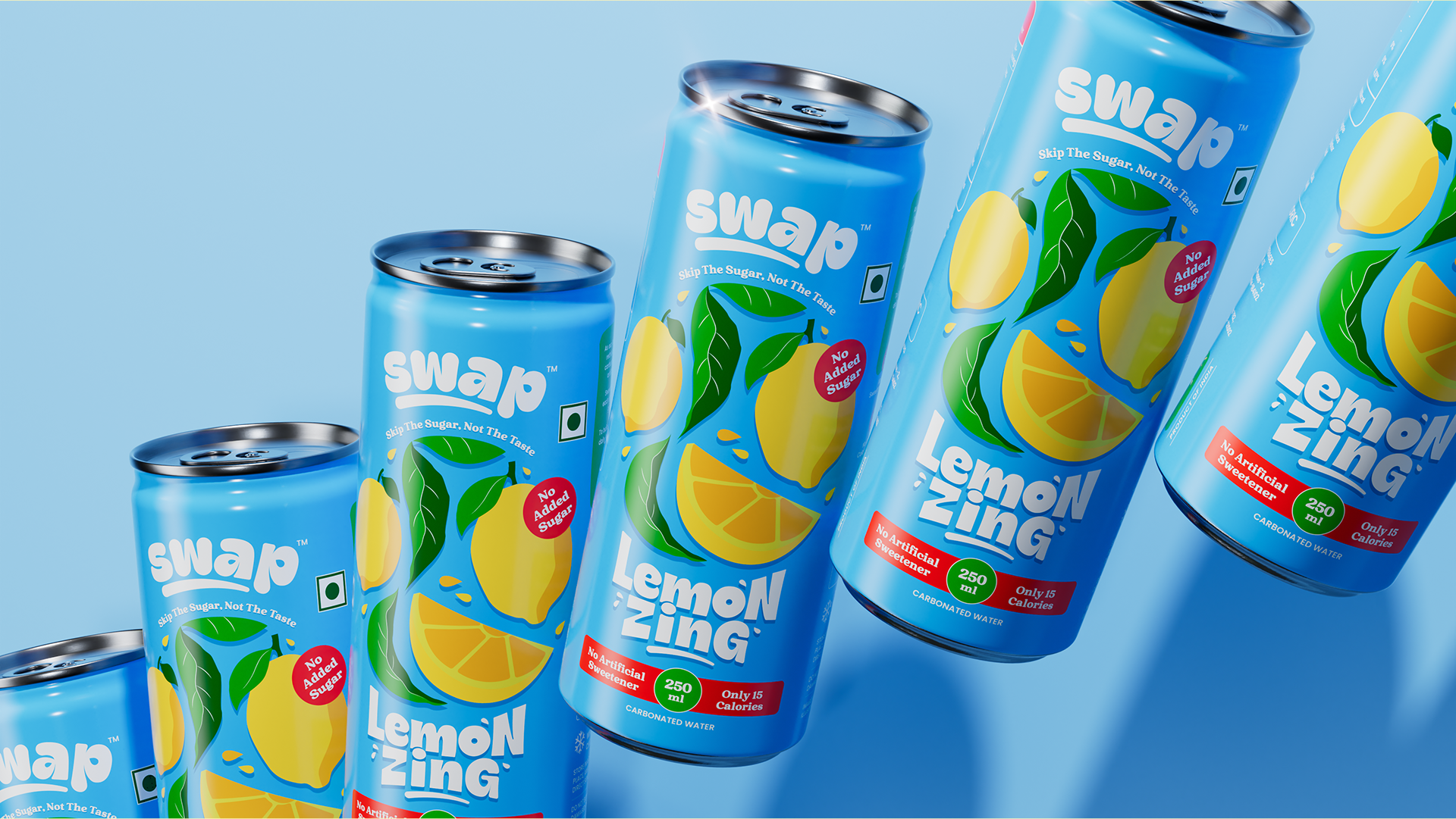 Яркая, выразительная упаковка гарантирует сильное присутствие на полке, сразу транслируя чистый состав, низкое содержание сахара и легкость без чувства вины. Типографика и иллюстрации подчеркивают свежий, авантюрный и ориентированный на здоровье характер бренда, позволяя SWAP выделяться среди конкурентов, которые чрезмерно искусственны. Каждое дизайнерское решение — от динамичного, пузырькового логотипа до насыщенной цветовой палитры — отражает главную миссию бренда: заменяй сахар, но не вкус.