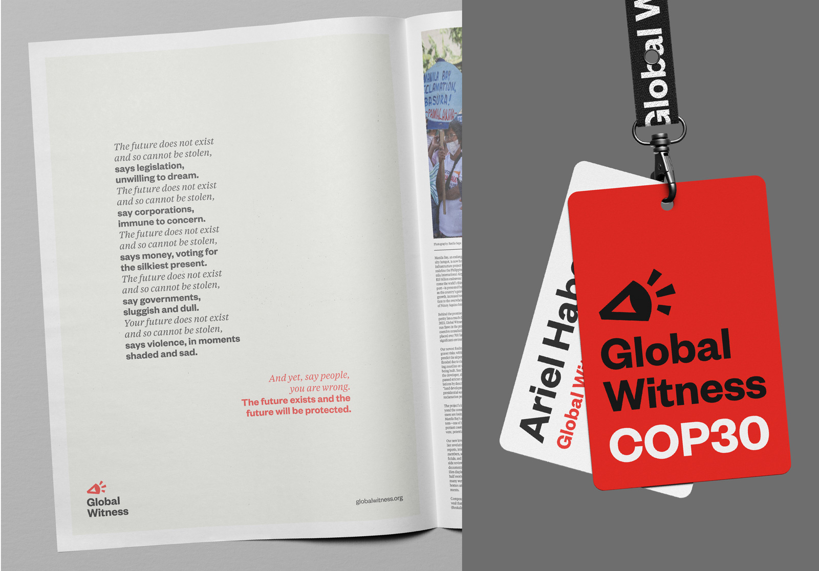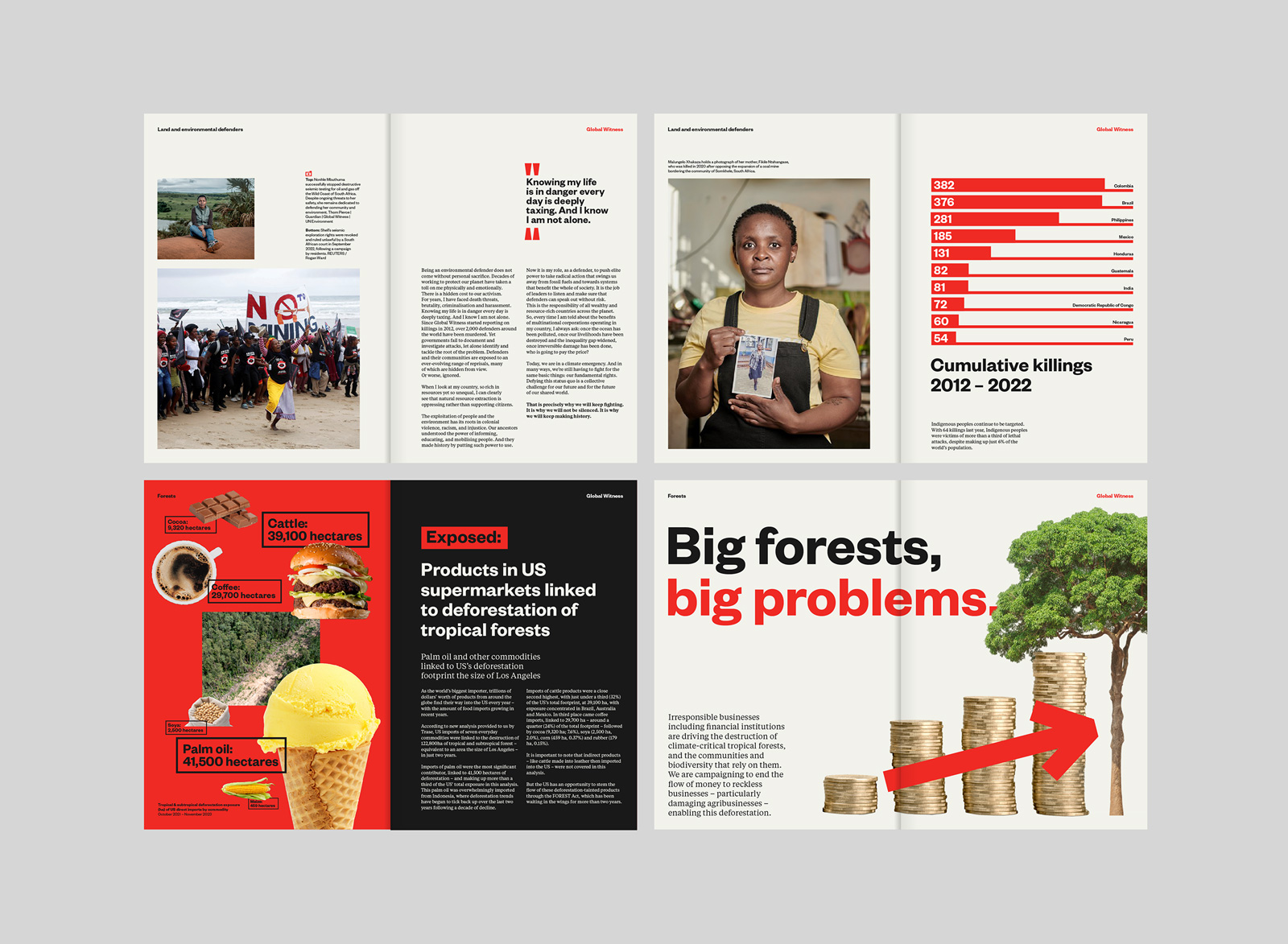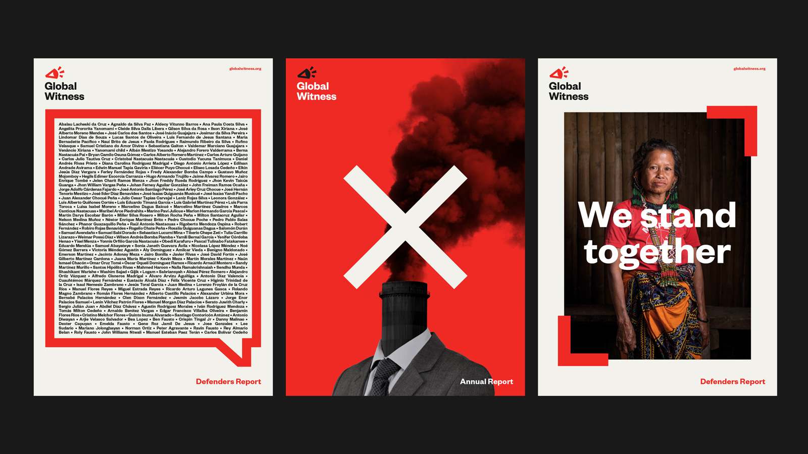 Цветовая палитра, включающая черный, белый и красный цвета, создает четкий и выразительный образ, при этом позволяя материалам кампаний Global Witness — от текстов и статистики до изображений людей, находящихся на передовой климатического кризиса — оставаться в центре внимания.