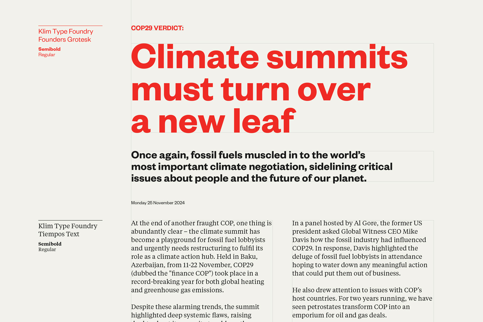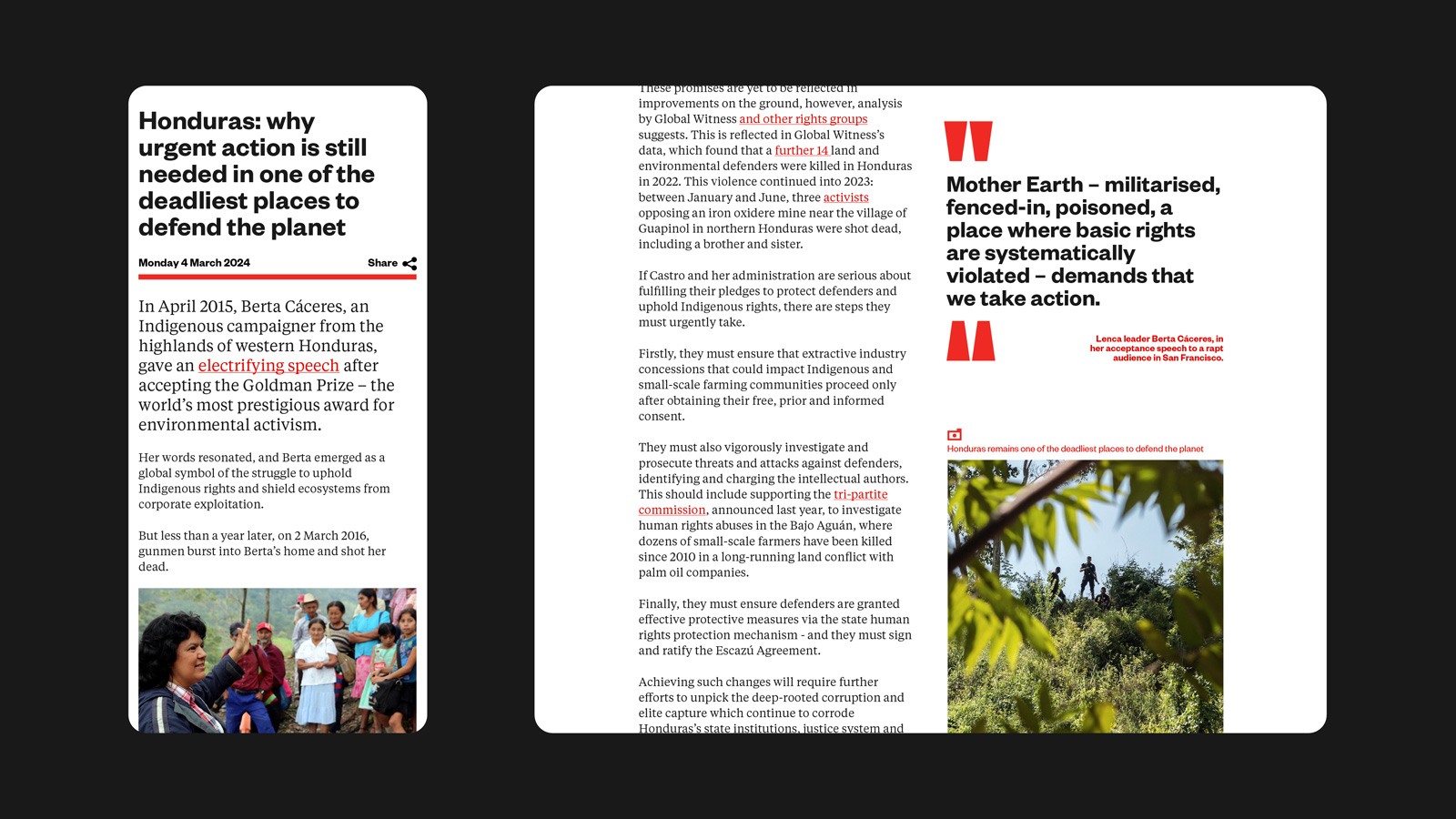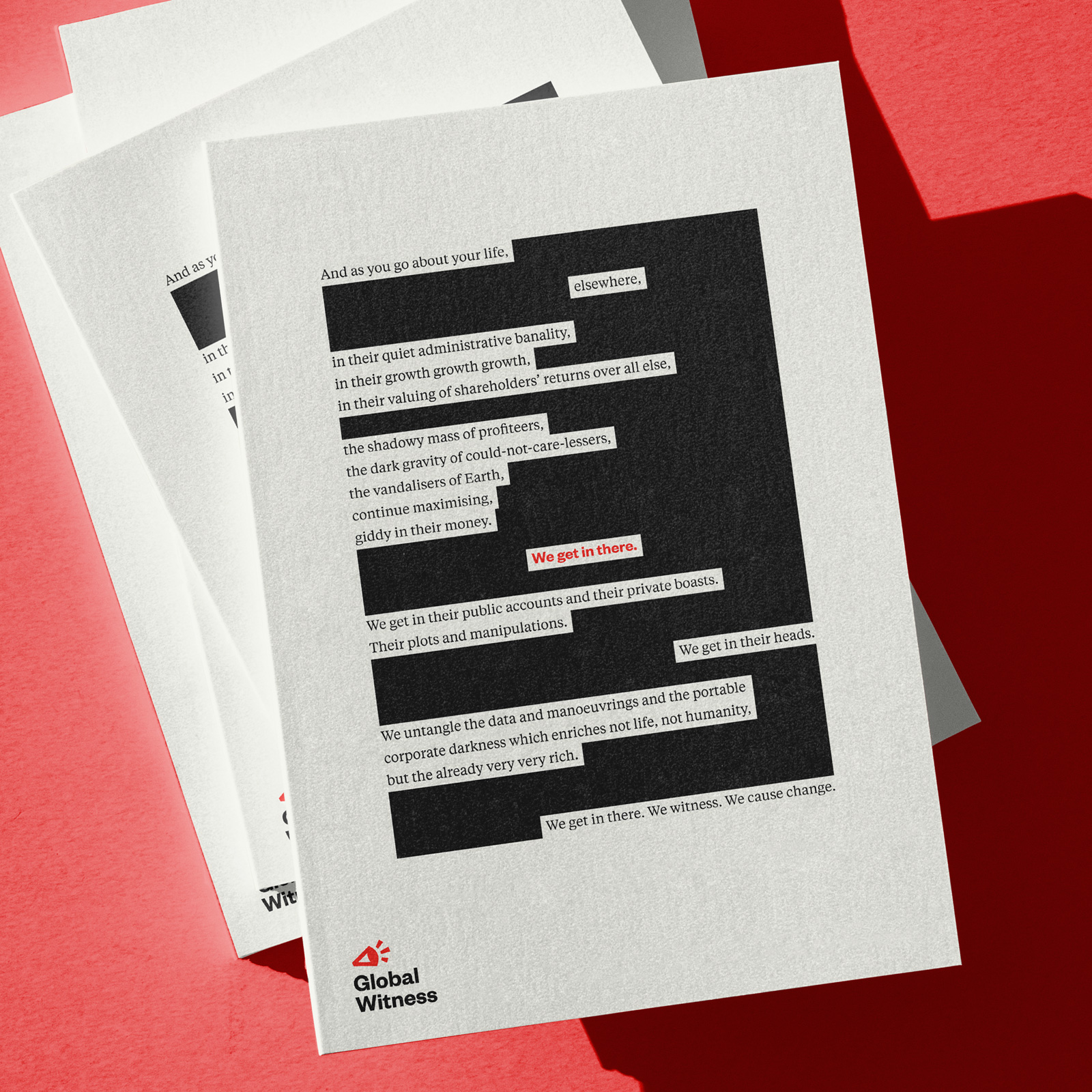Цветовая палитра, включающая черный, белый и красный цвета, создает четкий и выразительный образ, при этом позволяя материалам кампаний Global Witness — от текстов и статистики до изображений людей, находящихся на передовой климатического кризиса — оставаться в центре внимания.