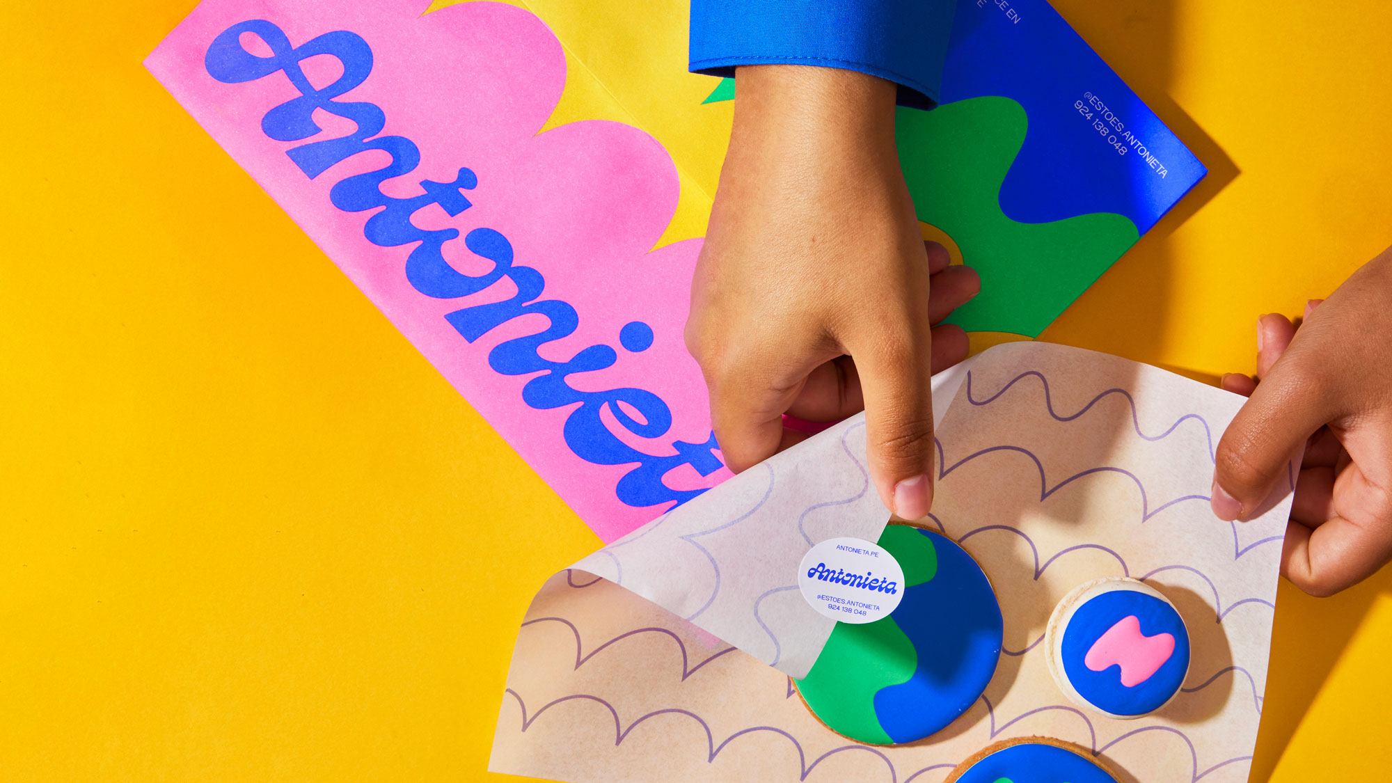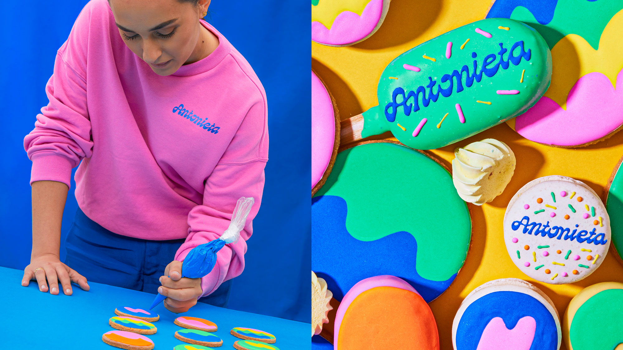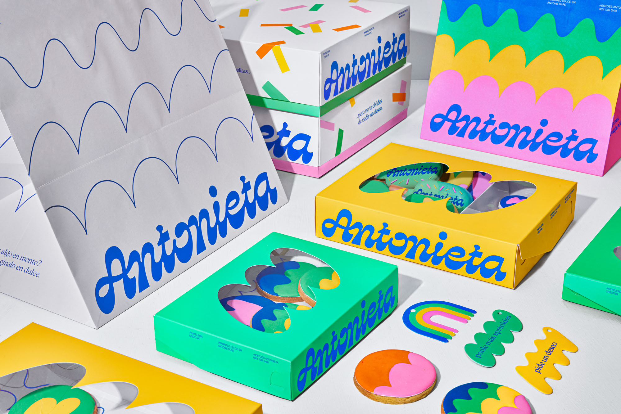 Antonieta — креативный кондитерский бренд, который спустя семь лет решил кардинально обновить свою визуальную айдентику, сделав её более мощной и весёлой. Вдохновившись текстурами кремов и формами кондитерских мешков, команда ESTUDIO PALOMA разработала леттеринг с мягкими и волнистыми линиями. Также была создана графическая система, органично сочетающаяся с брендом и включающая уникальные, запоминающиеся элементы, навеянные сладким миром.
