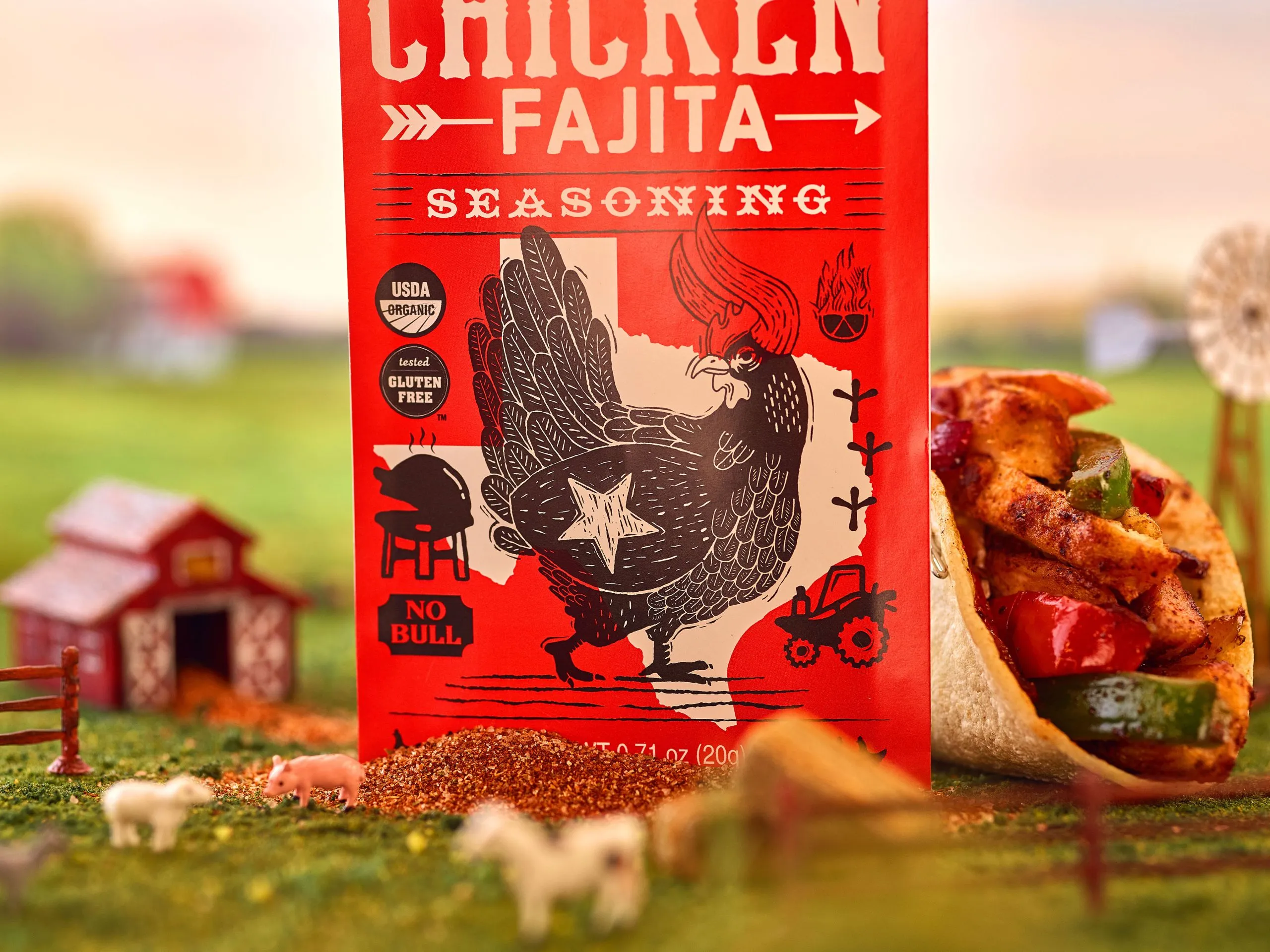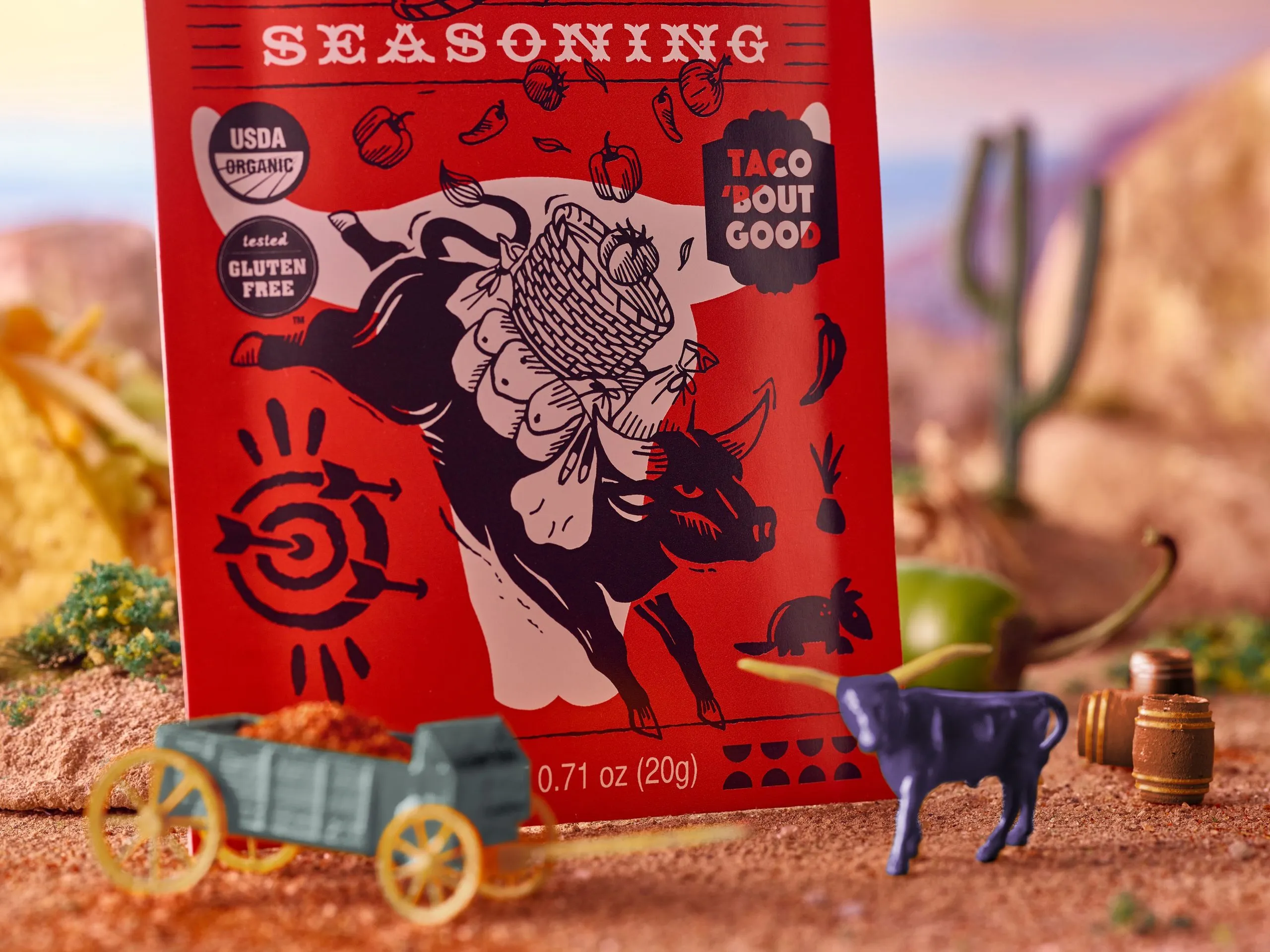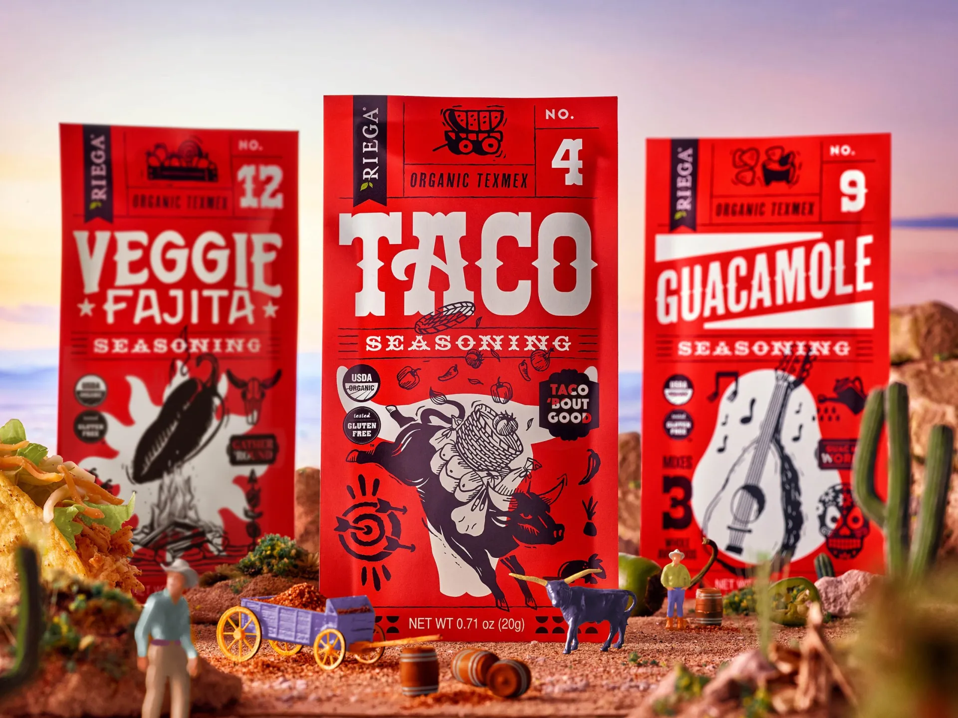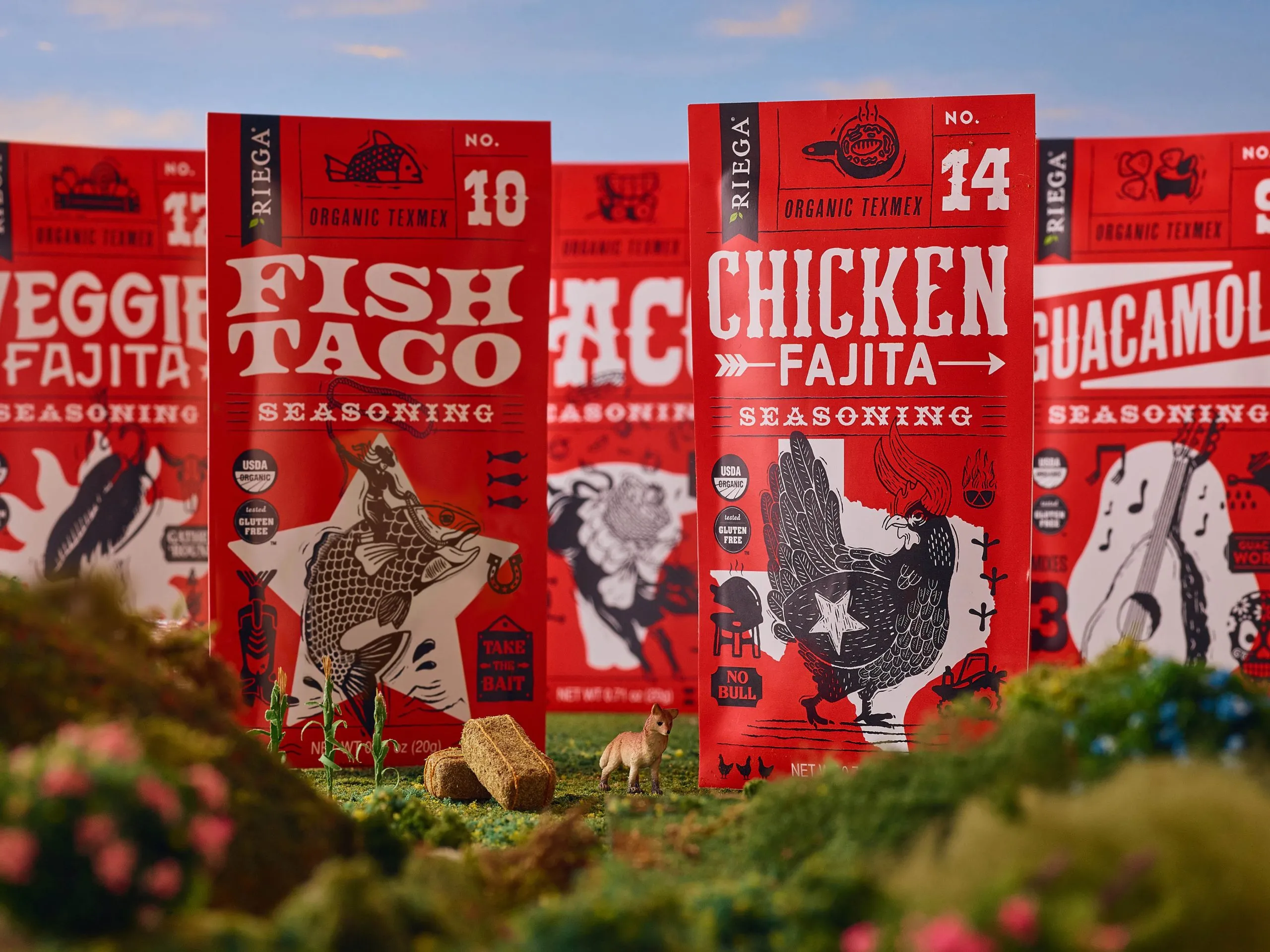 Яркая, дерзкая и безапелляционно Tex-Mex — обновлённая упаковка приправ Riega Foods от Whiskey Design буквально взрывается энергией. Пылающий красный, игривая типографика и иллюстрированные мотивы — такие как авокадо-гитары, разъярённые быки и перцы — создают атмосферу ручной работы с современным акцентом. Каждый пакетик имеет свой номер и цветовую маркировку, обеспечивая визуальную чёткость и единый стиль бренда. Эффектные слоганы и знак USDA Organic добавляют доверия и индивидуальности. Упаковка эффектно передаёт обещание вкуса «больше, чем Техас», моментально привлекая внимание на полке и создавая ощущение, будто вы уже в самом эпицентре фиесты.