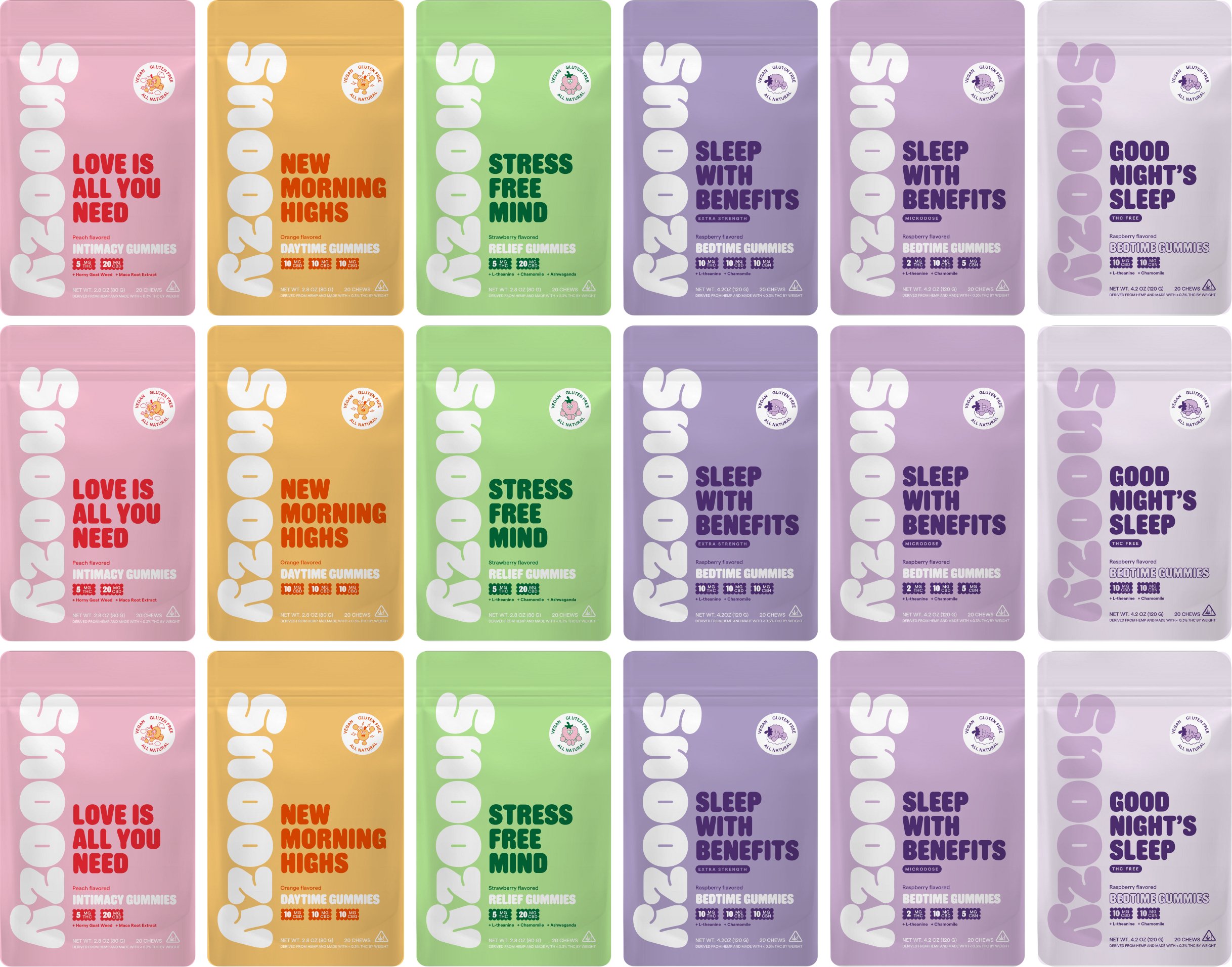 Крупная и округлая типографика, мягкие пастельные тона выделяют Snoozy среди конкурентов на полке. Все упаковки выполнены в едином стиле, что способствует узнаваемости бренда и создает ощущение целостной линейки продуктов.
