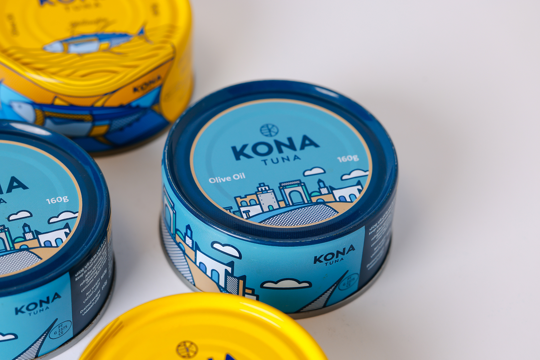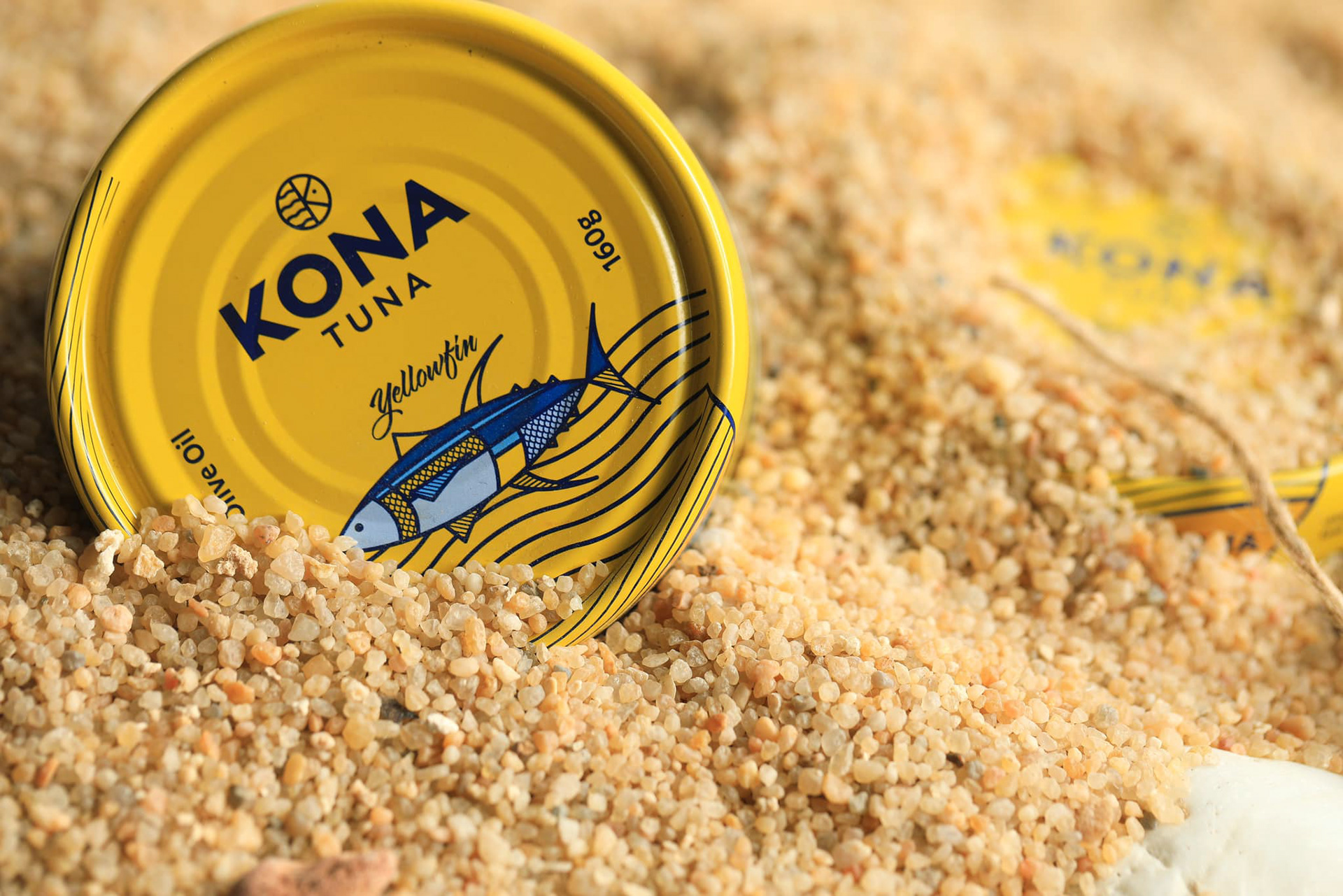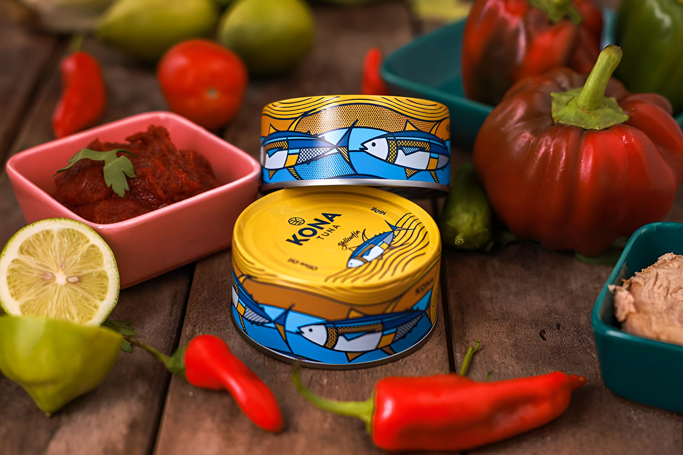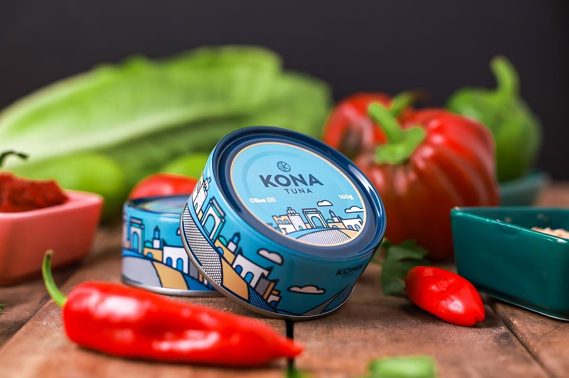 Первоначально компания Kona Tuna обратилась к дизайнеру Mike Karolos с просьбой разработать логотип и упаковку. То, что начиналось с нескольких макетов, в итоге привело к созданию всей фирменной айдентики бренда. Основной задачей было создать уникальный, современный, смелый и легко узнаваемый логотип. Логомарк выполнен в круглом формате, как и большинство их консервных банок, и включает в себя море, букву «K» из названия Kona, а также голову рыбы. Логотип отличается чистотой и выразительностью. Одной из причин, по которой дизайнер Mike Karolos был выбран для работы, стал его иллюстративный стиль, который идеально подошел для создания яркой и запоминающейся упаковки. В рамках проекта была разработана лимитированная серия консервов, затем упаковка для тунца Yellowfin, а позже — для сардин.