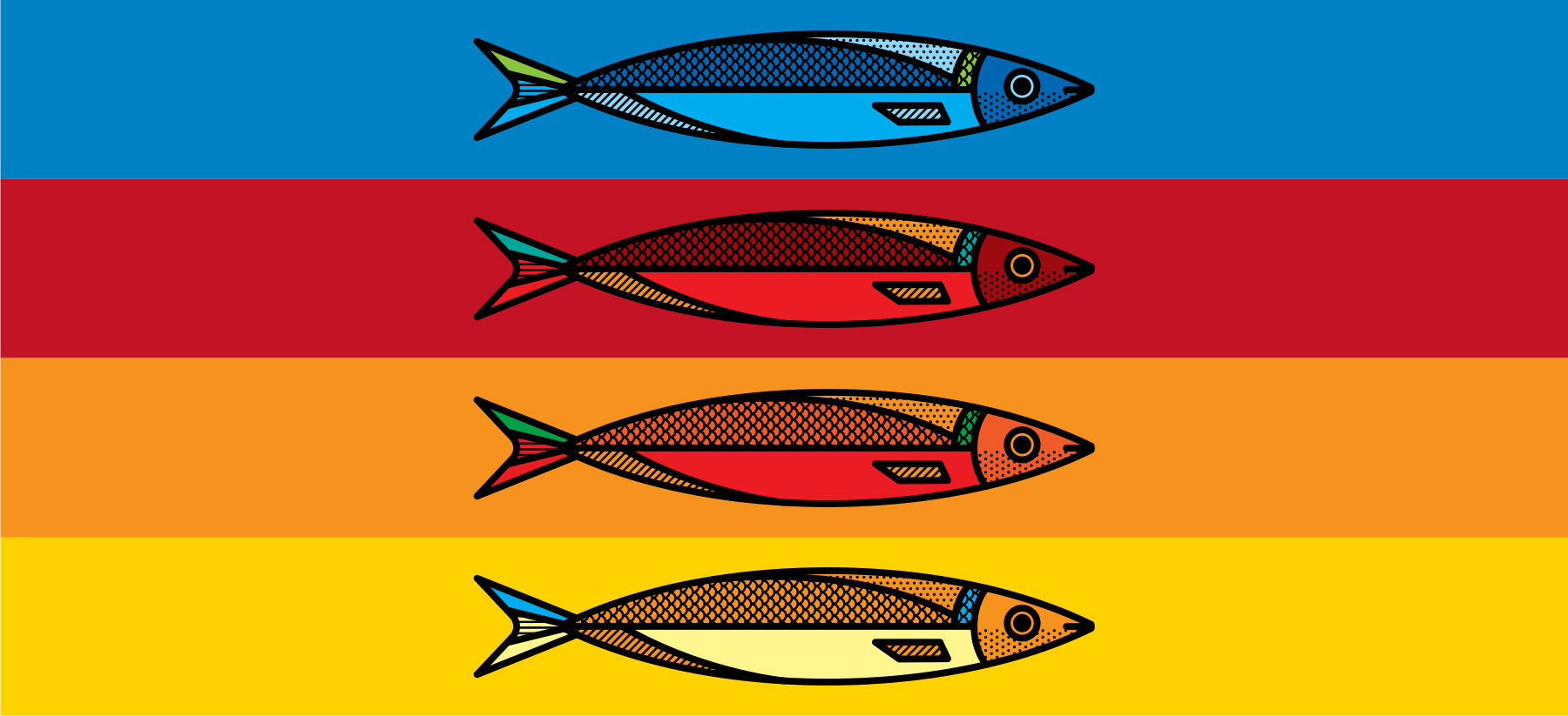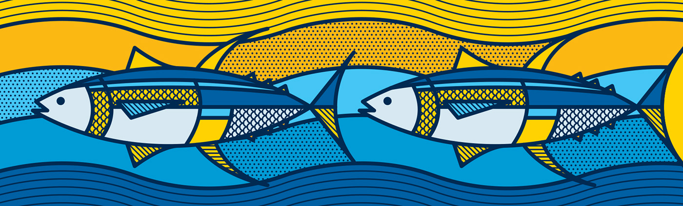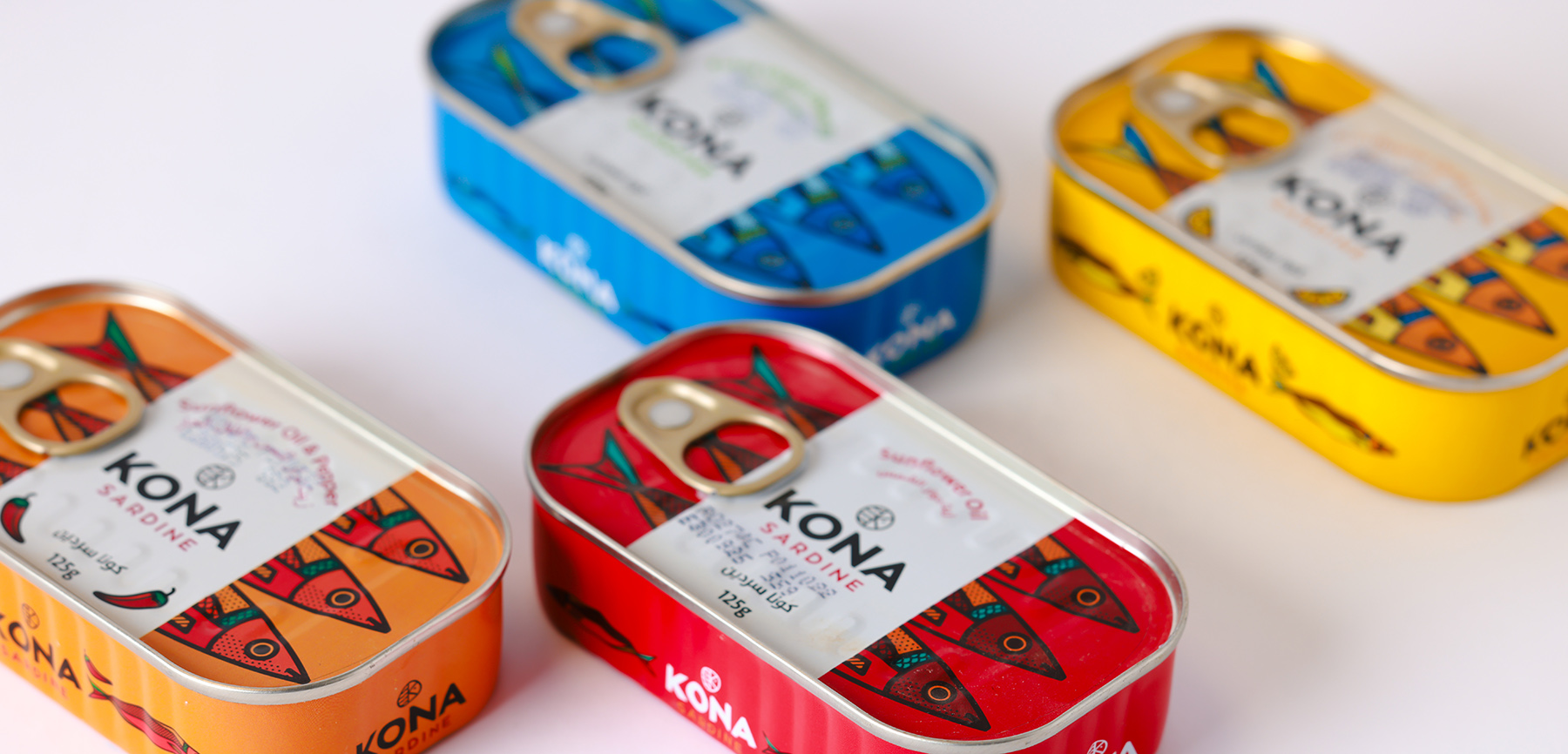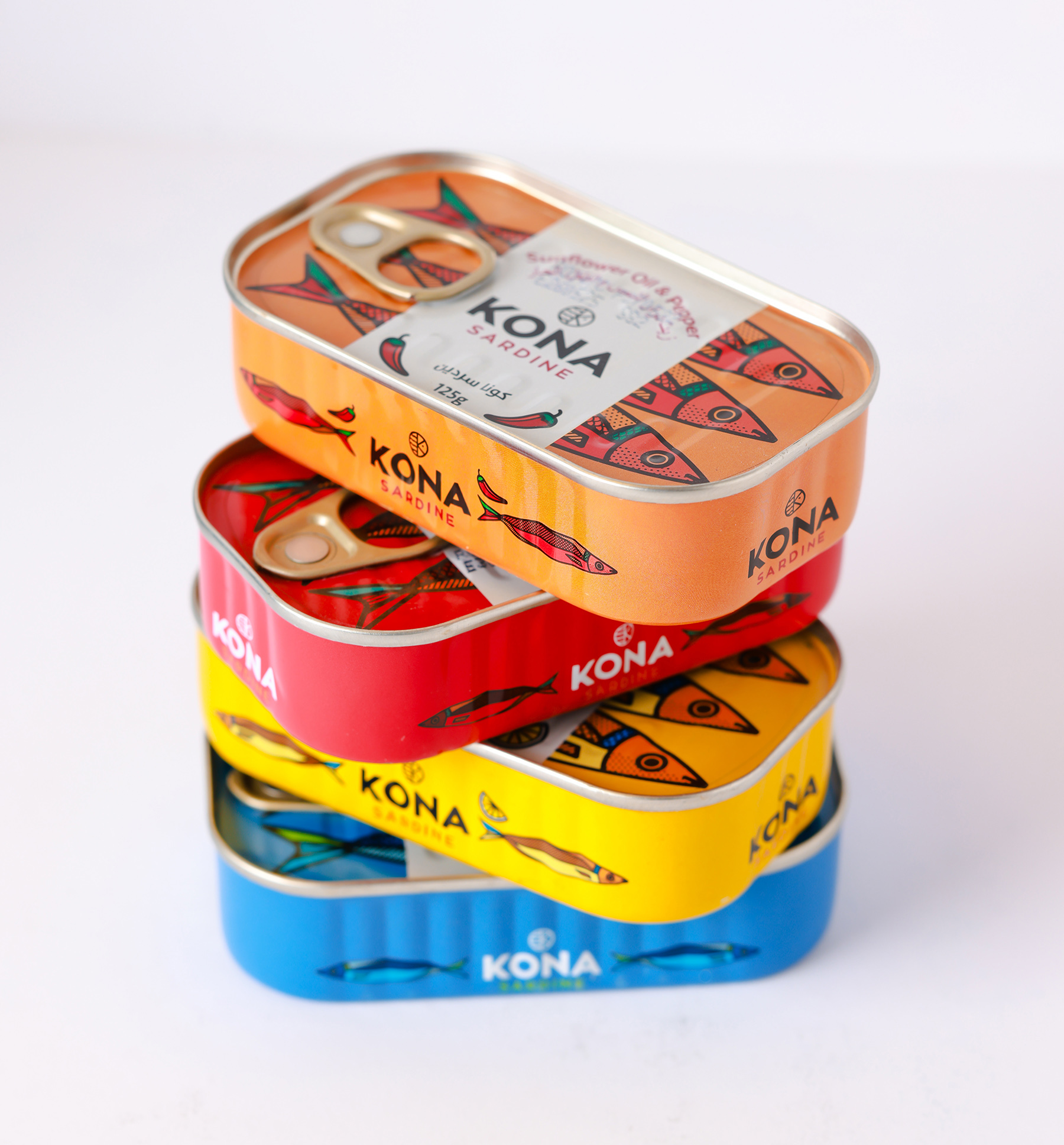 Первоначально компания Kona Tuna обратилась к дизайнеру Mike Karolos с просьбой разработать логотип и упаковку. То, что начиналось с нескольких макетов, в итоге привело к созданию всей фирменной айдентики бренда. Основной задачей было создать уникальный, современный, смелый и легко узнаваемый логотип. Логомарк выполнен в круглом формате, как и большинство их консервных банок, и включает в себя море, букву «K» из названия Kona, а также голову рыбы. Логотип отличается чистотой и выразительностью. Одной из причин, по которой дизайнер Mike Karolos был выбран для работы, стал его иллюстративный стиль, который идеально подошел для создания яркой и запоминающейся упаковки. В рамках проекта была разработана лимитированная серия консервов, затем упаковка для тунца Yellowfin, а позже — для сардин.