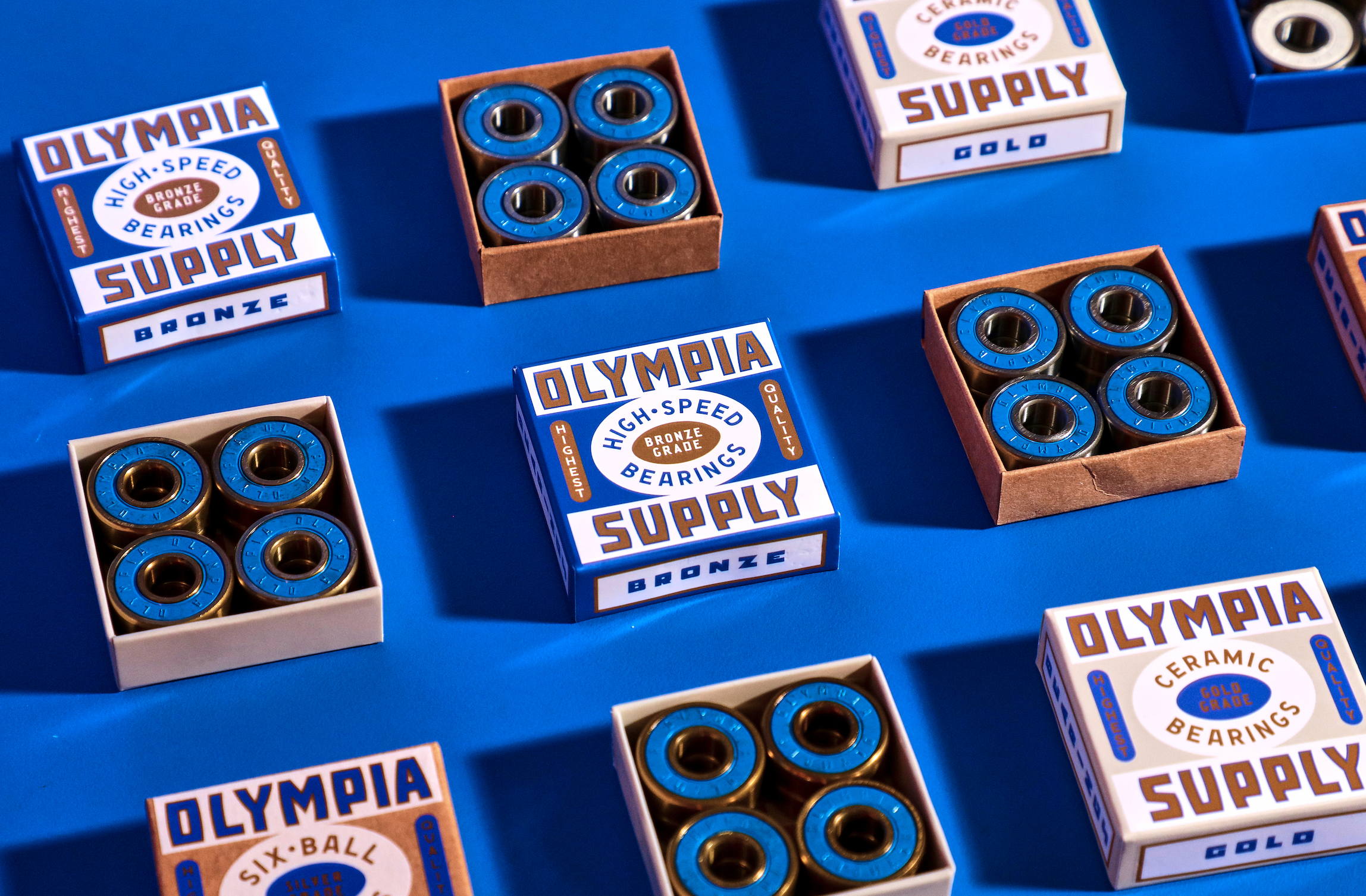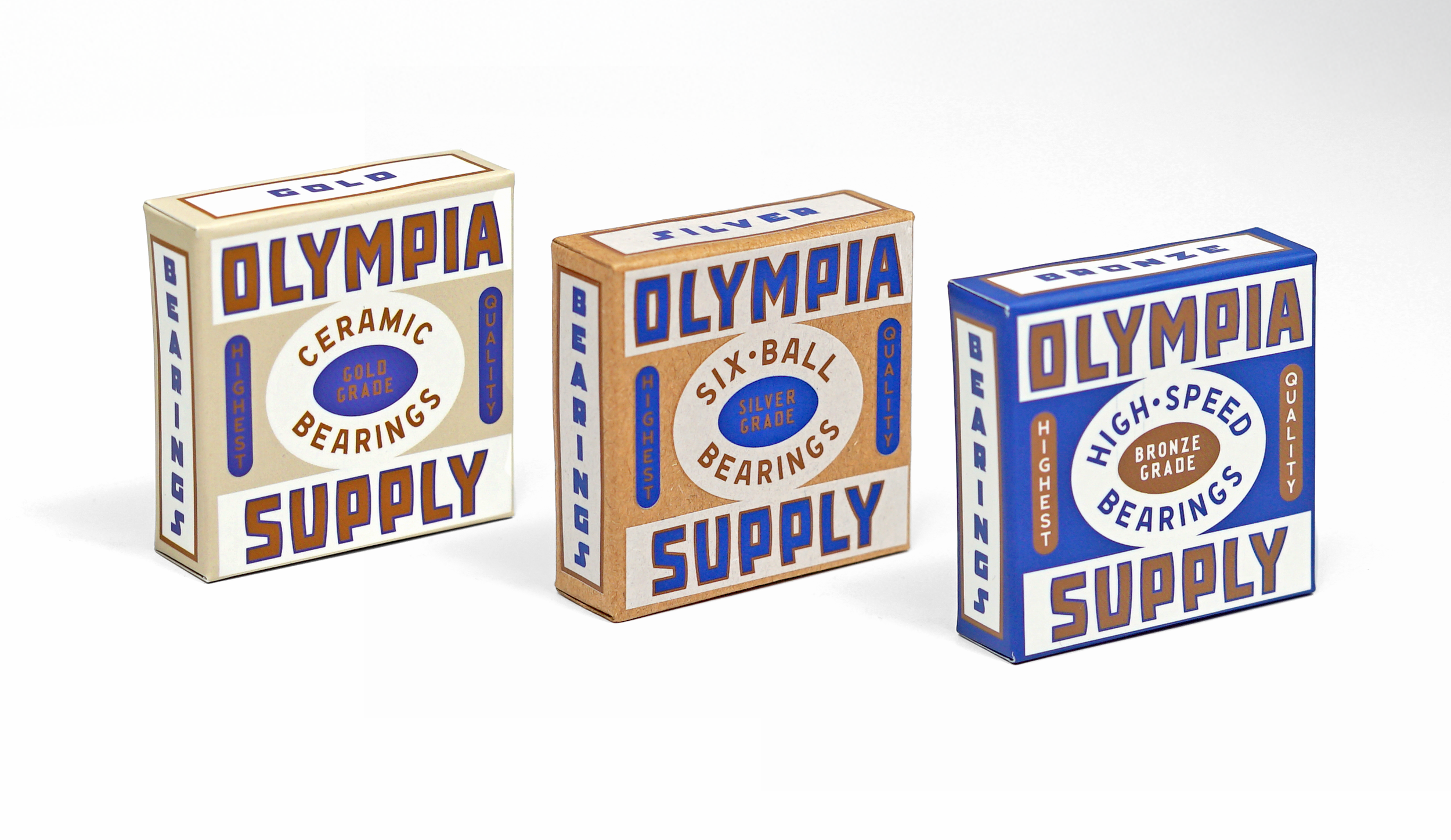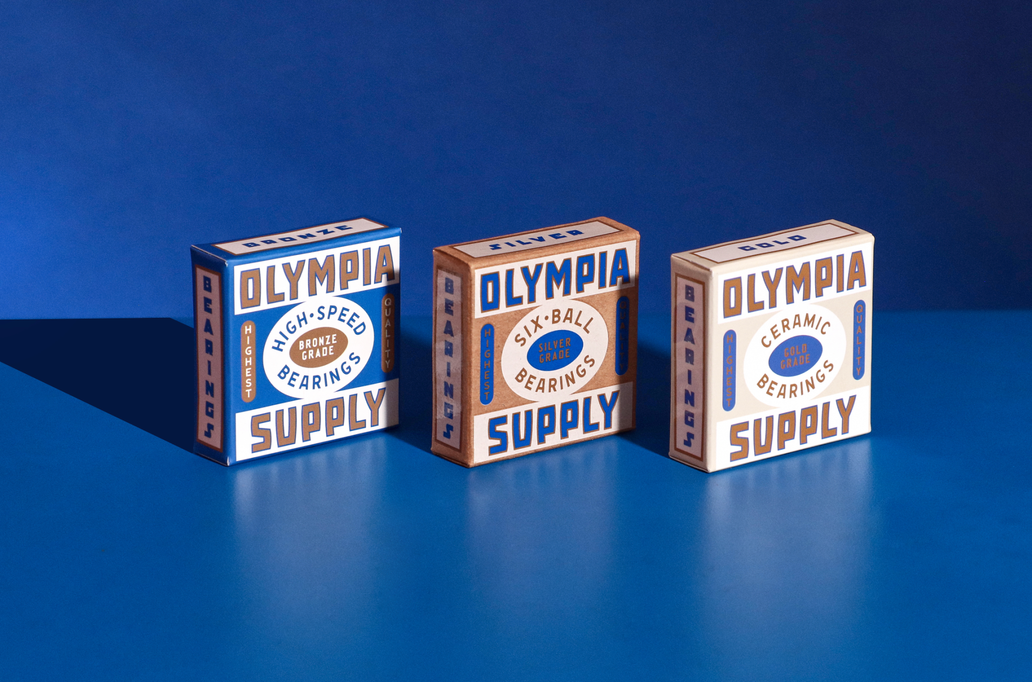 Студия разработала упаковки для керамических подшипников Olympia Supply. Дизайн словно портал в прошлое, безошибочно отсылая к эстетике 70-х годов. Упаковка подшипников Olympia Supply – это не просто средство хранения, а настоящий манифест стиля ушедшей эпохи, смело играющий с цветами, шрифтами и графическими элементами.