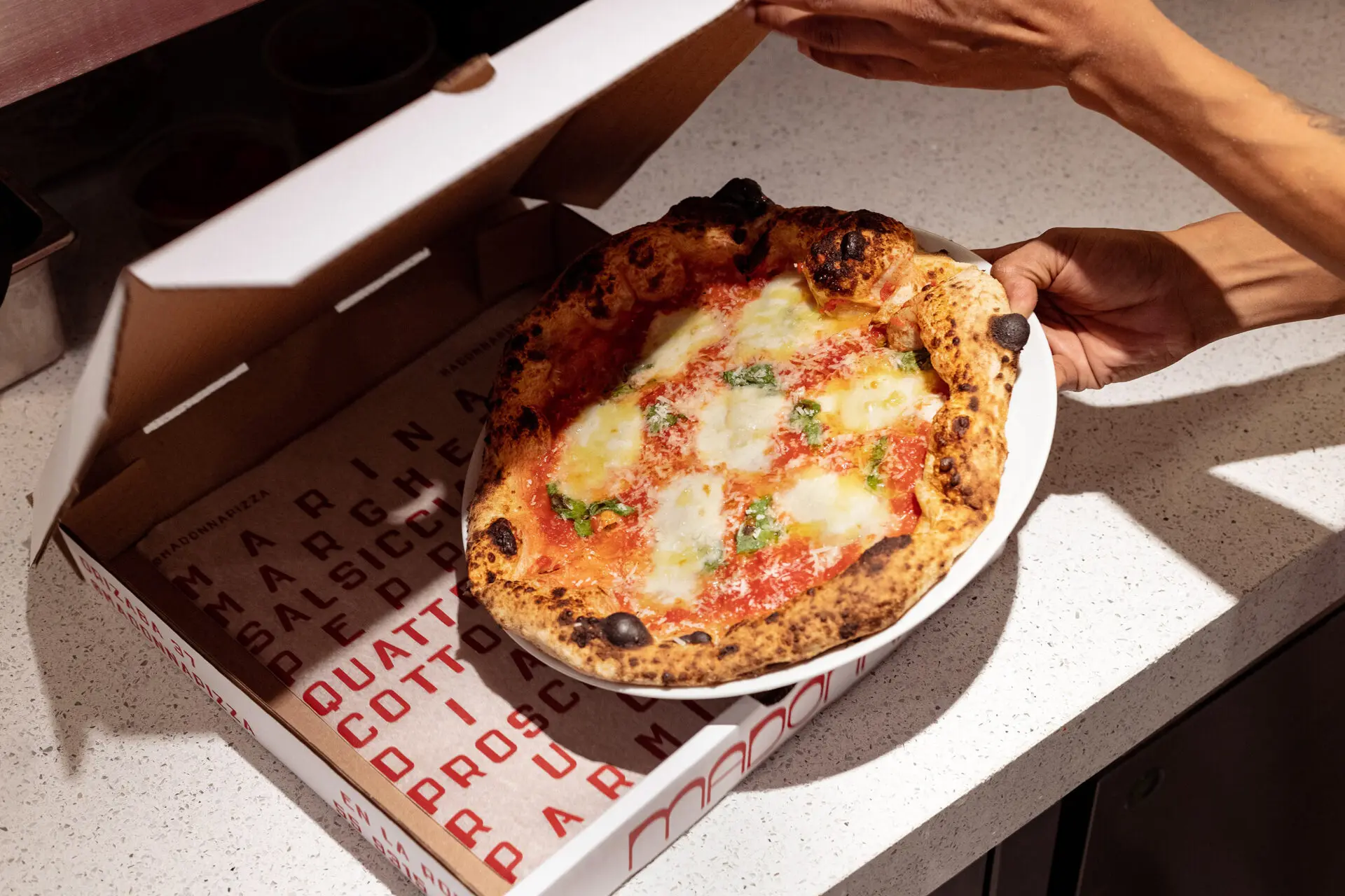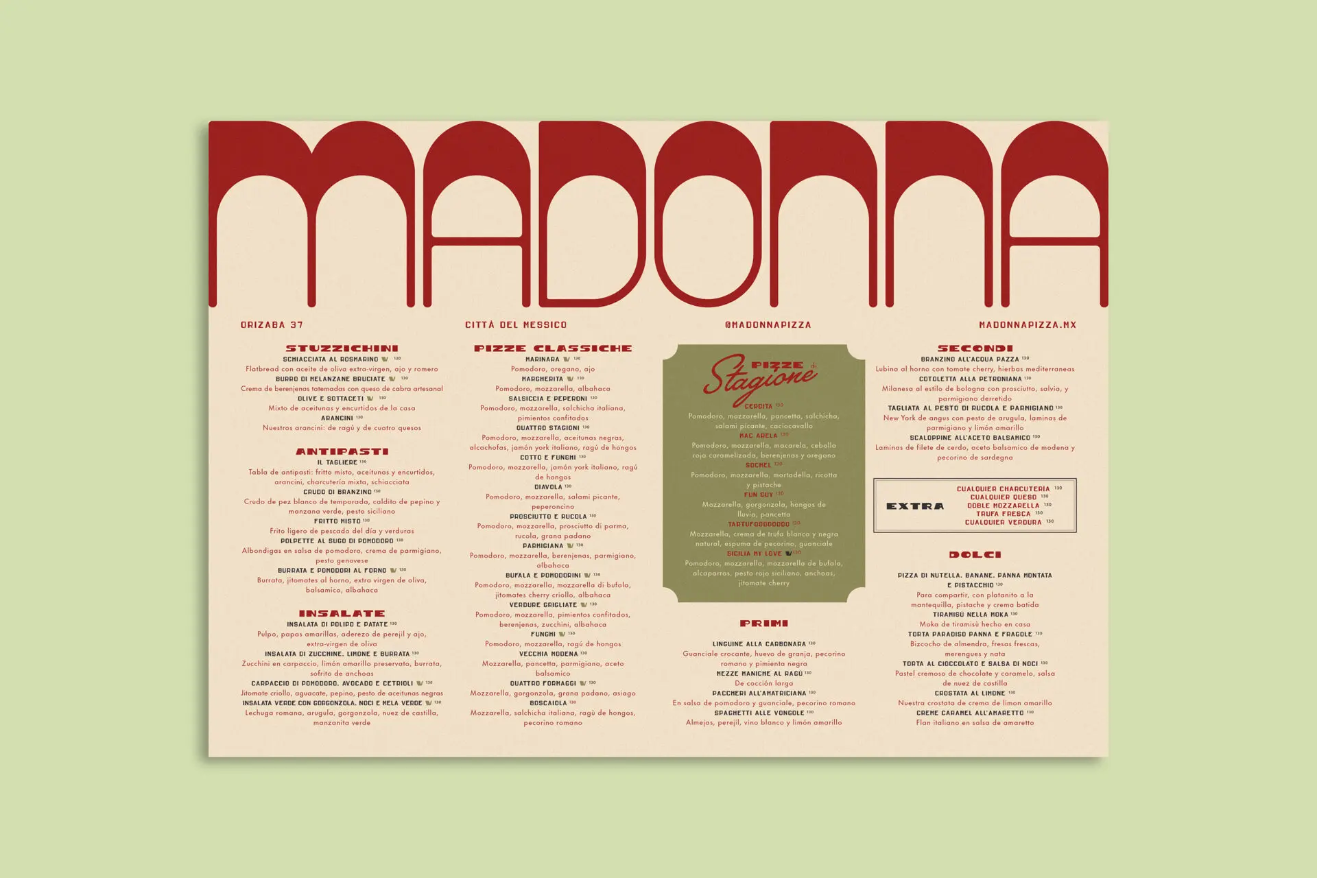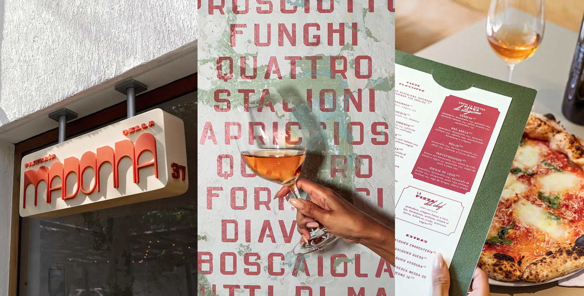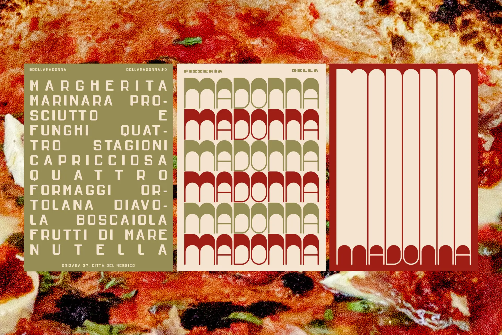 Pizzería della Madonna черпает вдохновение в архитектуре соборов и церквей — её визуальная система отсылает к колоннам, аркам и несущим конструкциям, лежащим в основе классических религиозных зданий. При этом коммуникация остаётся гибкой и отзывчивой, отражая пластичность и эластичность главного ингредиента пиццы — теста. Повторы, сочетание красного и зелёного цветов, а также непрямая отсылка к религиозной символике формируют айдентику, легко адаптирующуюся к любым поверхностям.