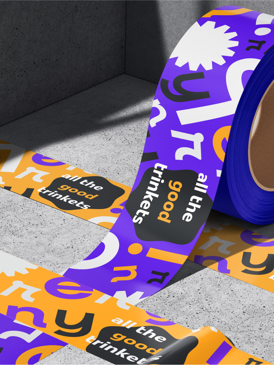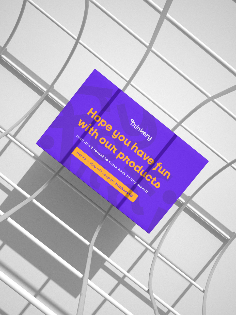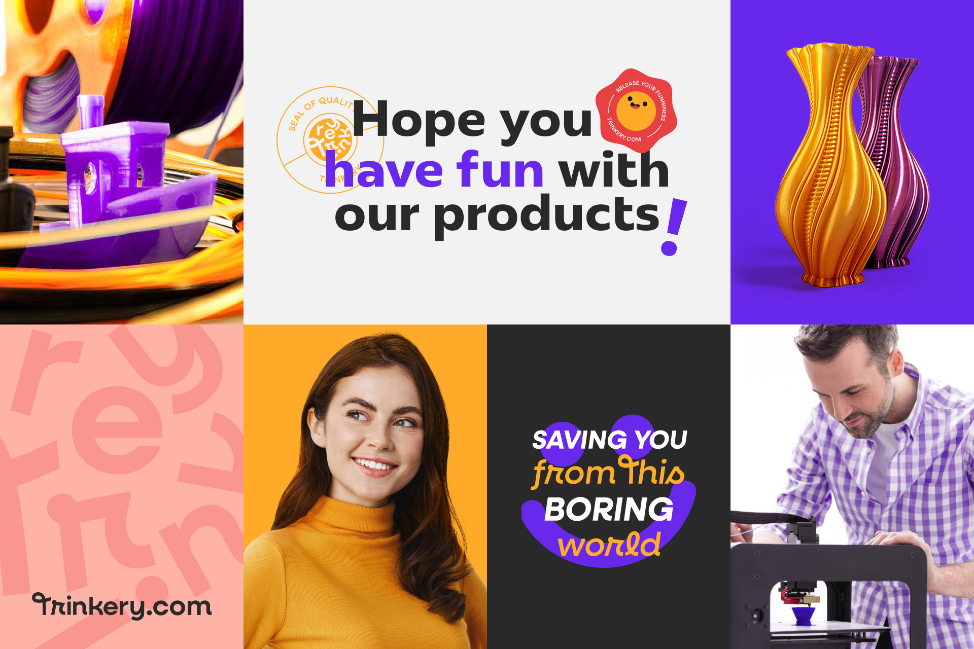 Голос бренда: Непринуждённый, дружелюбный и увлечённый. Язык простой и понятный, создающий атмосферу лёгкости и вовлечения. Trinkery стремится говорить весело и увлекательно, отражая свою суть — бренд уникальных, персонализированных и чуть-чуть беззаботных продуктов.