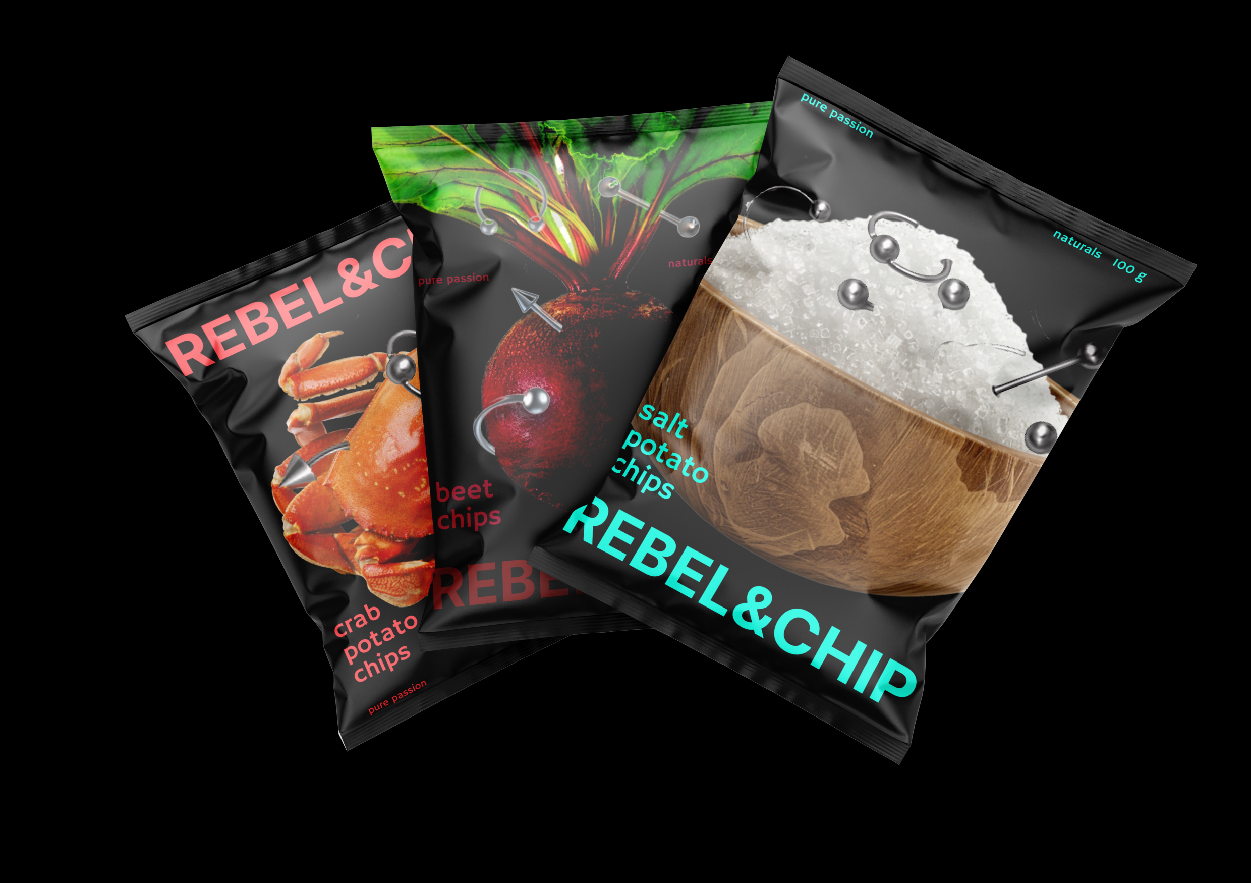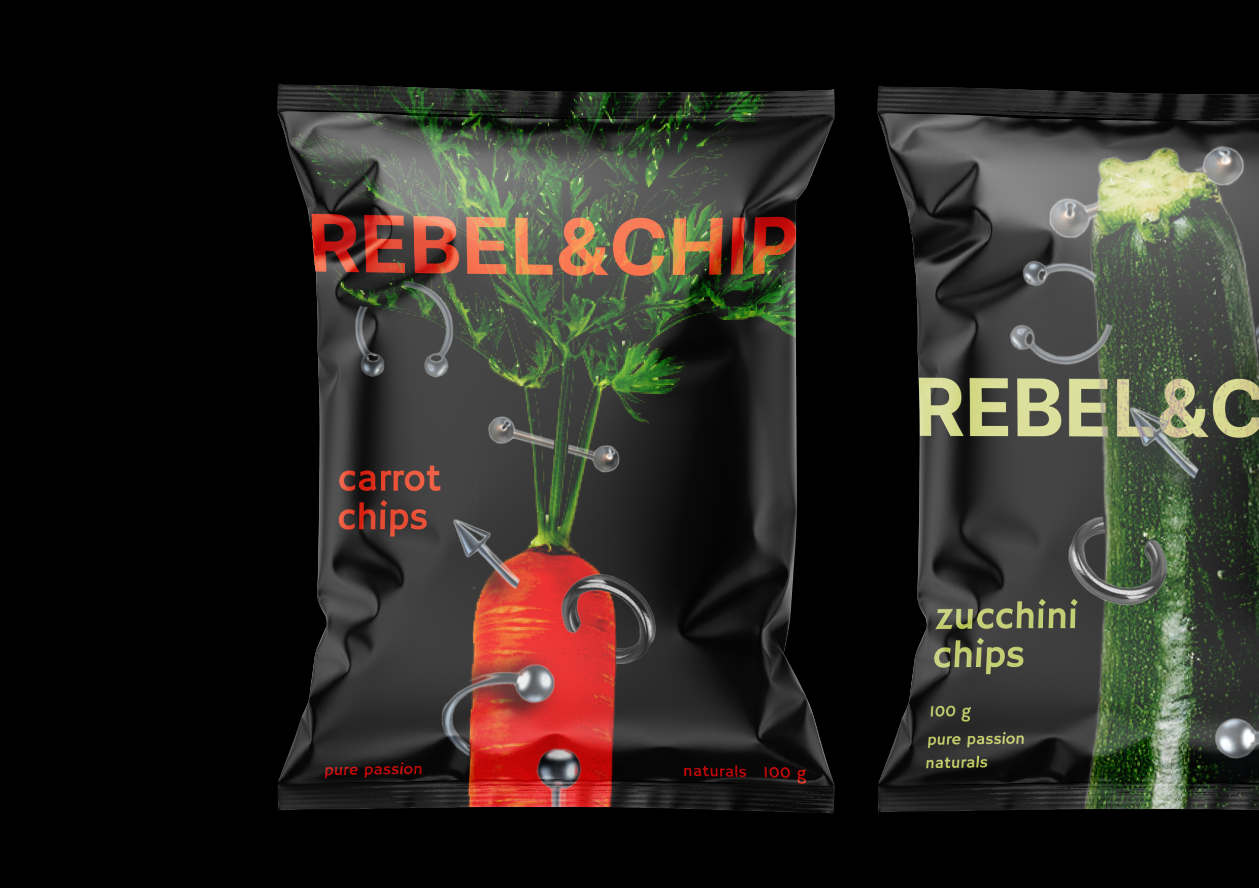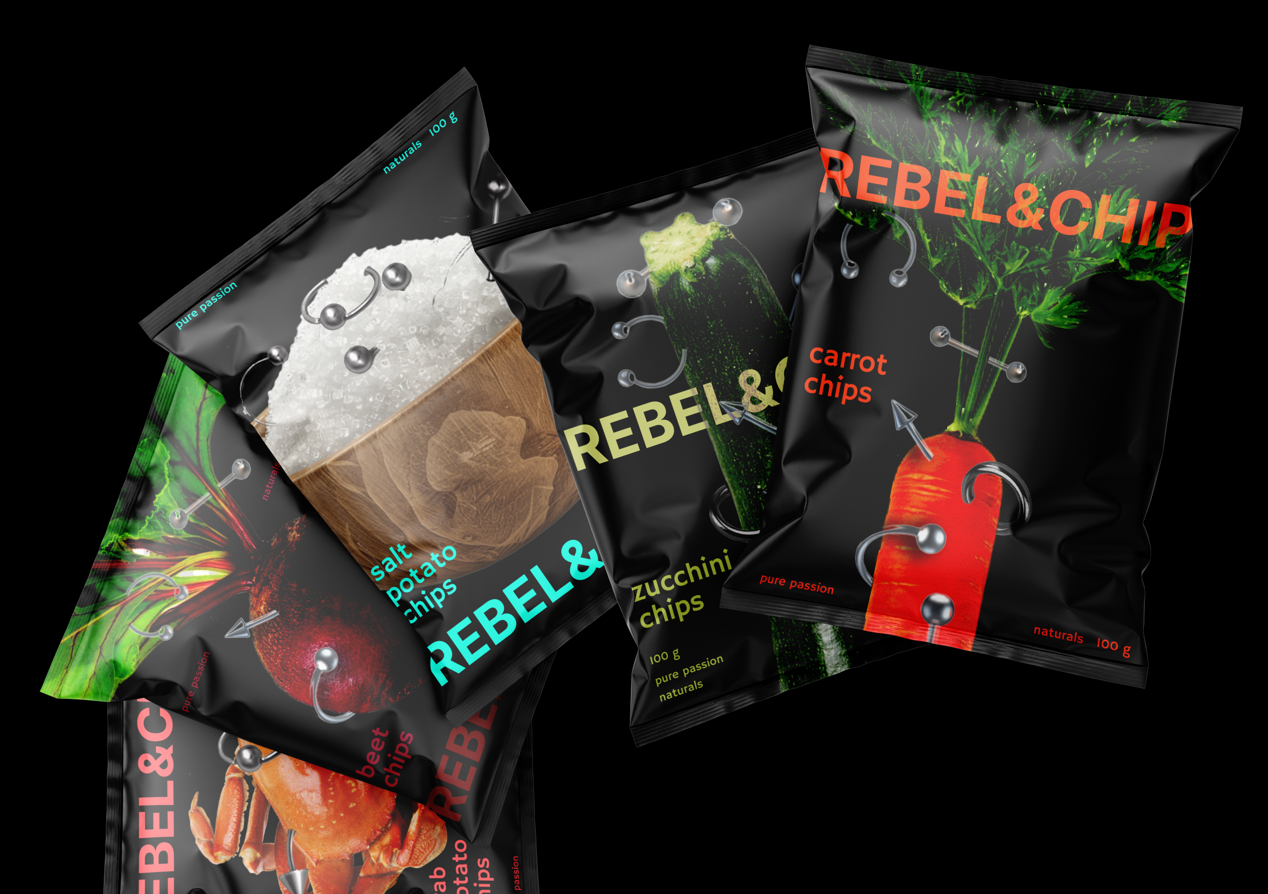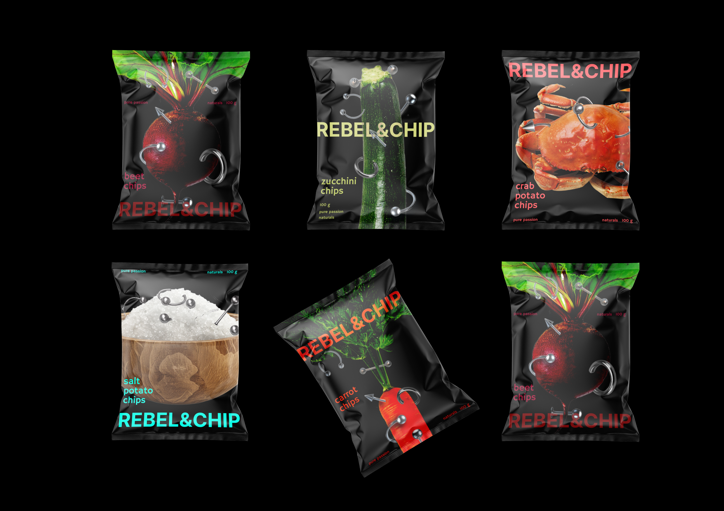 REBEL&CHIP визуально транслирует этот внутренний протест и стремление к свободе. На упаковках изображены ингредиенты с пирсингом — неожиданный, ироничный элемент, который делает бренд заметным на полке и вызывает улыбку у аудитории.