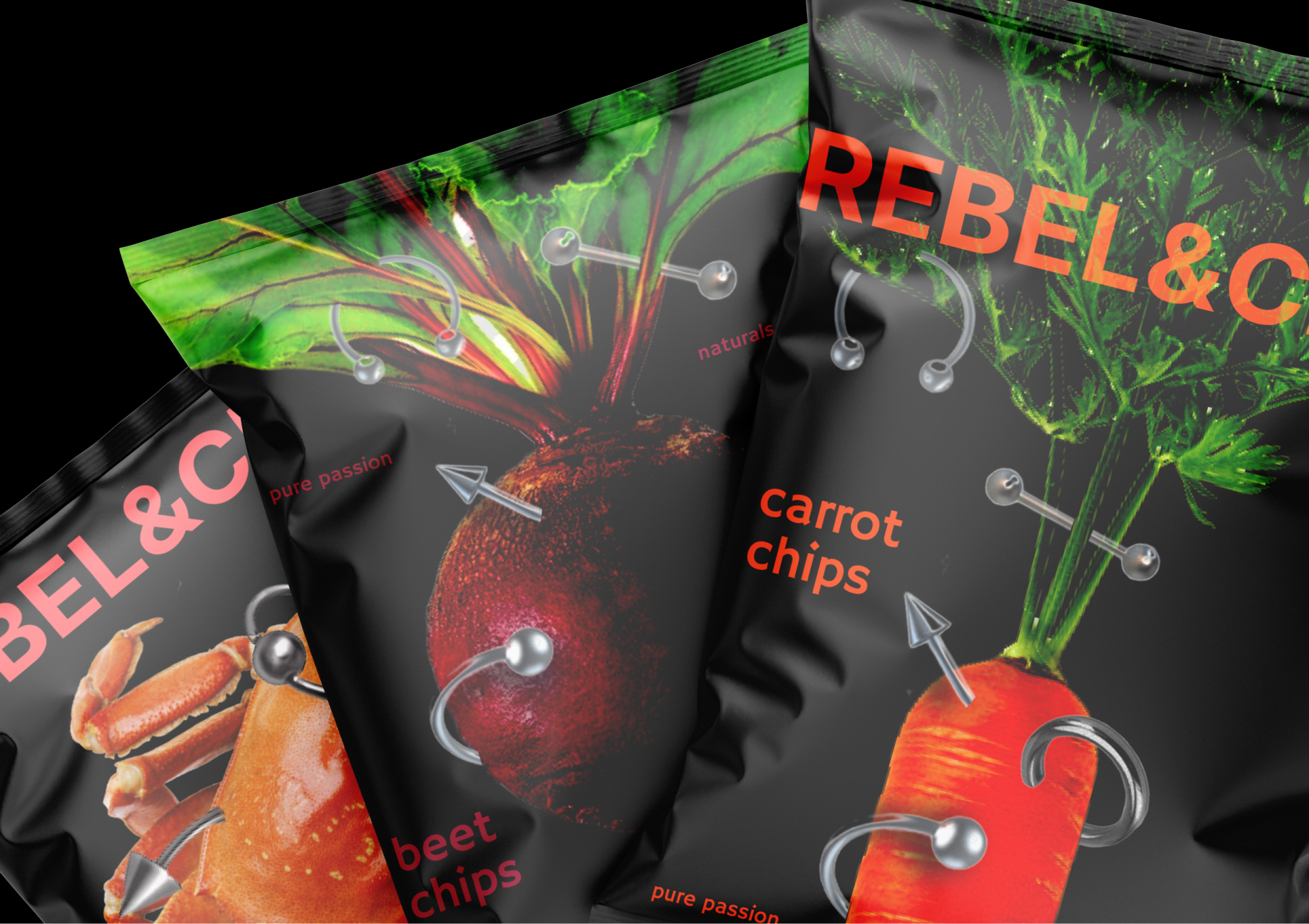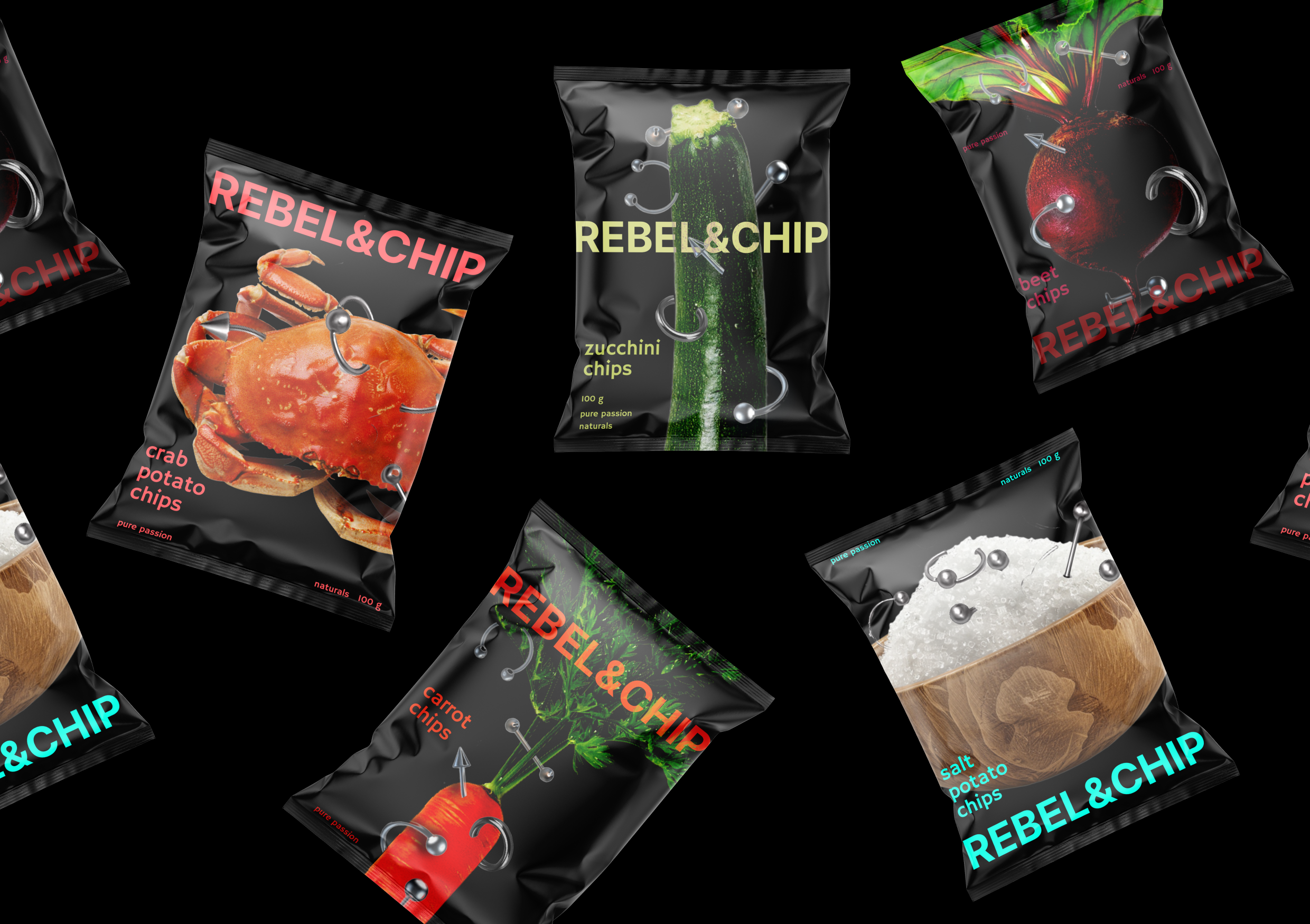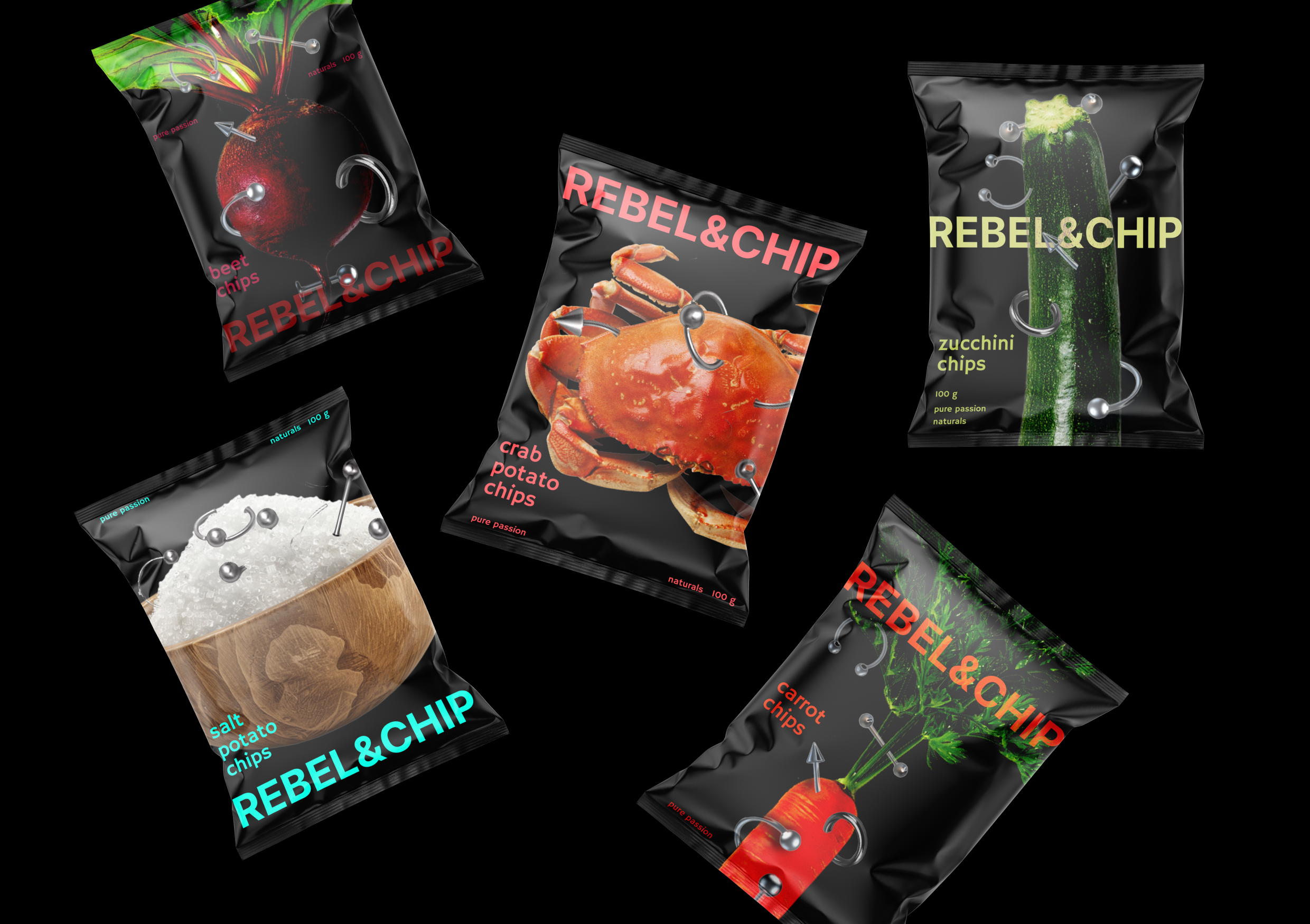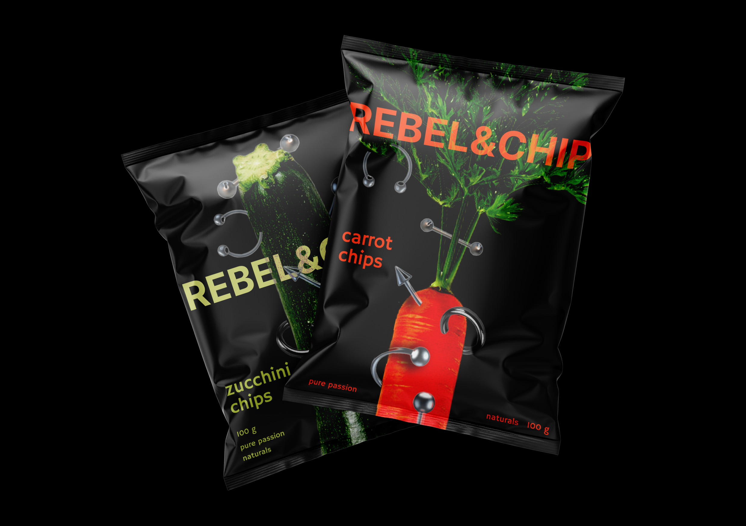 REBEL&CHIP визуально транслирует этот внутренний протест и стремление к свободе. На упаковках изображены ингредиенты с пирсингом — неожиданный, ироничный элемент, который делает бренд заметным на полке и вызывает улыбку у аудитории.