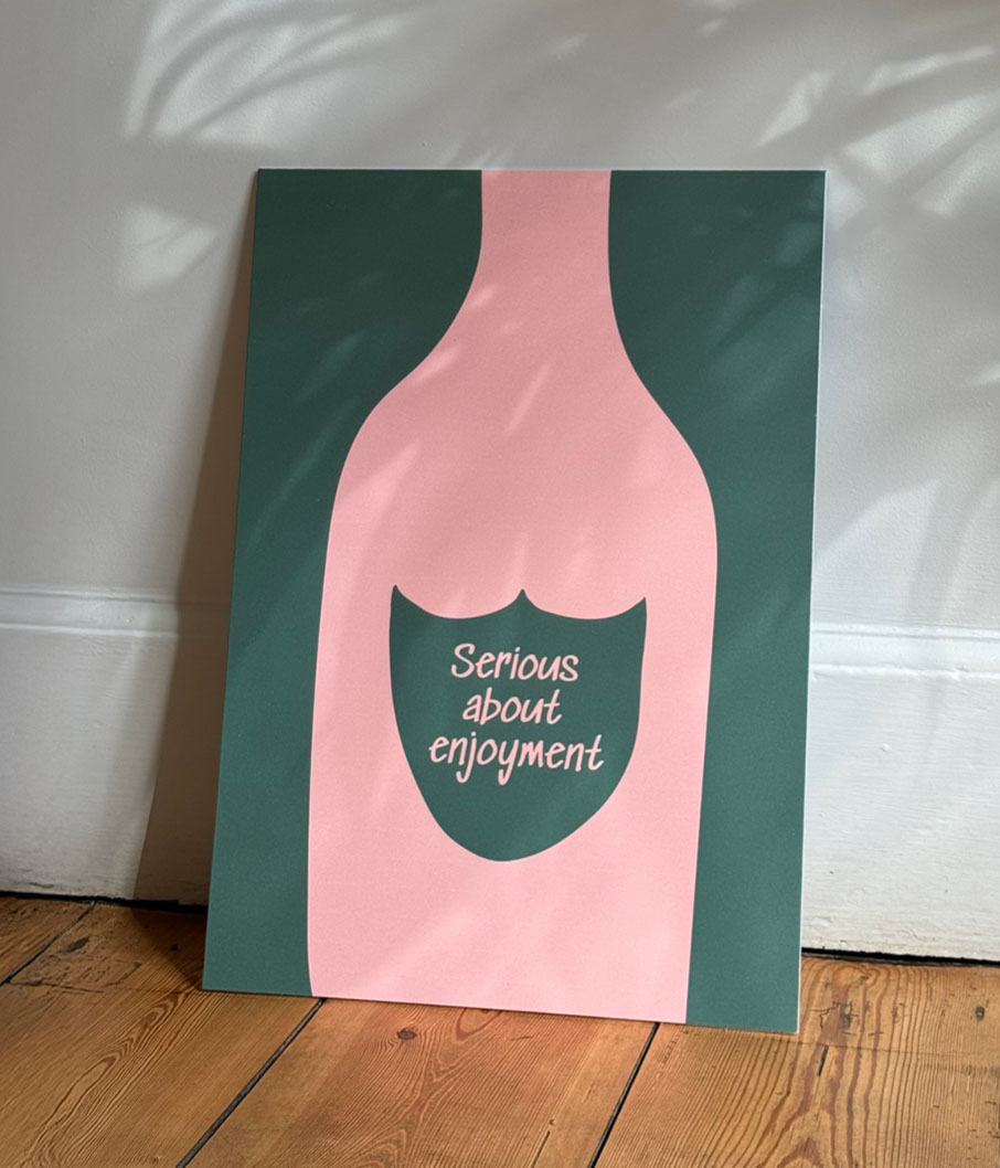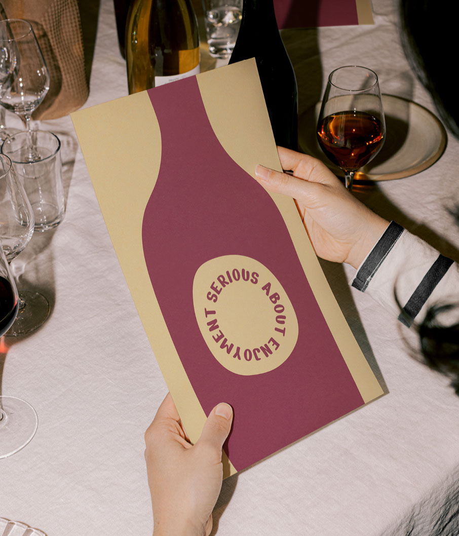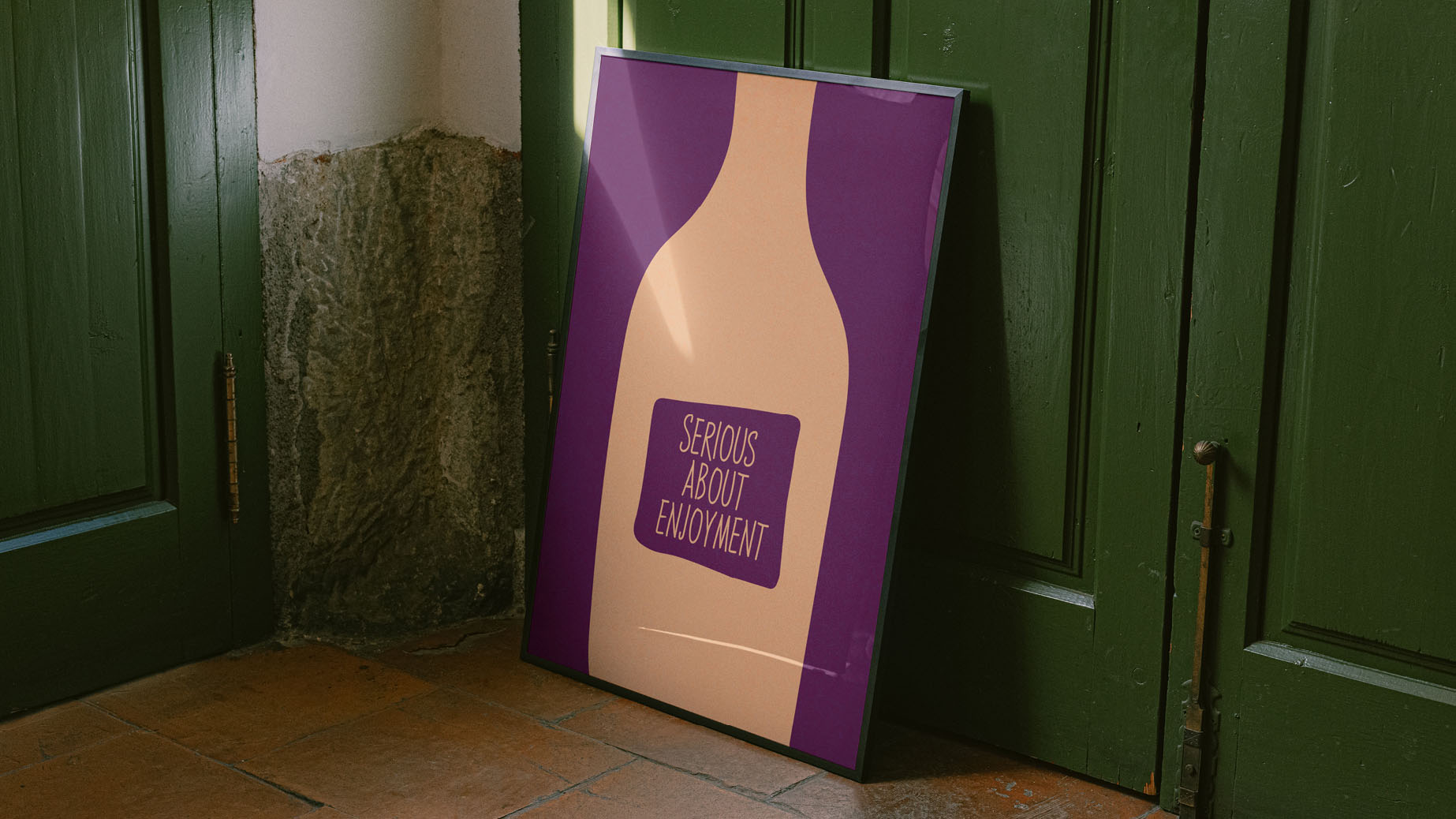Центральный элемент айдентики — обаятельный, нарочито небрежный логотип с нарисованными от руки буквами. Между словами визуально формируется силуэт бутылки, а «неудобный» дефис превращается в винную этикетку — приём, который оживает в постерах, меню и упаковке.