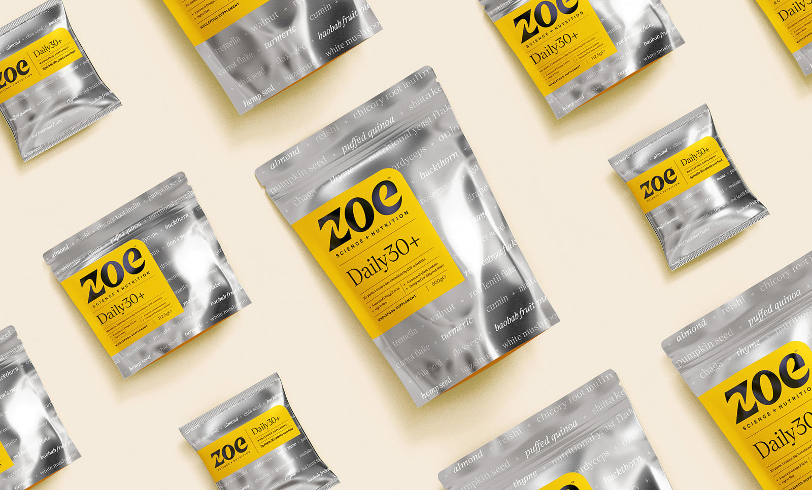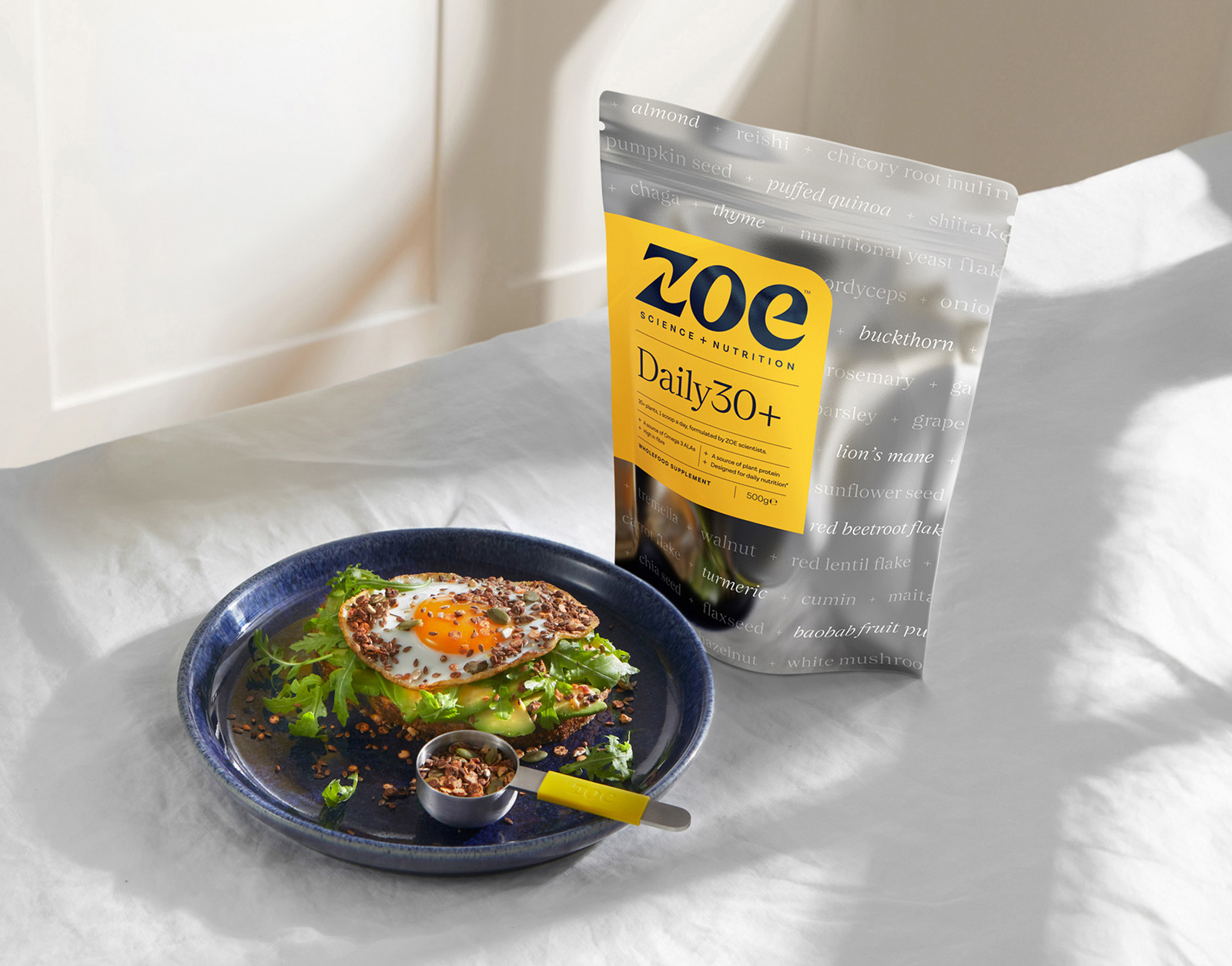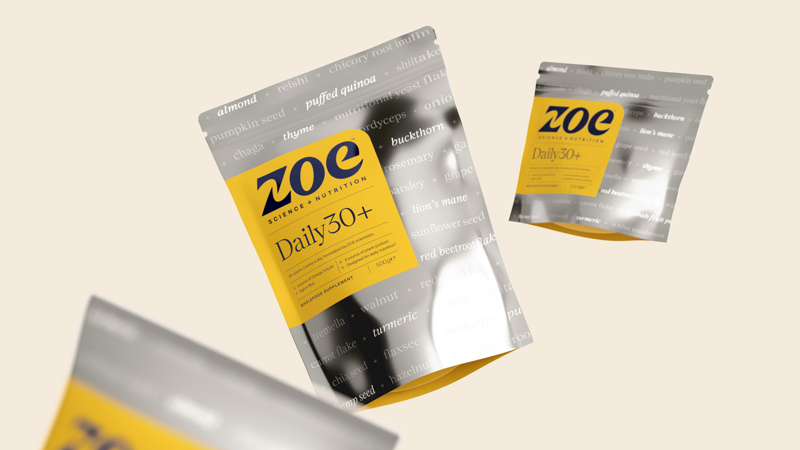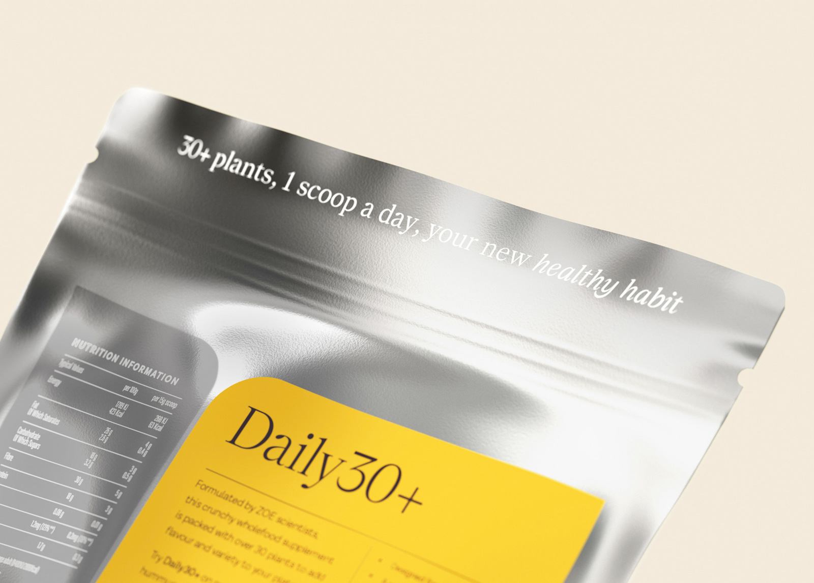 Айдентика Daily30+ позиционирует продукт как часть современного образа жизни, ориентированного на здоровье и осознанность, подчёркивая при этом его научную основу. Новый брендовый знак объединяет ZOE с формулировкой Science + Nutrition, указывая на фундаментальную связь между исследованиями и питанием.