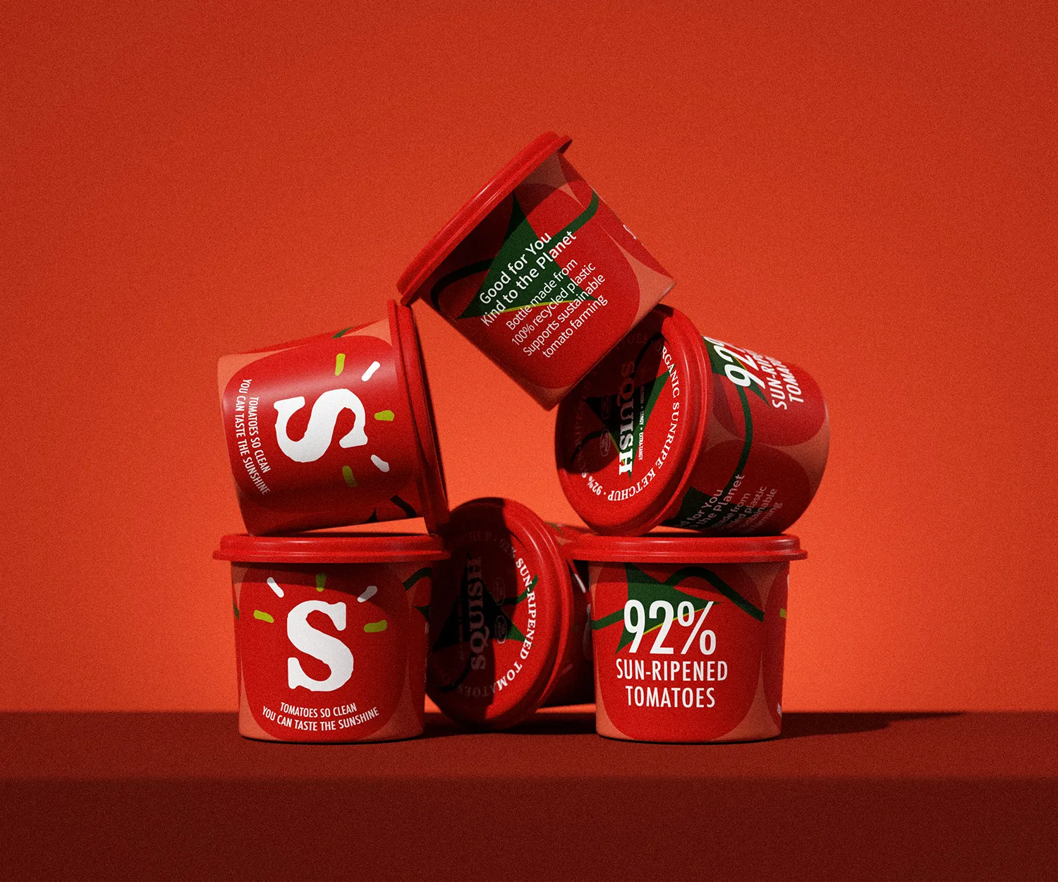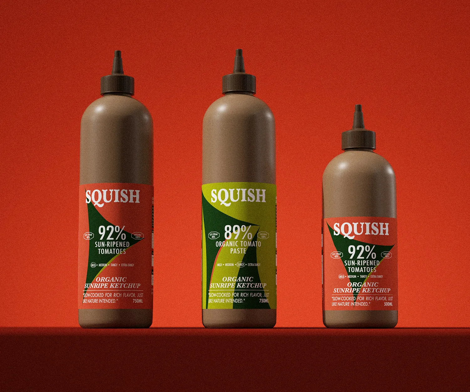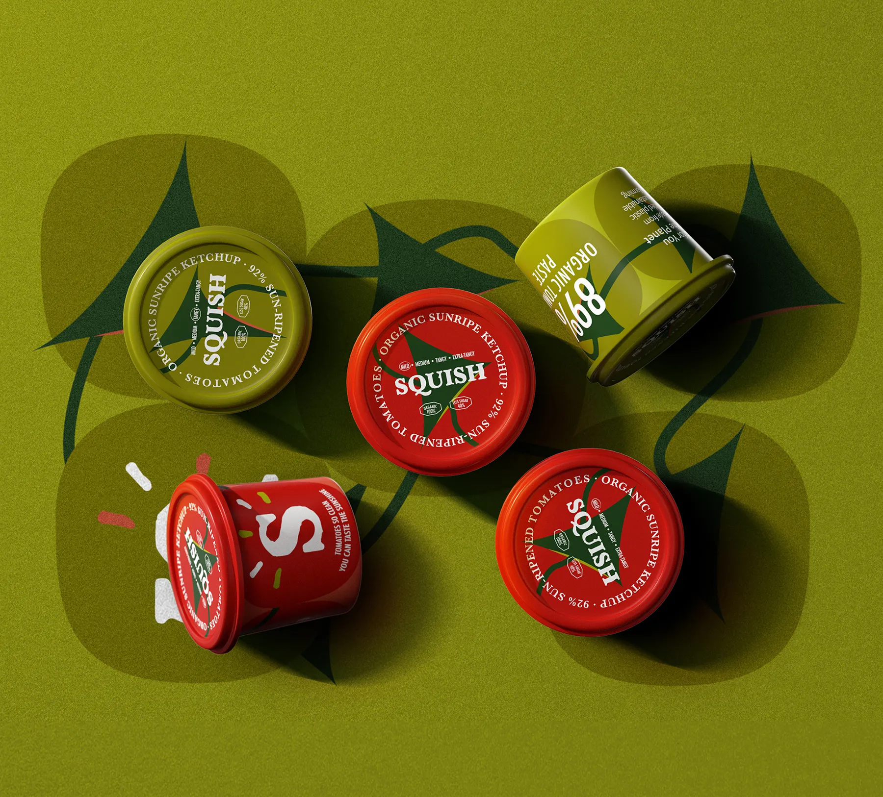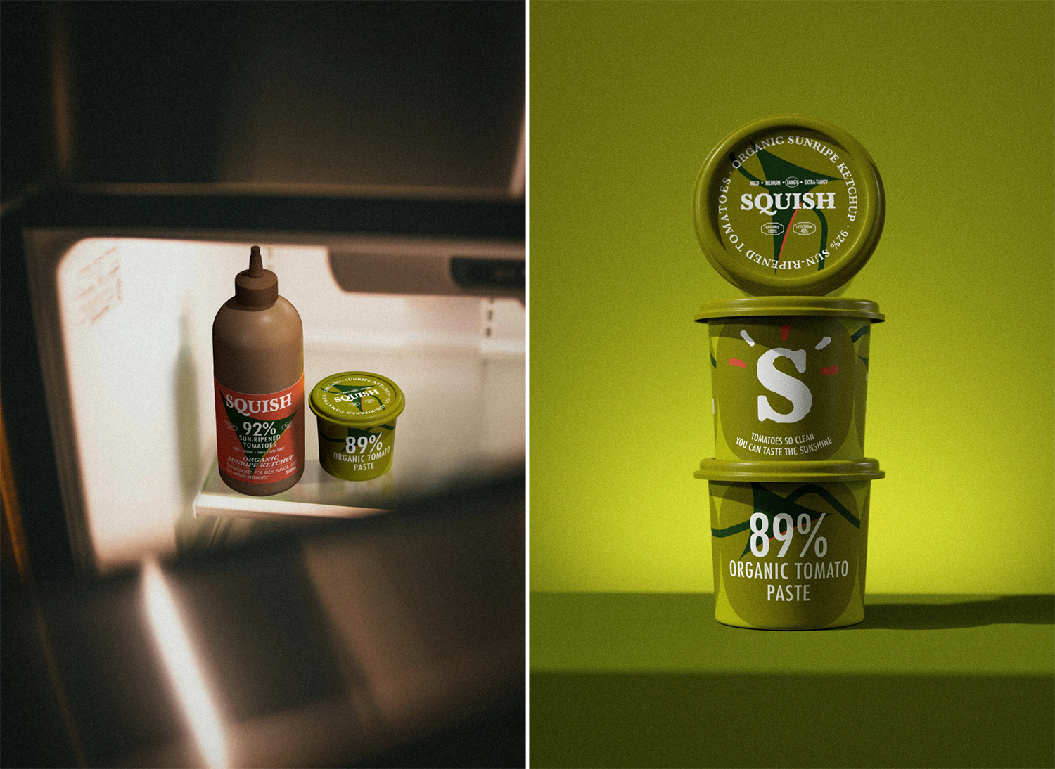 SQUISH выступает за быстрое и интуитивное взаимодействие с продуктом, делая акцент на свежести и органичности. Упаковка оформлена таким образом, чтобы напоминать овощ, готовый к сбору: выбор баночки с полки имитирует жест, знакомый каждому, кто когда-либо срывал спелый плод. Такой подход усиливает тактильную и эмоциональную связь между продуктом и покупателем.