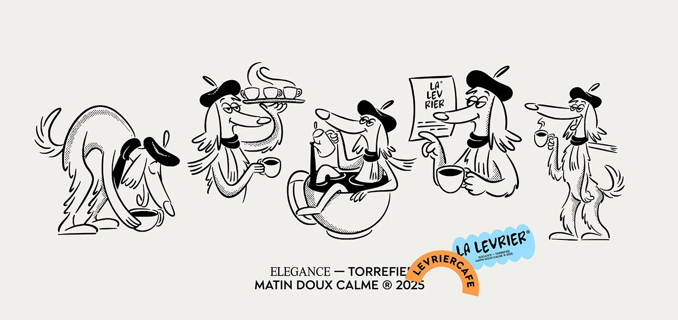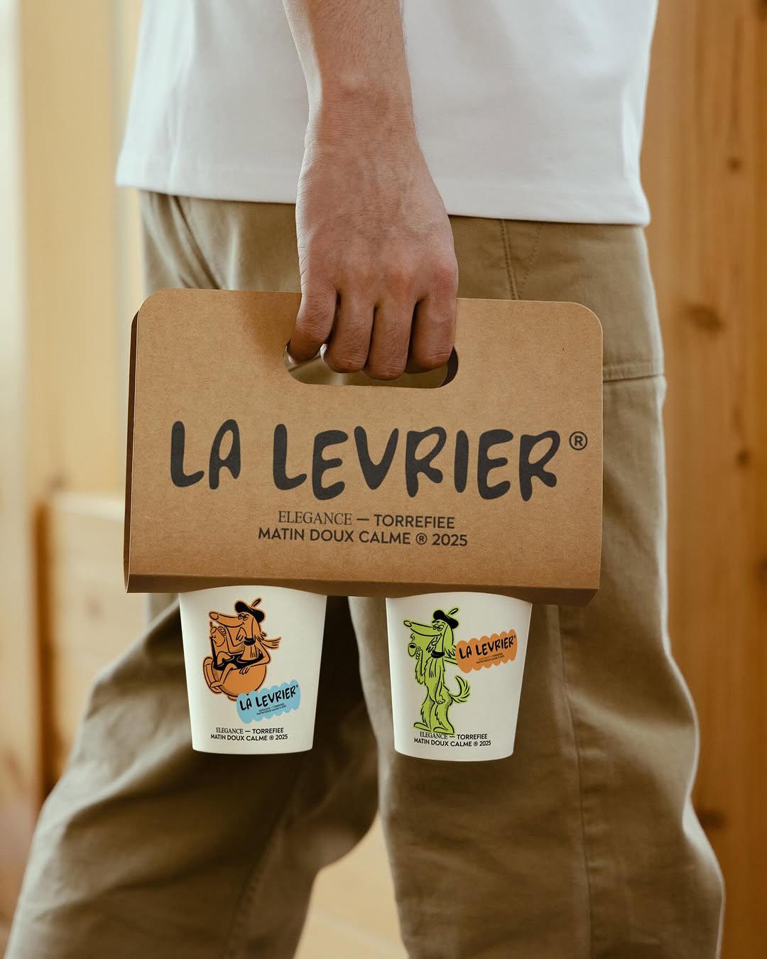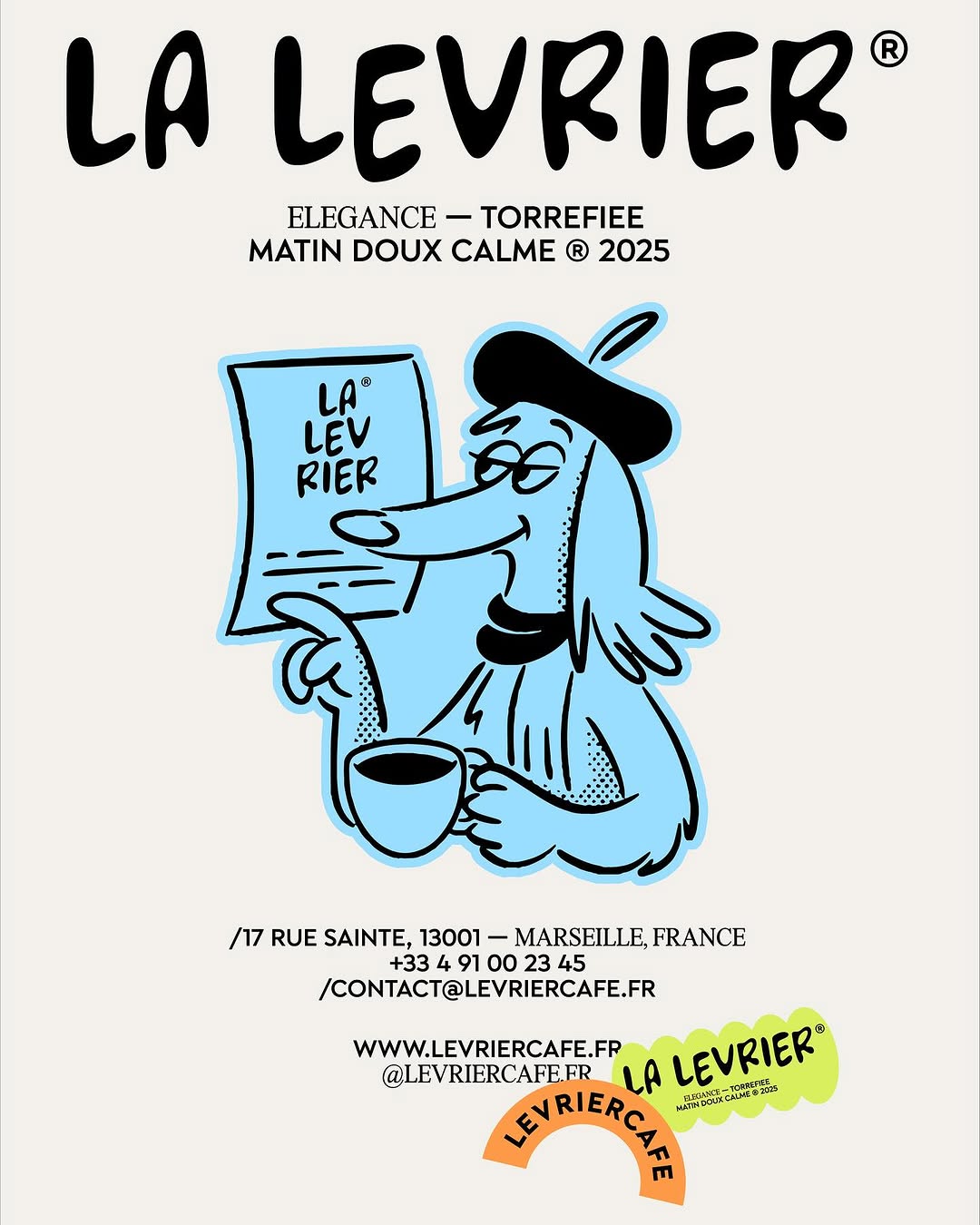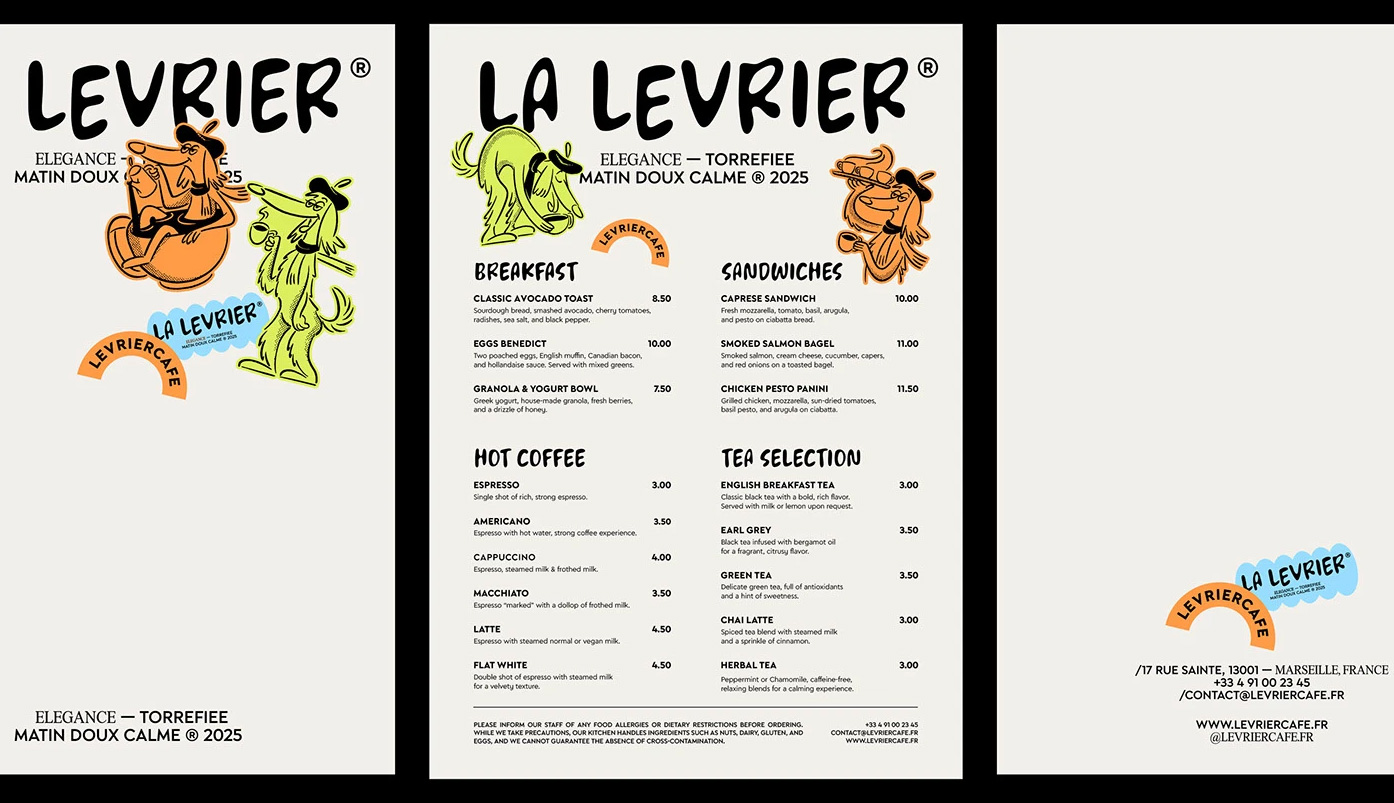 Главный герой — нарисованная от руки борзая в берете: то с подносом, то с меню, то уютно устроившаяся в чашке эспрессо. Каждая иллюстрация отражает дух кафе — остроумный, изящный и по-настоящему самобытный.