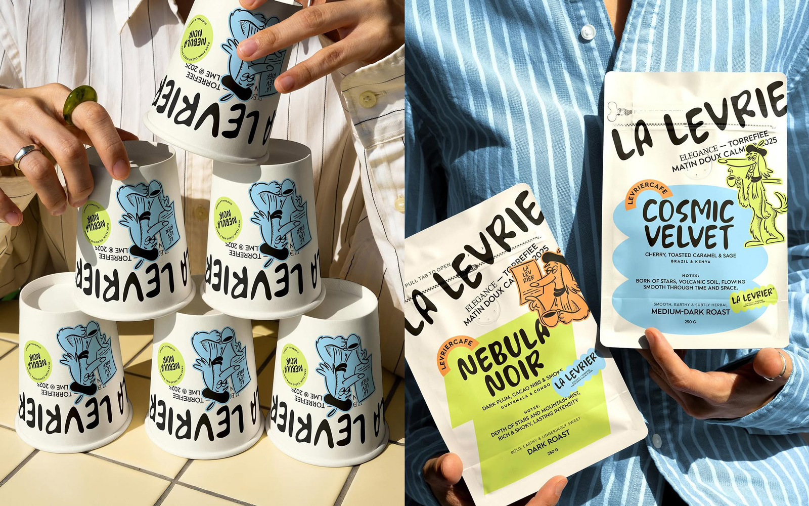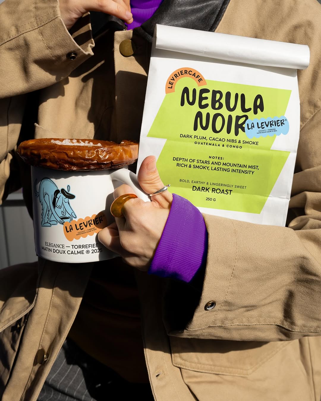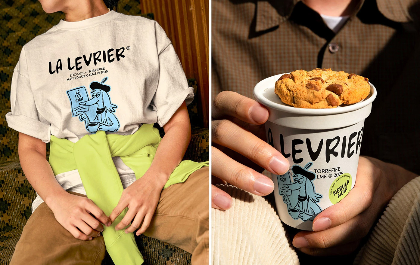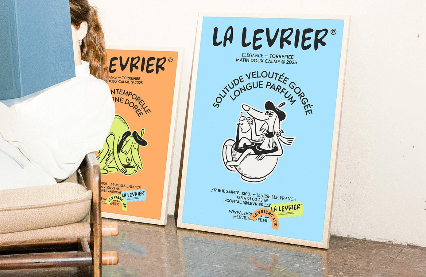 Главный герой — нарисованная от руки борзая в берете: то с подносом, то с меню, то уютно устроившаяся в чашке эспрессо. Каждая иллюстрация отражает дух кафе — остроумный, изящный и по-настоящему самобытный.