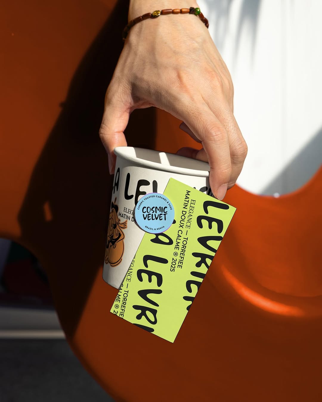 Цветовая палитра сочетает элегантную чёрно-белую линейную графику с мягкими акцентами оранжевого, пастельно-голубого и оливкового. В типографике — смелый, нарочито рукописный логотип, дополненный современными минималистичными гротесками. Такой подход позволяет создать баланс между характером, изяществом и актуальной культурой городских кафе.