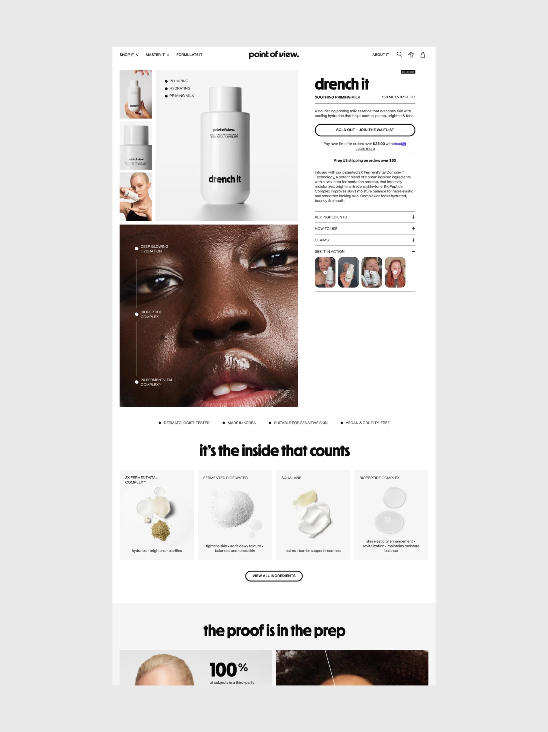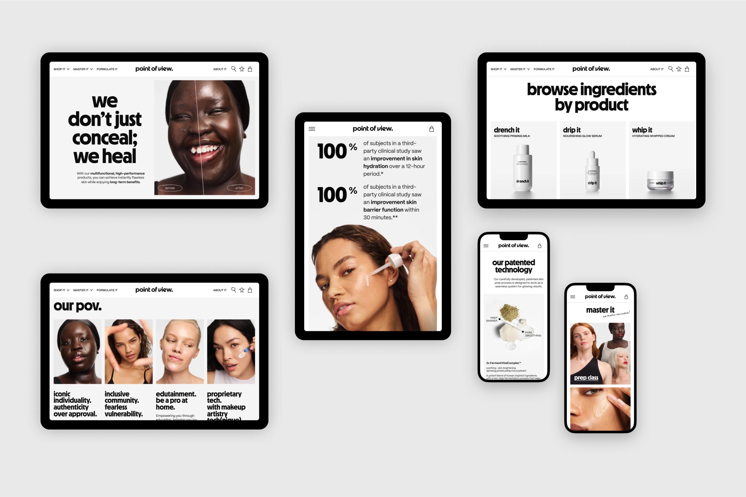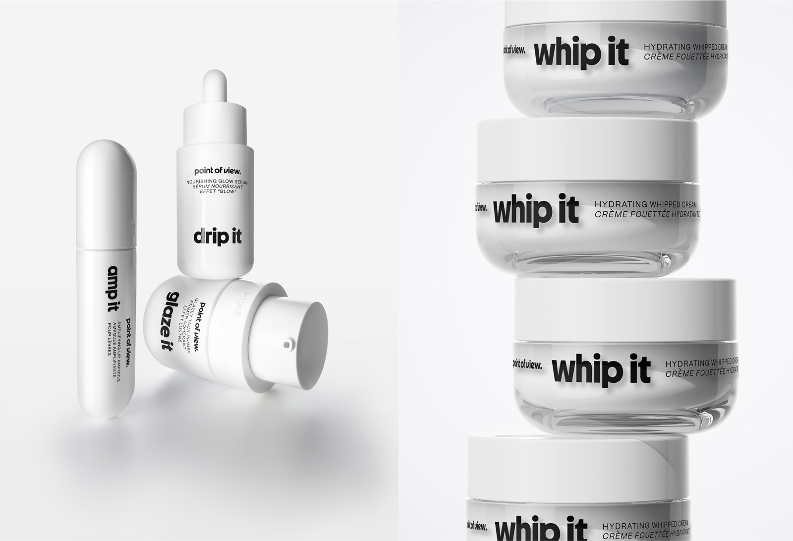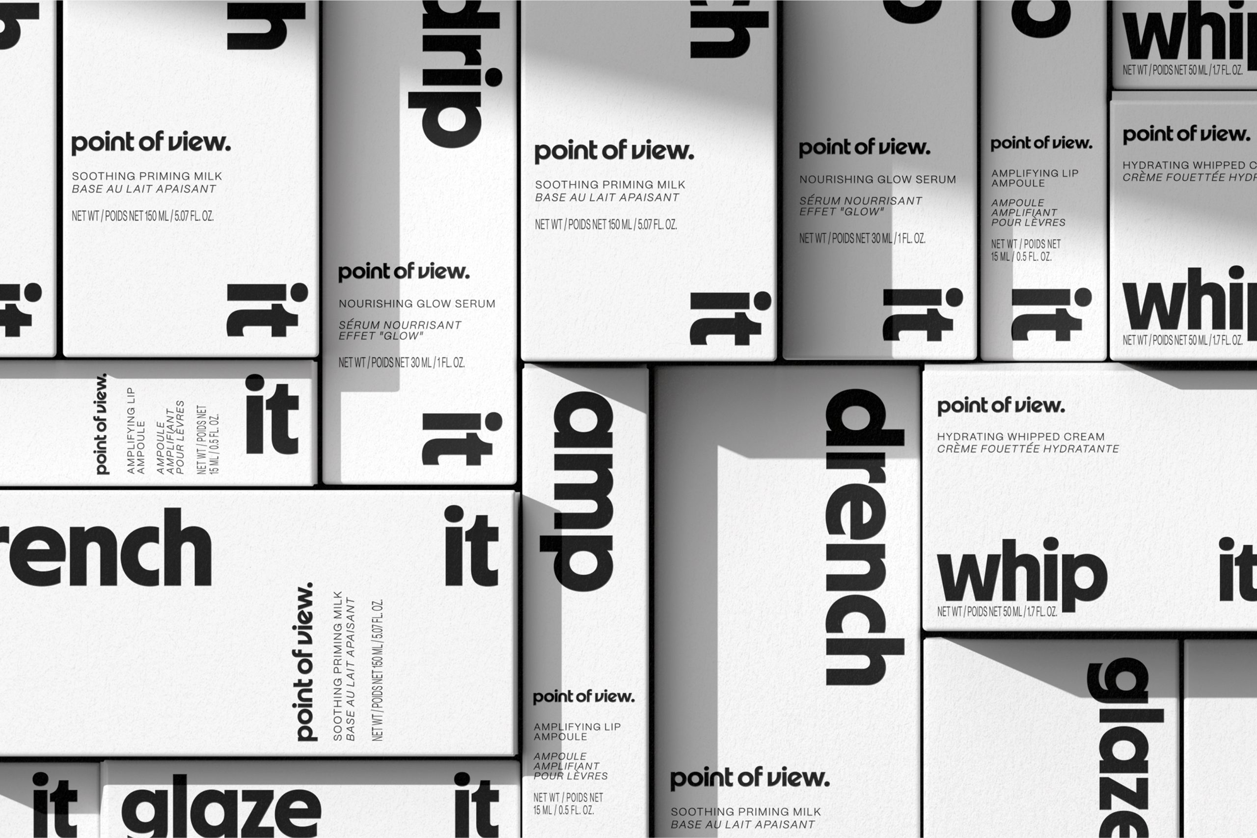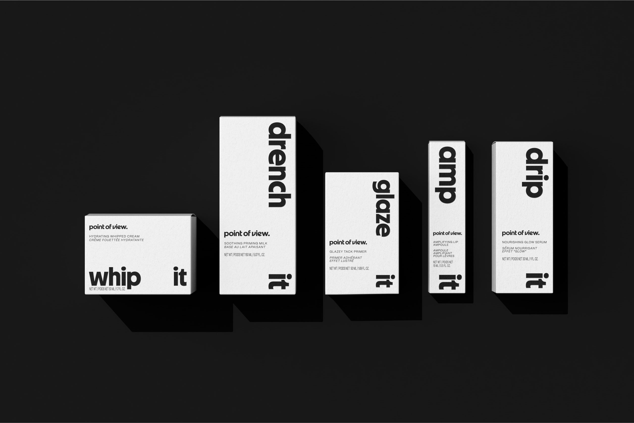 Упаковка бренда Point of View, разработанная студией Established, целиком опирается на игру слов и выразительную типографику. Названия продуктов вроде “whip it”, “glaze it” и “amp it” набраны жирным гротеском в нижнем регистре — при этом чёрно-белая палитра делает акцент на слоганах, не отвлекая внимание от сути.