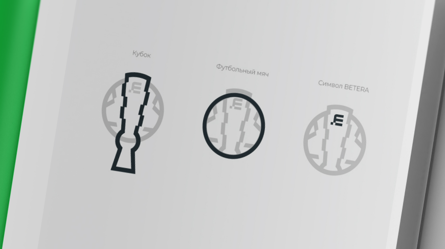 Одними из основных графических элементов айдентики Betera-Высшей лиги стали фирменные паттерны, напоминающие полосатый газон футбольного поля. Они присутствуют практически везде: в оформлении арок, тумб, бортов и других носителей. С логотипом их объединяют наклоны и технологичный глитч.