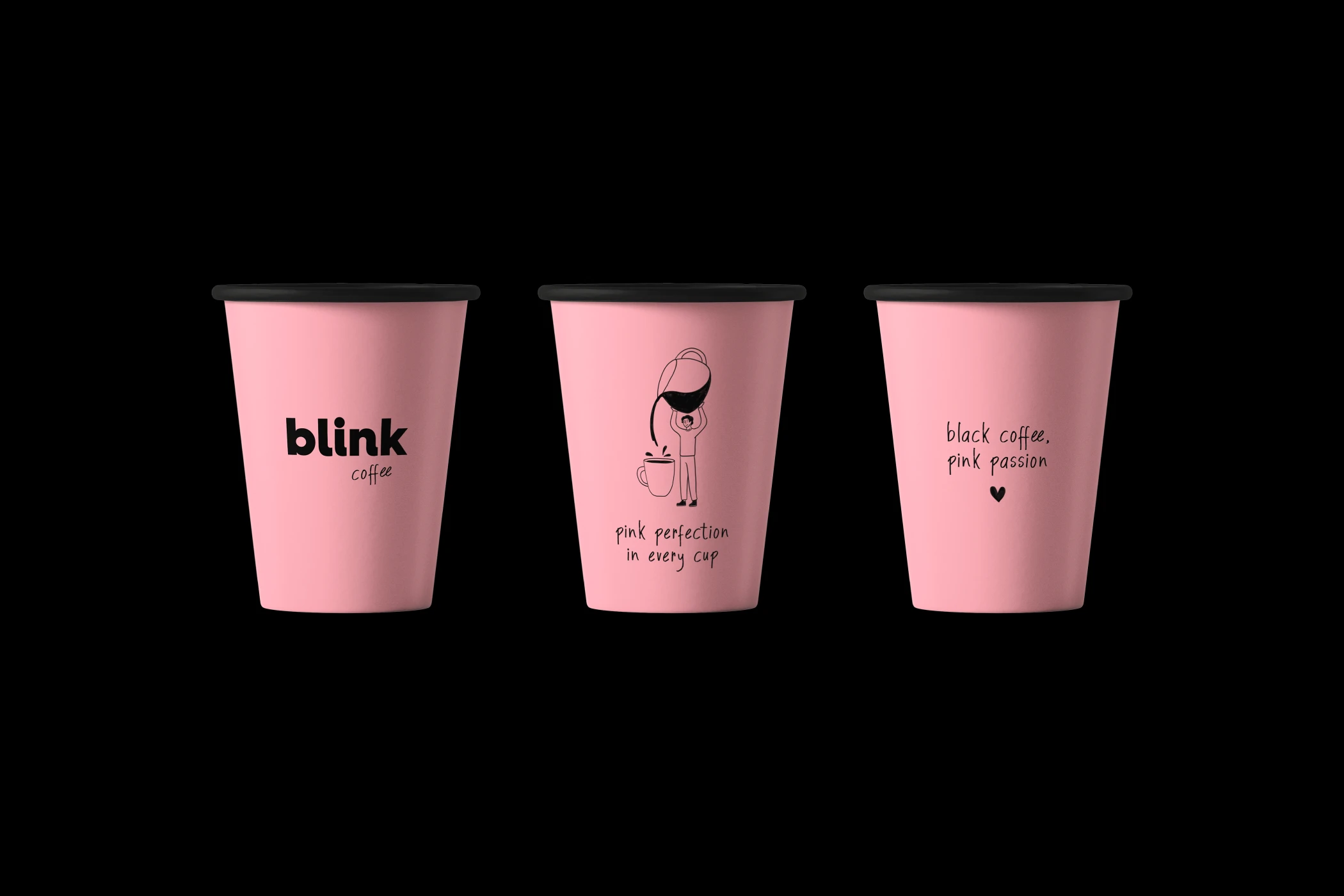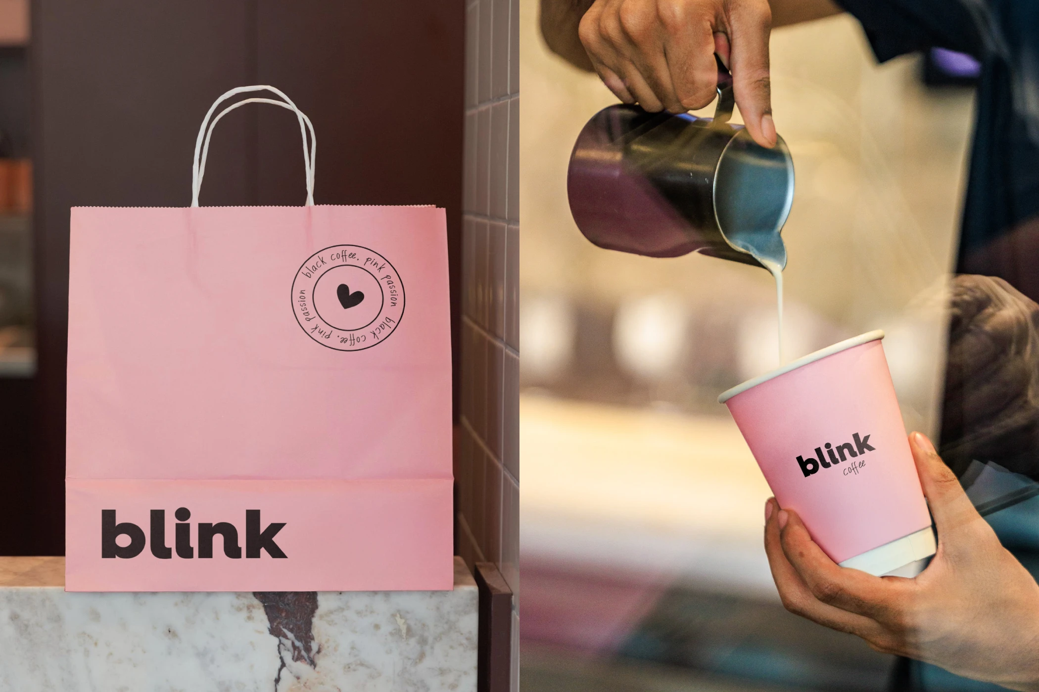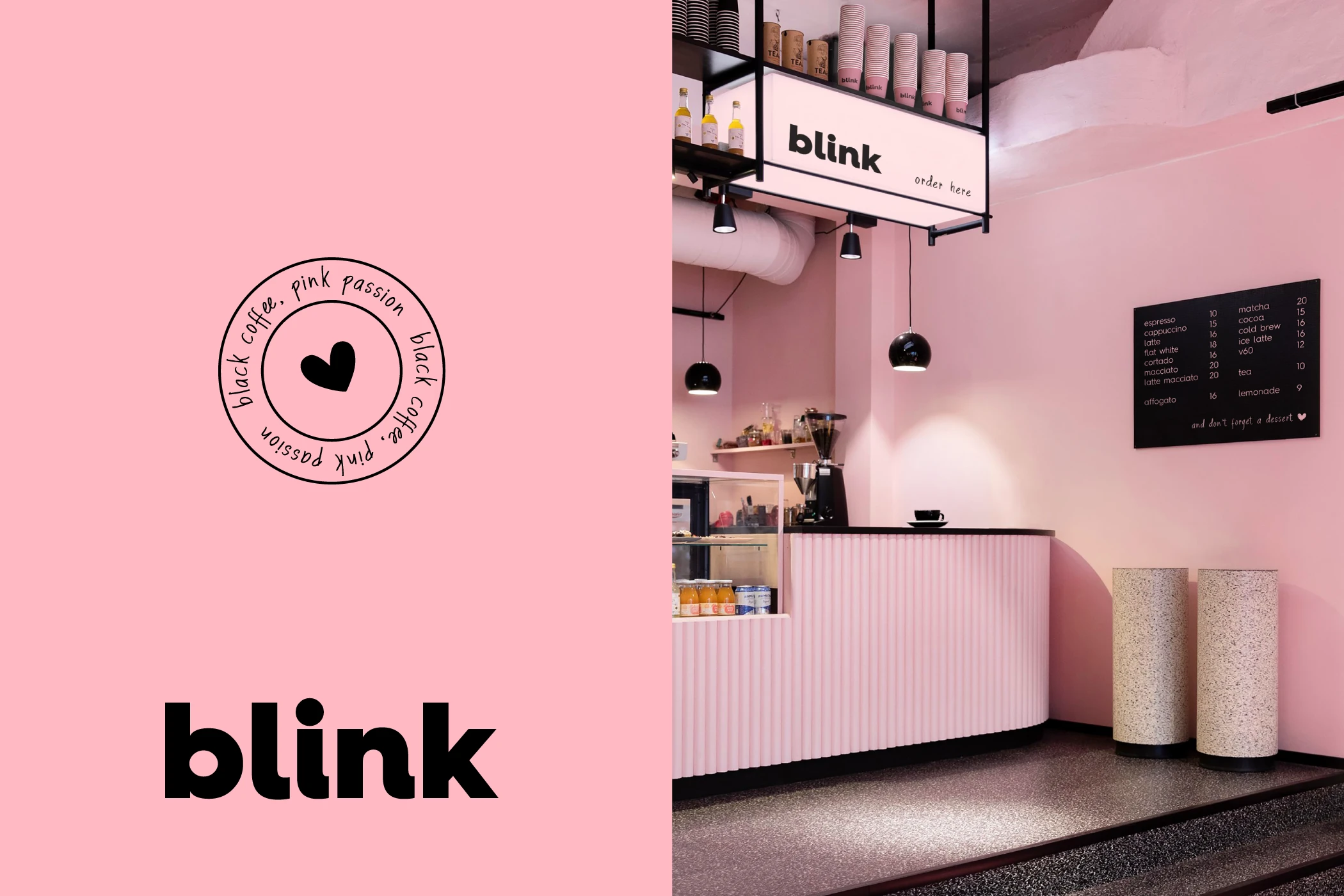 Название образовано от сочетания слов black и pink — черного кофе и розовых десертов, — что отражает ключевую визуальную метафору бренда: black + pink = blink.
