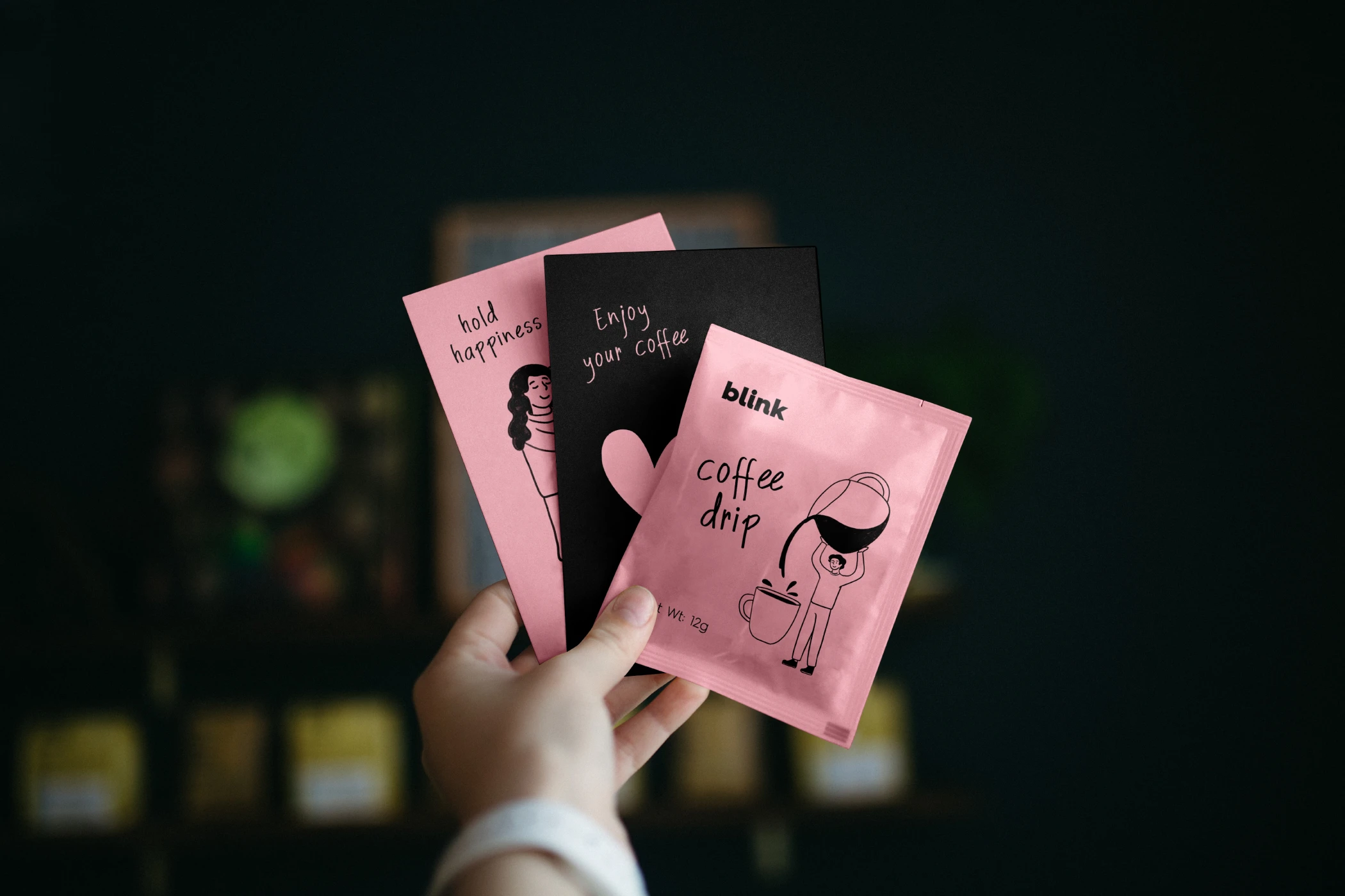 Каждая деталь дизайна тщательно продумана: от ручных иллюстраций с героями и гигантскими чашками кофе до десертов, придающих проекту индивидуальность и тёплую эмоциональную окраску. Благодаря этому художественному приёму Blink Cafe запоминается и вызывает желание вернуться — не только за кофе, но и за визуальным опытом.