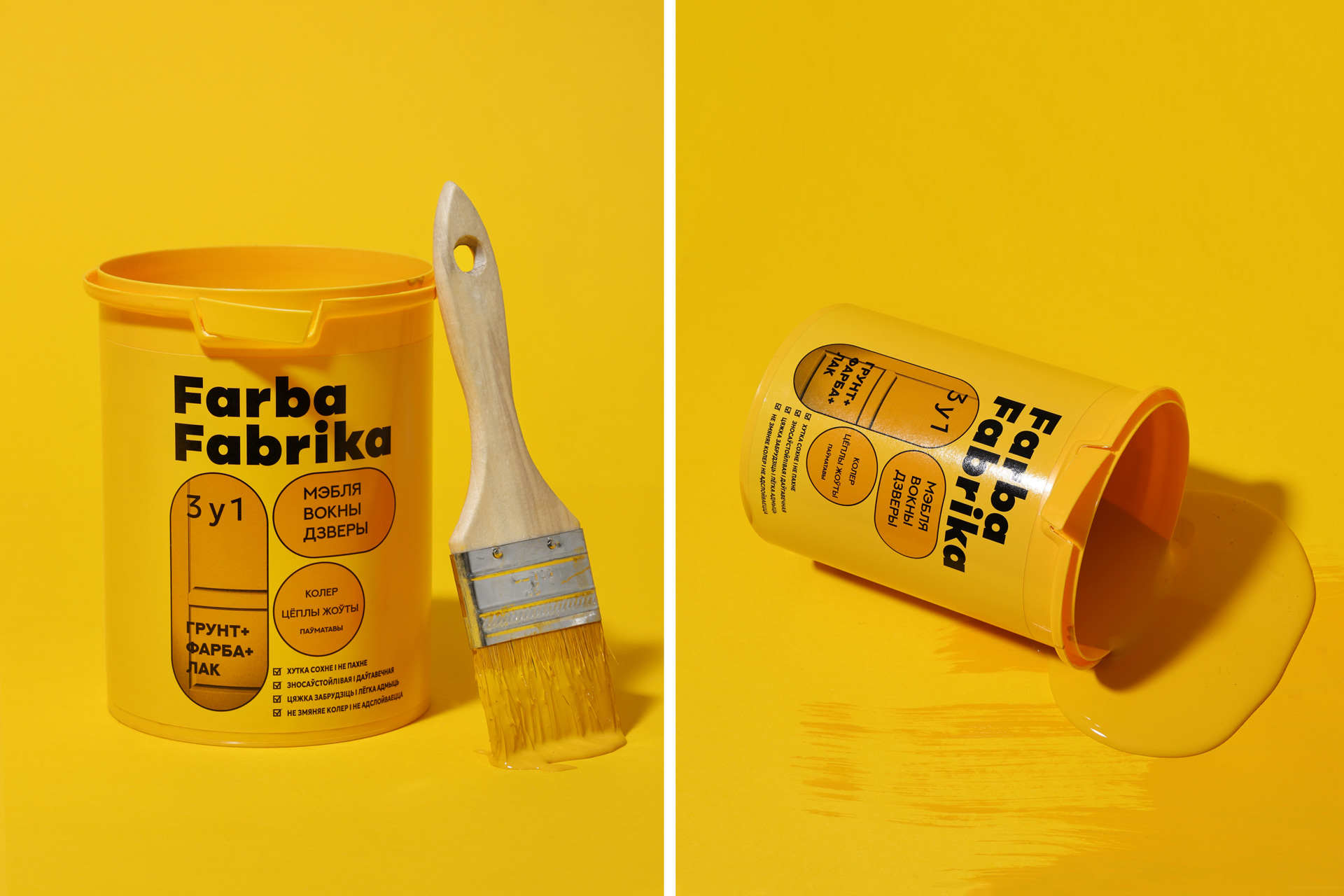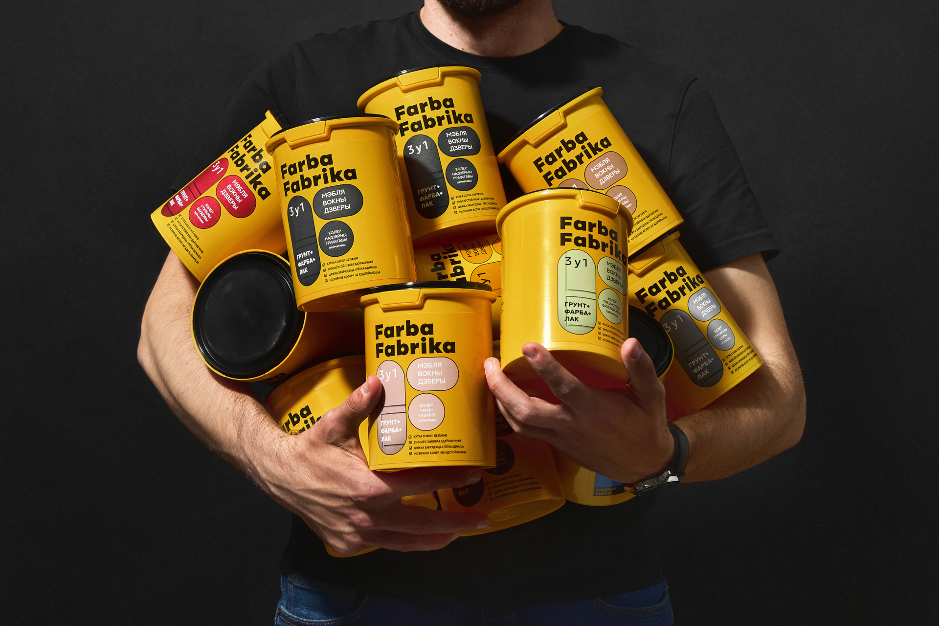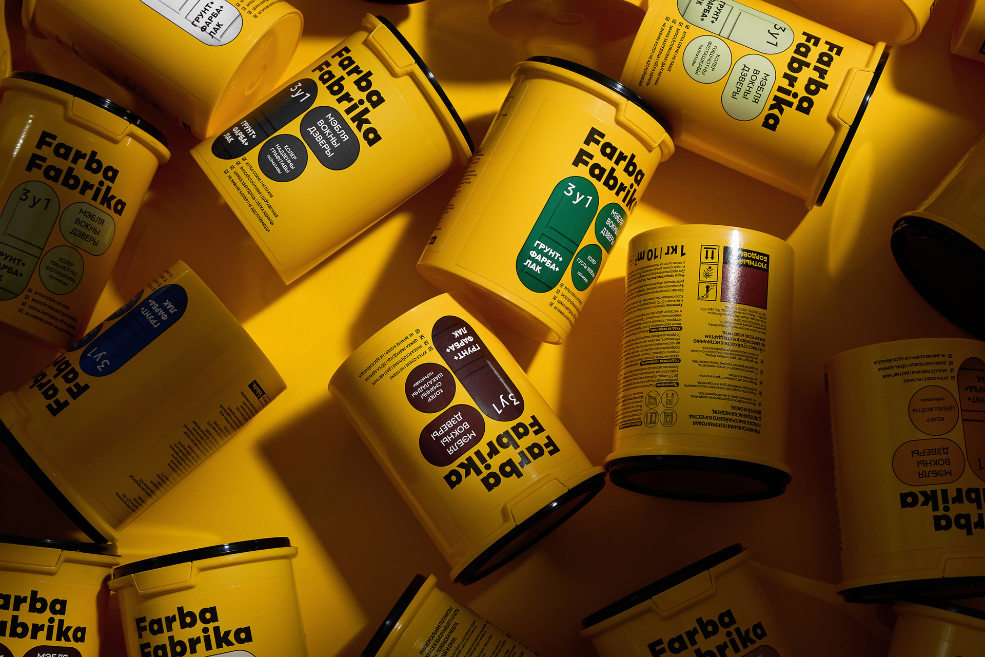 Так з’явіўся нэйм Farba Fabrika — яскравая, энергічная назва, у якой адразу чытаецца і прадукт, і яго карані. Тут — беларускае гучанне, лёгкі індустрыяльны прысмак і адчуванне колеру як дзеяння, працэсу. Гэта фабрыка колеру, дзе нараджаюцца вобразы і ідэі.
