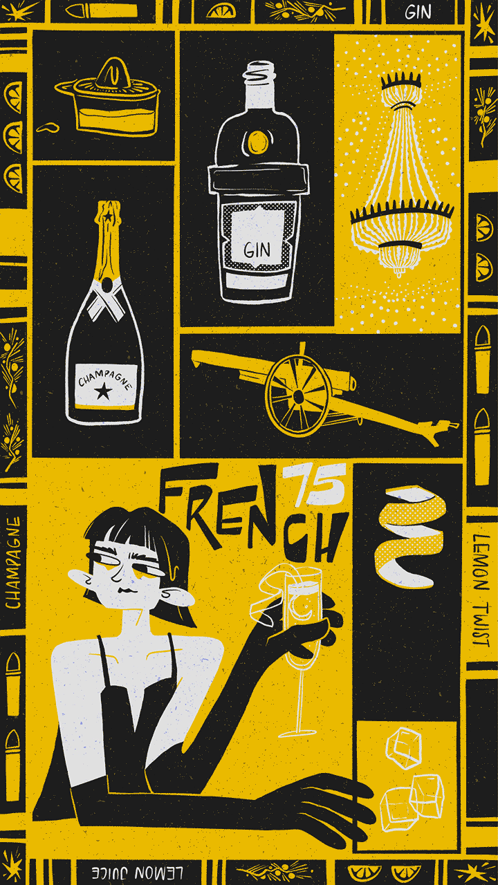 • French 75 (Париж, 1915) — напиток, эффект которого сравнивали с выстрелом из французской 75-миллиметровой пушки.