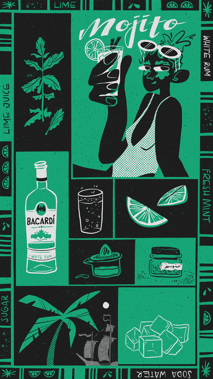 Швейцарская иллюстраторка Леан Рюгли представила динамичную серию упаковок и анимаций для коктейлей в банках, вдохновлённую легендарными рецептами и их историей