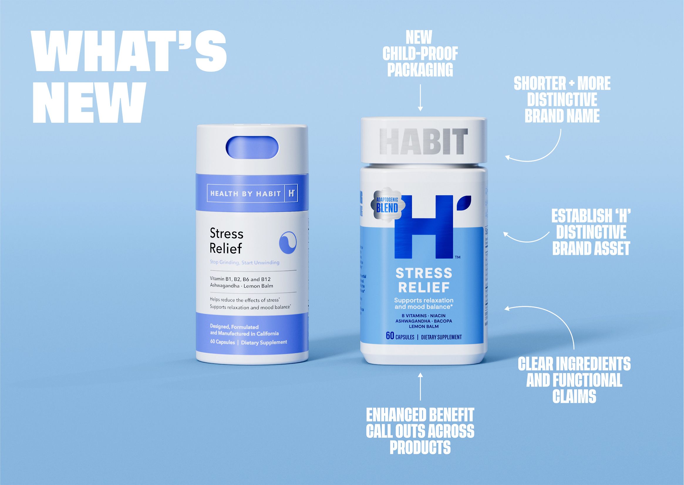 Редизайн бренда HABIT был проведён с целью повысить узнаваемость и отличимость. Новое название (сокращение от Health by Habit), заметный символ «H», а также выразительная типографика усиливают ментальную доступность и визуальное выделение на полке, одновременно подчёркивая функциональные преимущества продукта. Яркие, насыщенные цвета, матовая отделка и металлизированные детали усиливают премиальность — особенно для ключевой аудитории бренда.