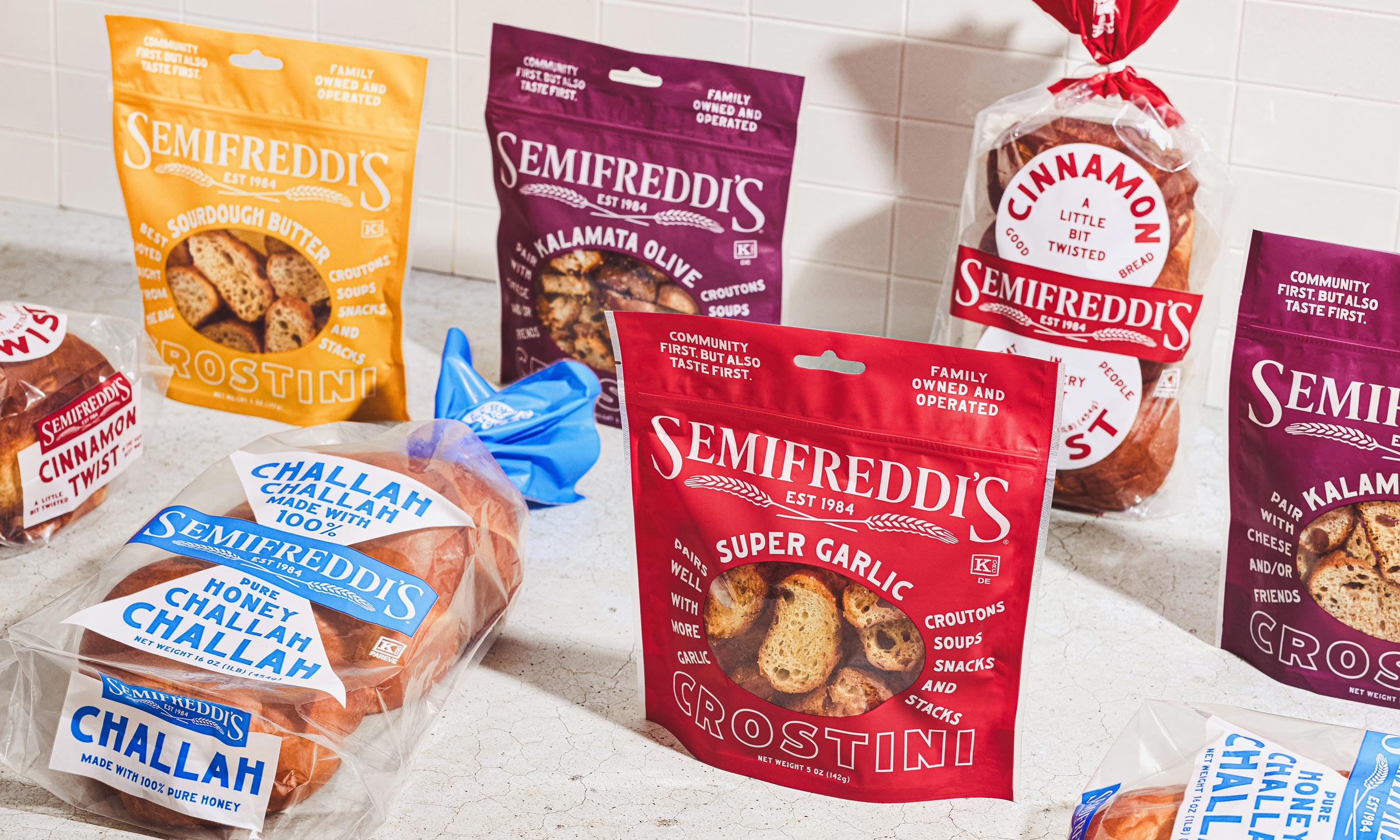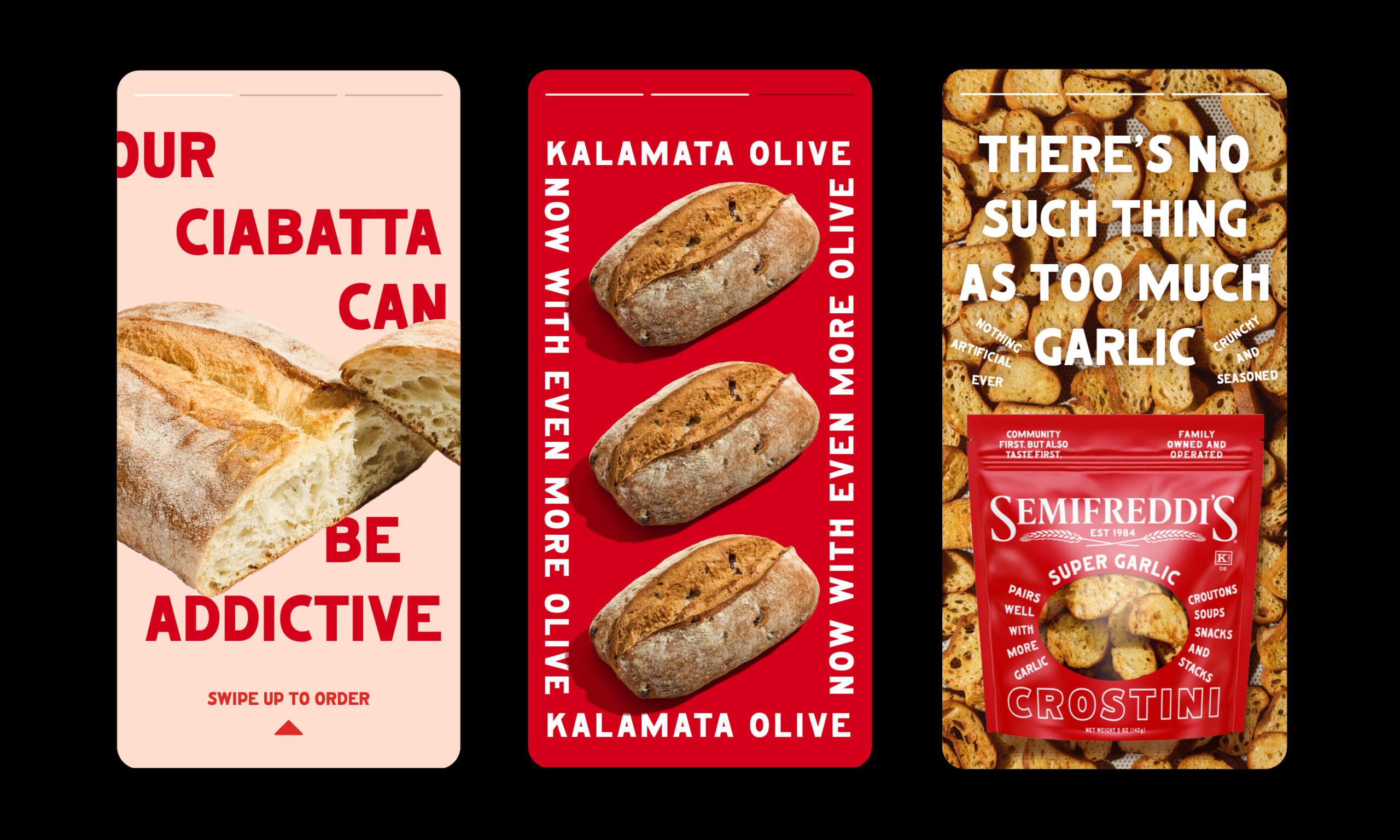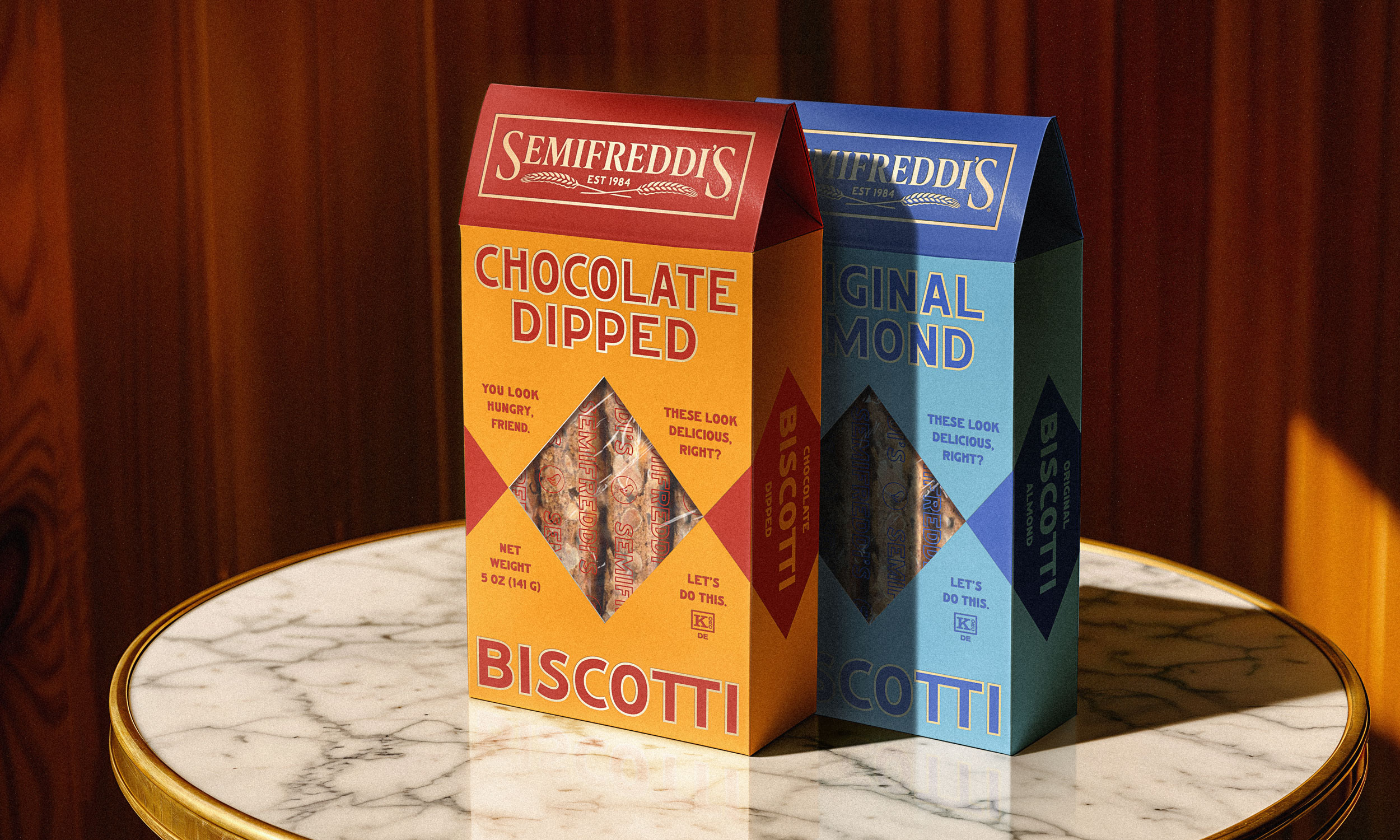 Монохромная цветовая палитра и цветовое кодирование для разных SKU позволяют типографике выйти на первый план. Она громкая, уверенная в себе и абсолютно узнаваемая — так же, как и сама Semifreddi’s.