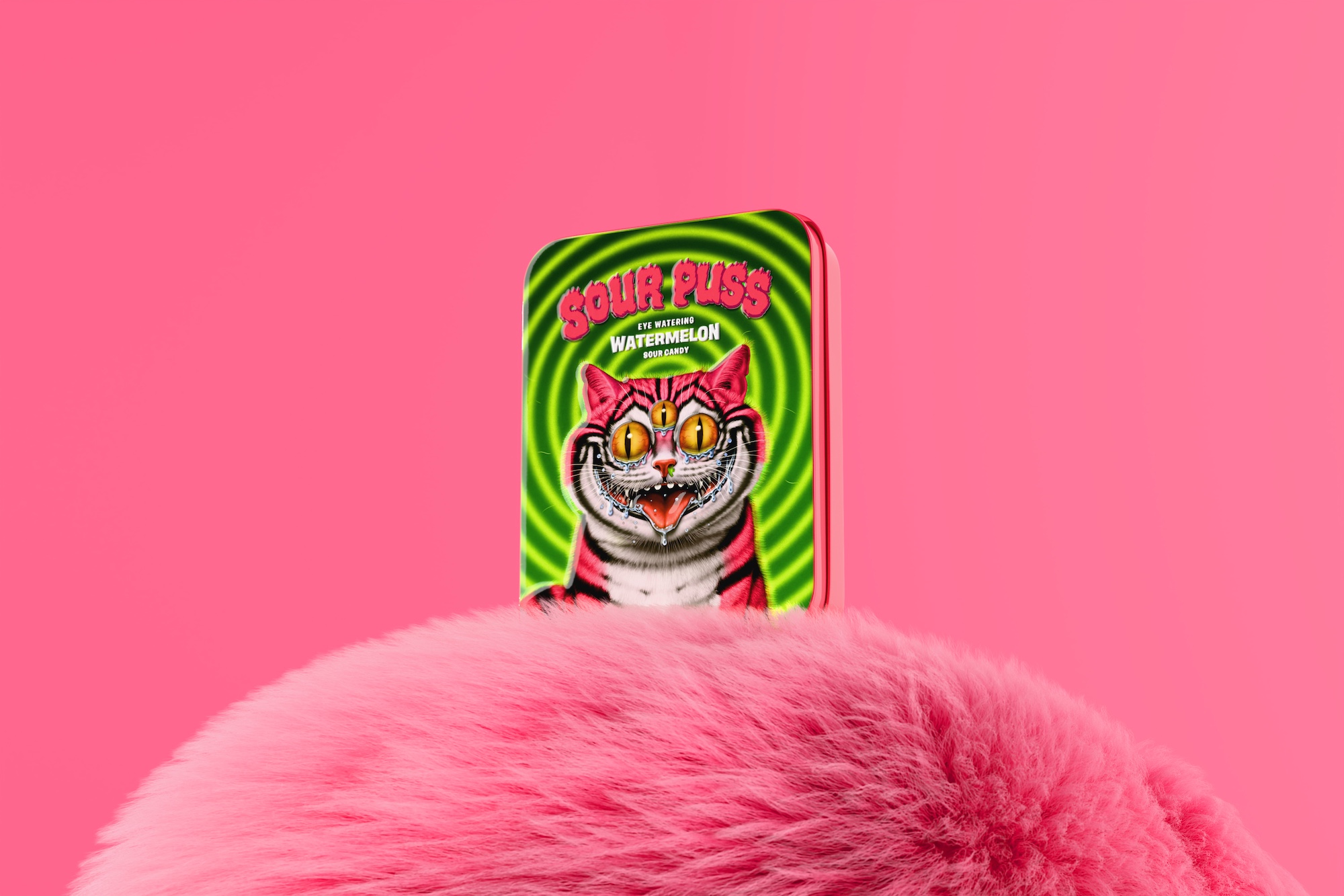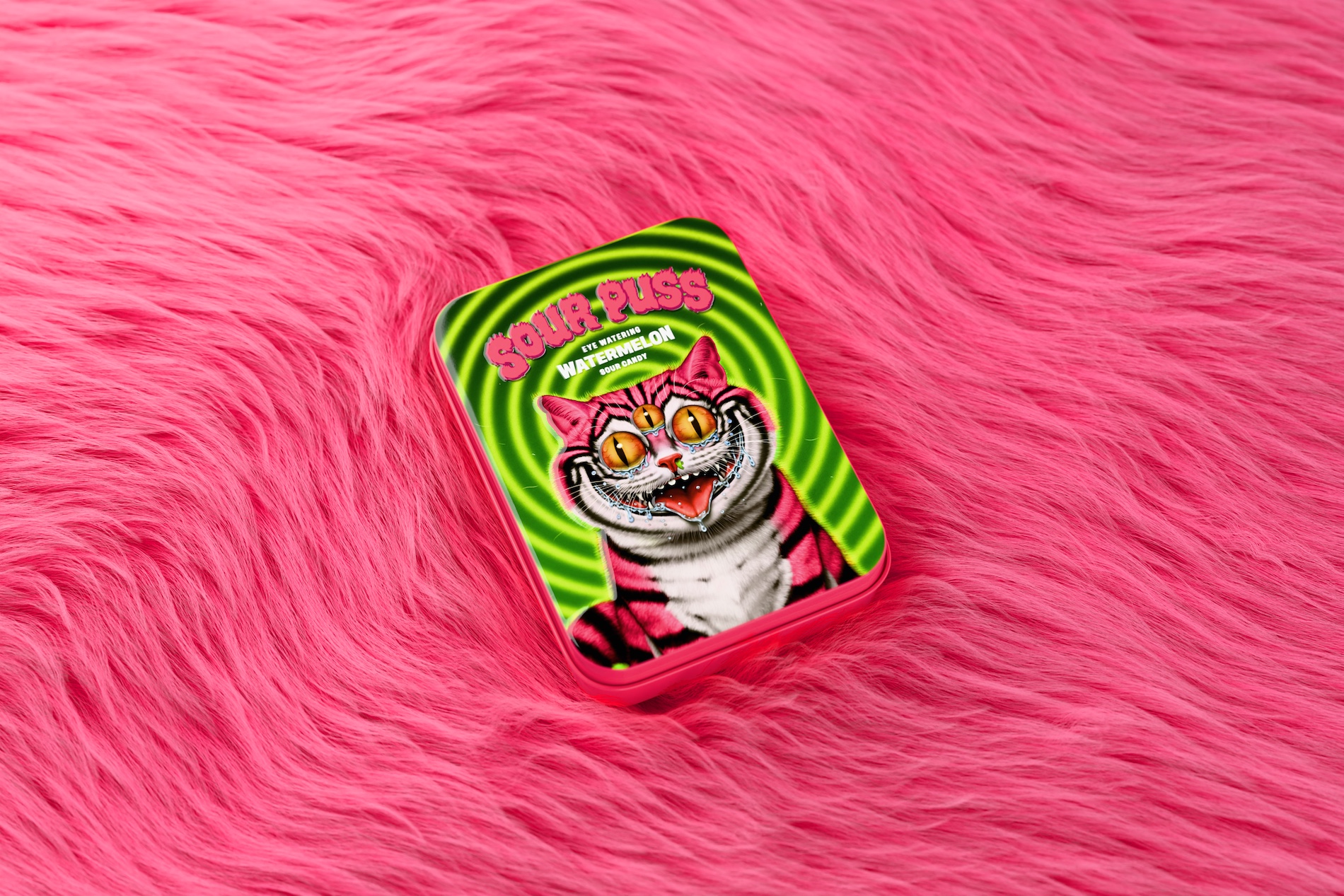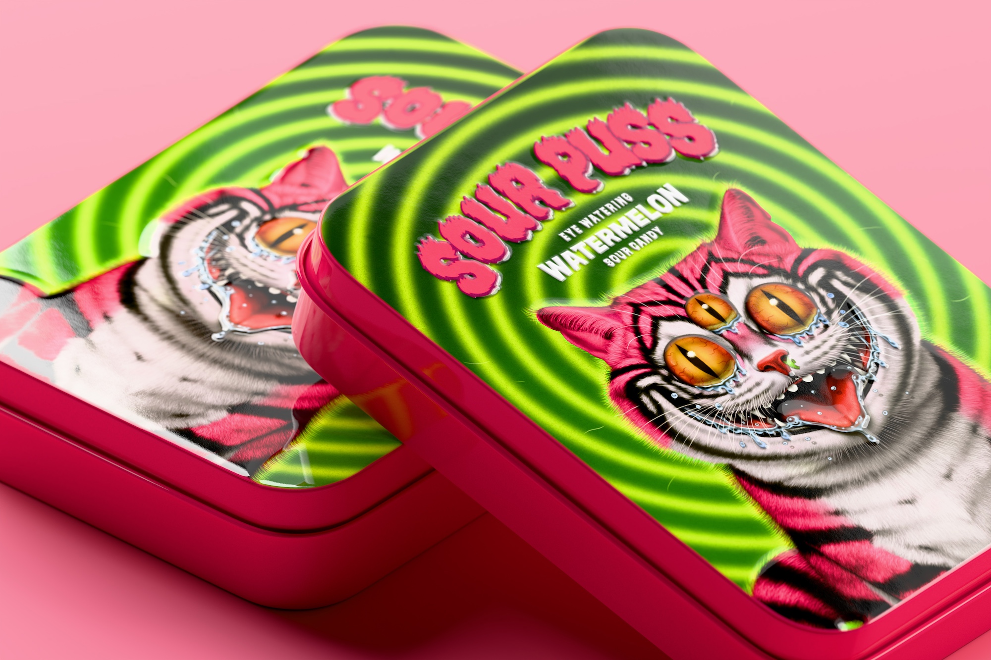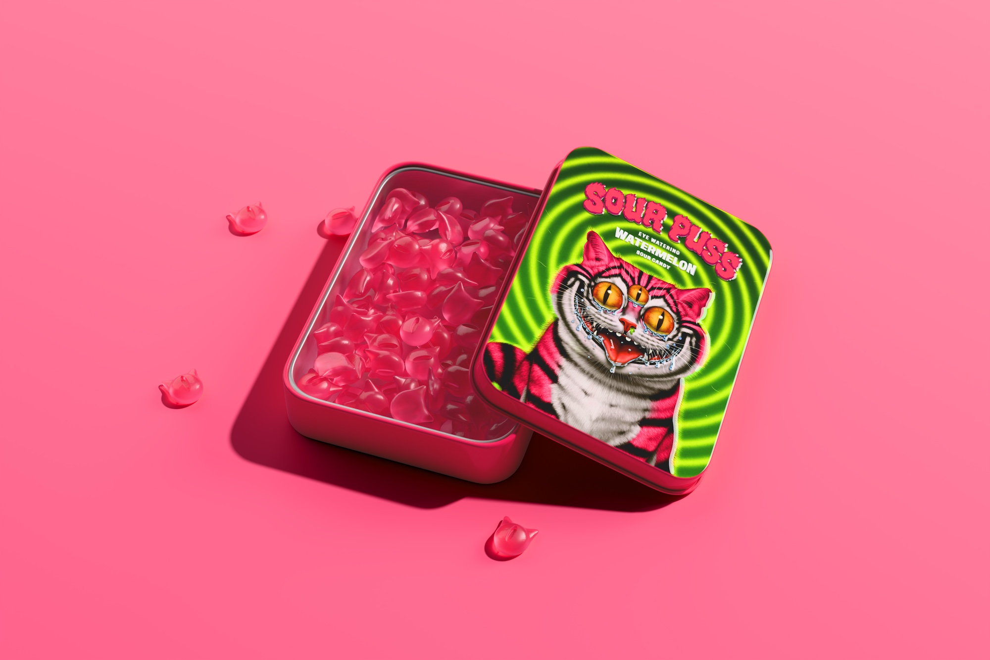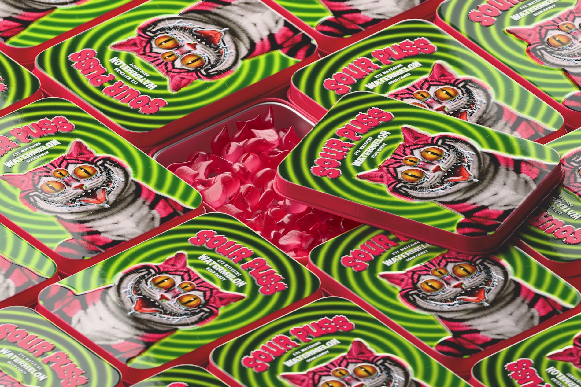 Sour Puss начинался с простой идеи: арбузные кислые конфеты для взрослых, в которых сочетались бы премиальность и дерзость. Вместо привычного пластикового пакета использовали жестяную банку с премиальной отделкой. Она призвана сделать потребление конфет более осознанным, почти ритуальным: не горстью, а по одной-две за раз.