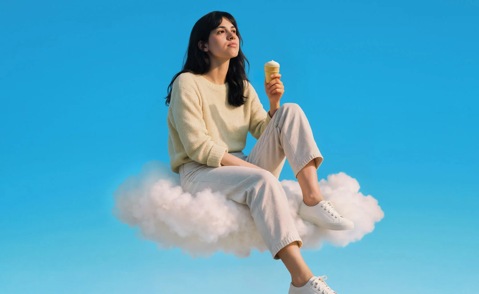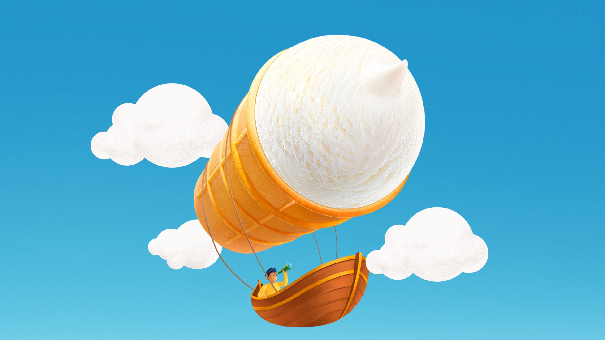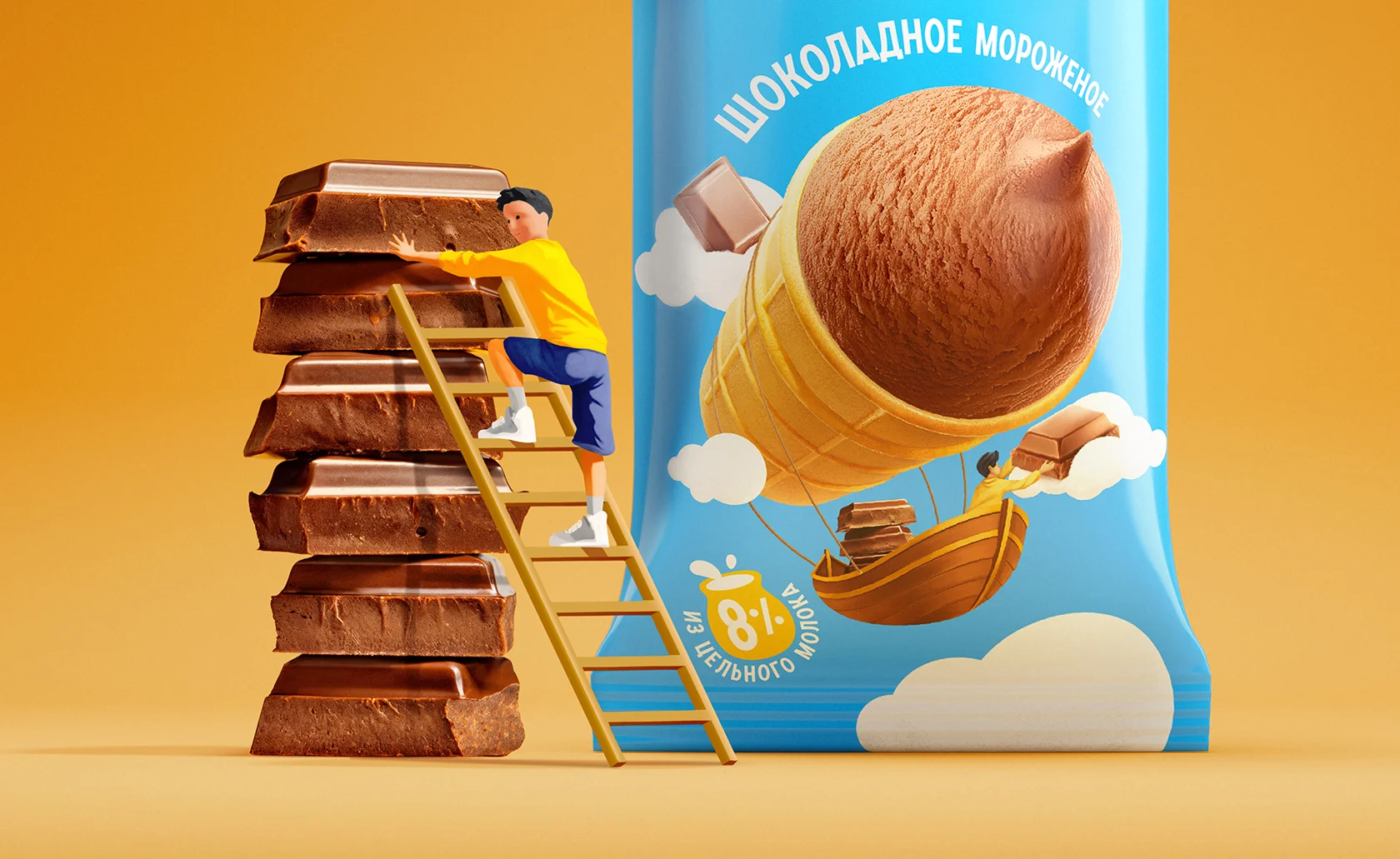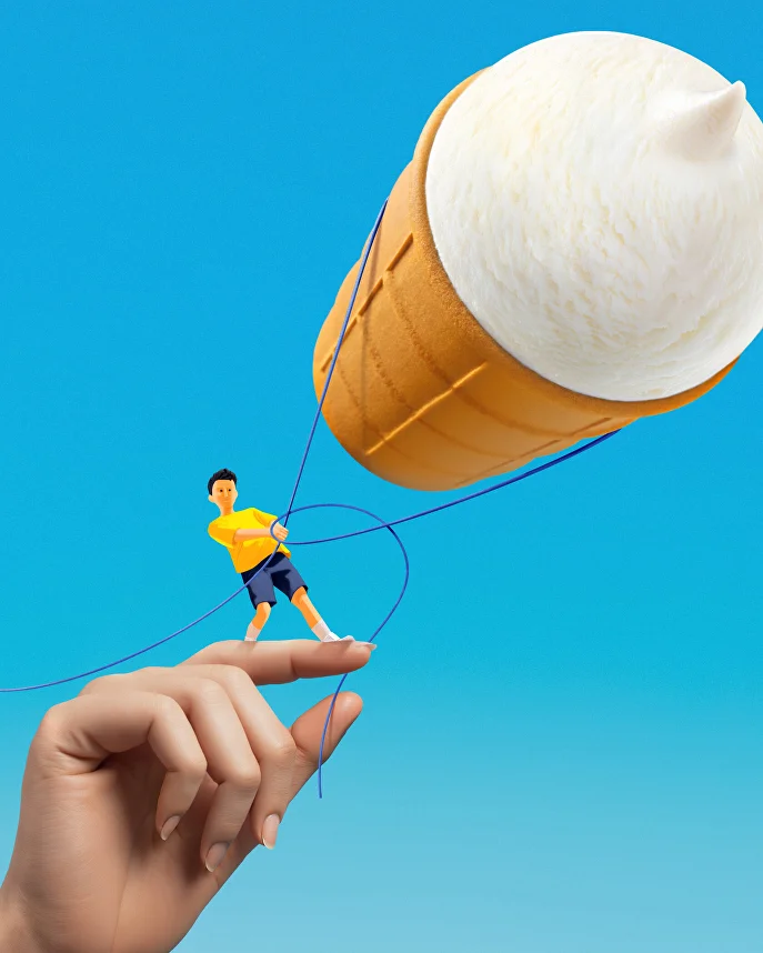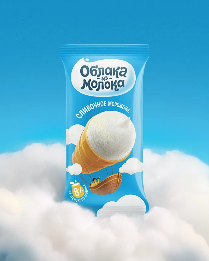 Вдохновением стало одно из ключевых преимуществ натурального мороженого — его лёгкость. В дизайне эта метафора нашла отражение с помощью фантазийных, уносящих в мир лёгкости, сюжетов: рожок представлен в виде облака, аэростата, дирижабля или воздушного шара. Авторский иллюстративный стиль придает фуд-зоне сказочный, буквально неземной характер. Новая упаковка выделяет продукт на полке, подчеркивая его «невесомость» и «воздушное» наименование.