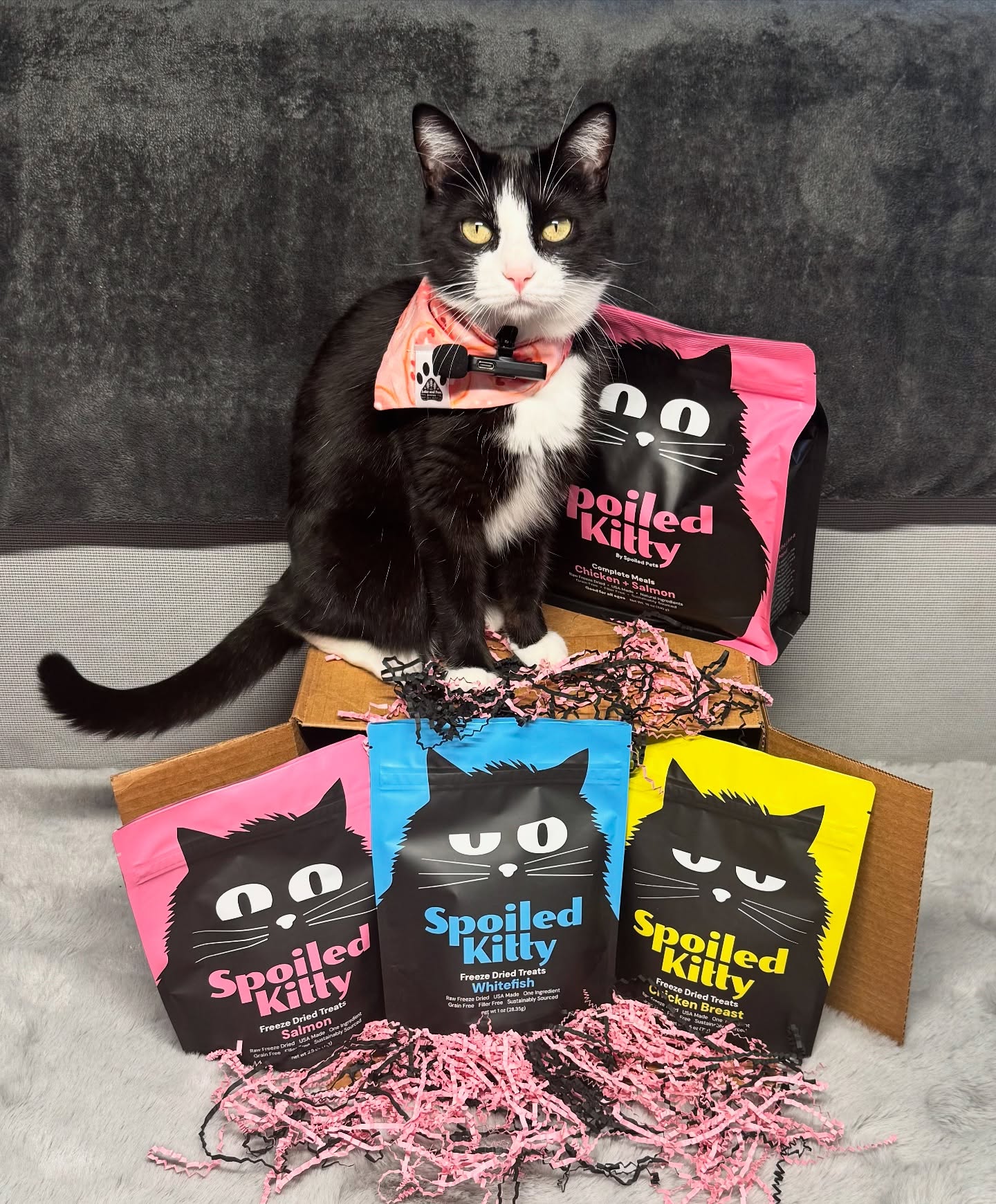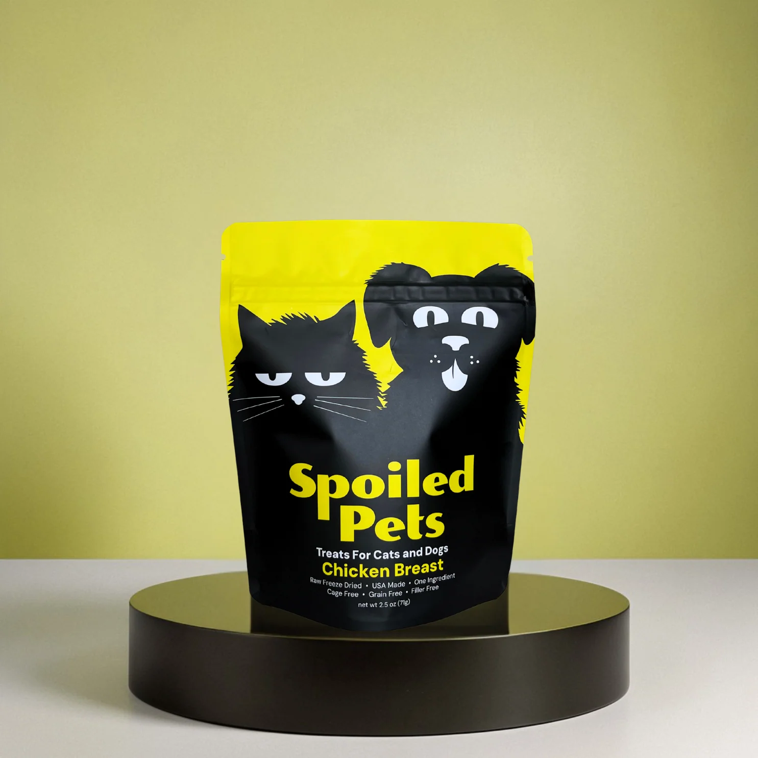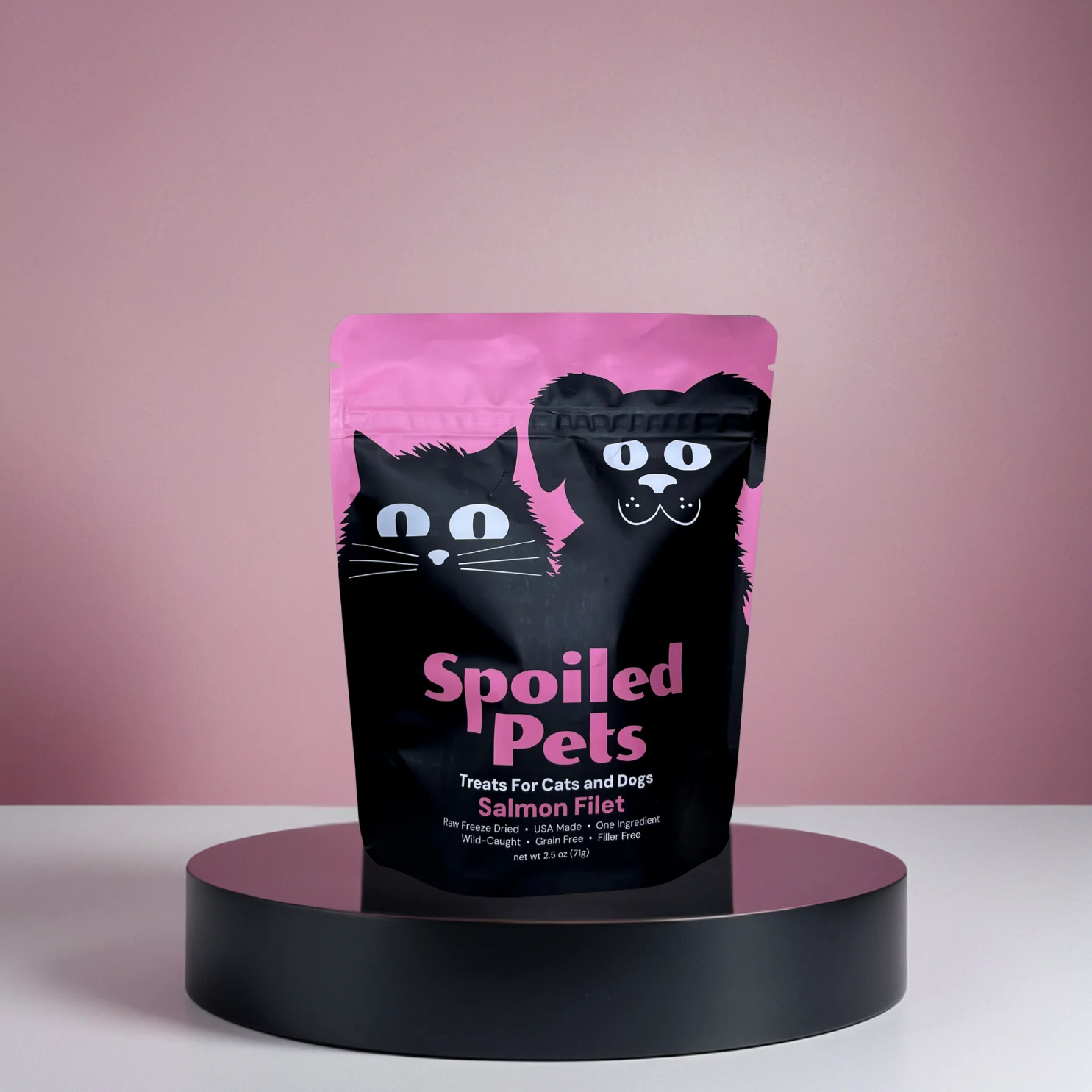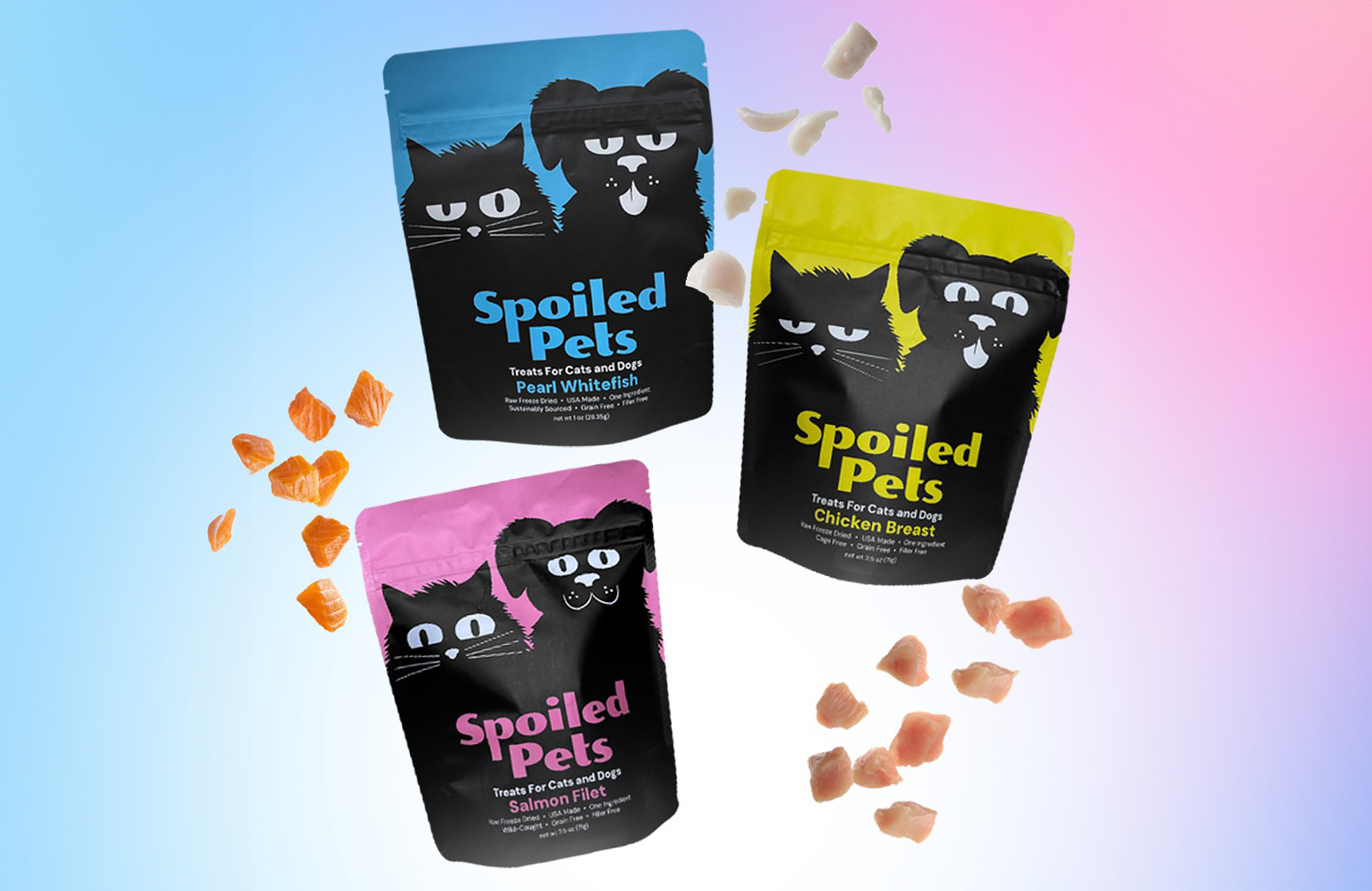 Spoiled Pets представил новую визуальную айдентику, в которой сочетаются минимализм, мемная эстетика и остроумие. Бренд использовал матовые чёрные пакеты в качестве основы для упаковки, создавая чистый и премиальный визуальный фон, а центральным элементом стали ироничные крупные изображения собак и кошек с неподвижными, почти «невозмутимыми» выражениями морд.