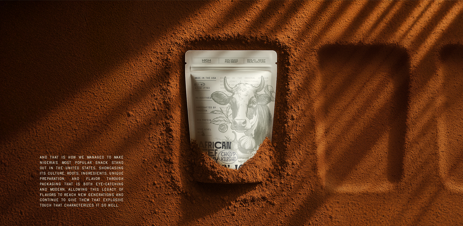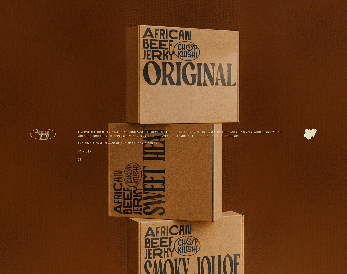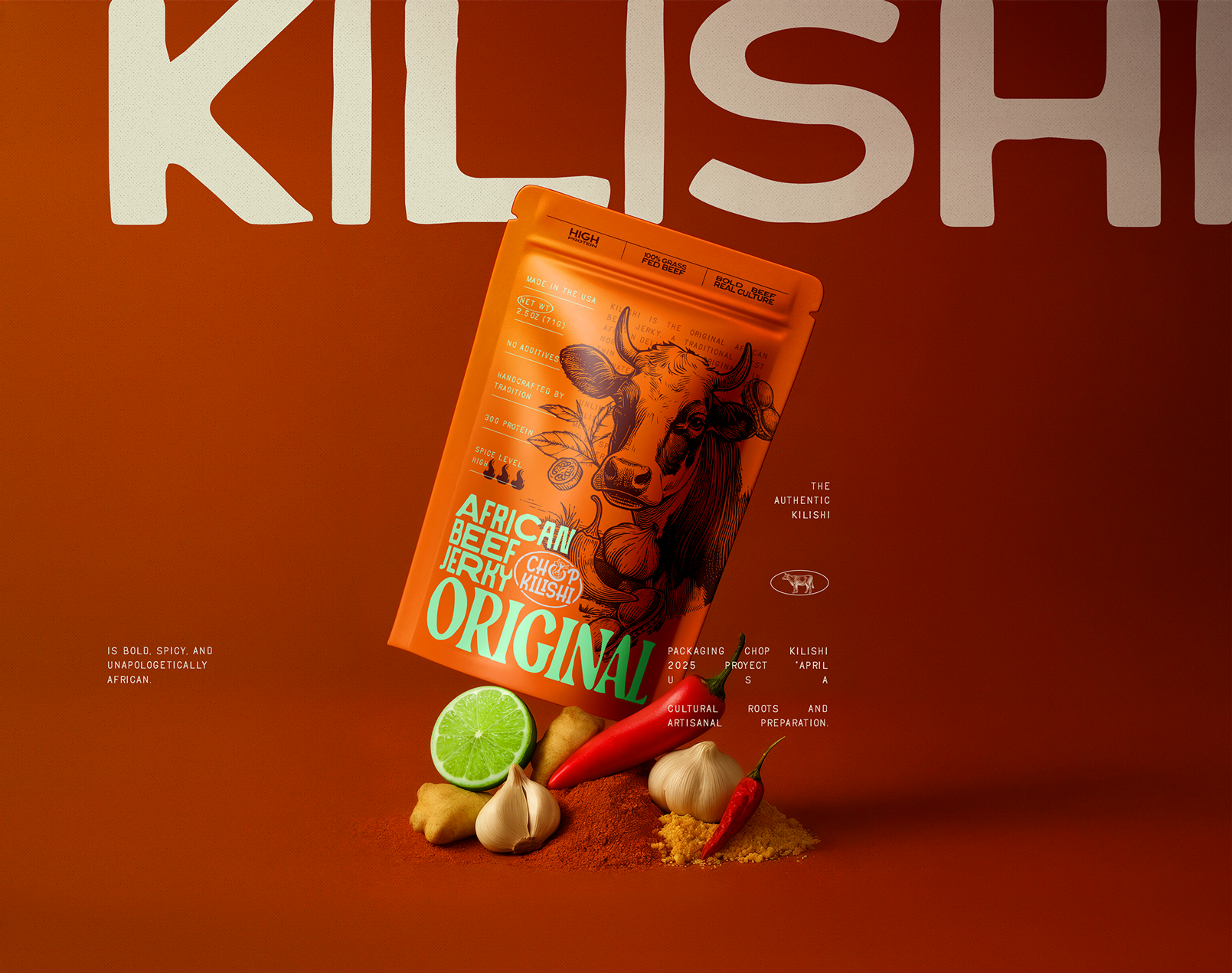 Проект Chop Kilishi ставил своей главной целью познакомить мир с аутентичным килиши — традиционным нигерийским мясным снеком, сохранив его культурную ценность и подчеркнув качество продукта. Дизайнер Mauricio Parra разработал новую айдентику и упаковку, стремясь объединить современный минимализм с уважением к истории, чтобы бренд оставался актуальным и привлекал новое поколение потребителей — в том числе тех, кто живёт за пределами Нигерии и ищет связь со своими корнями через вкус.