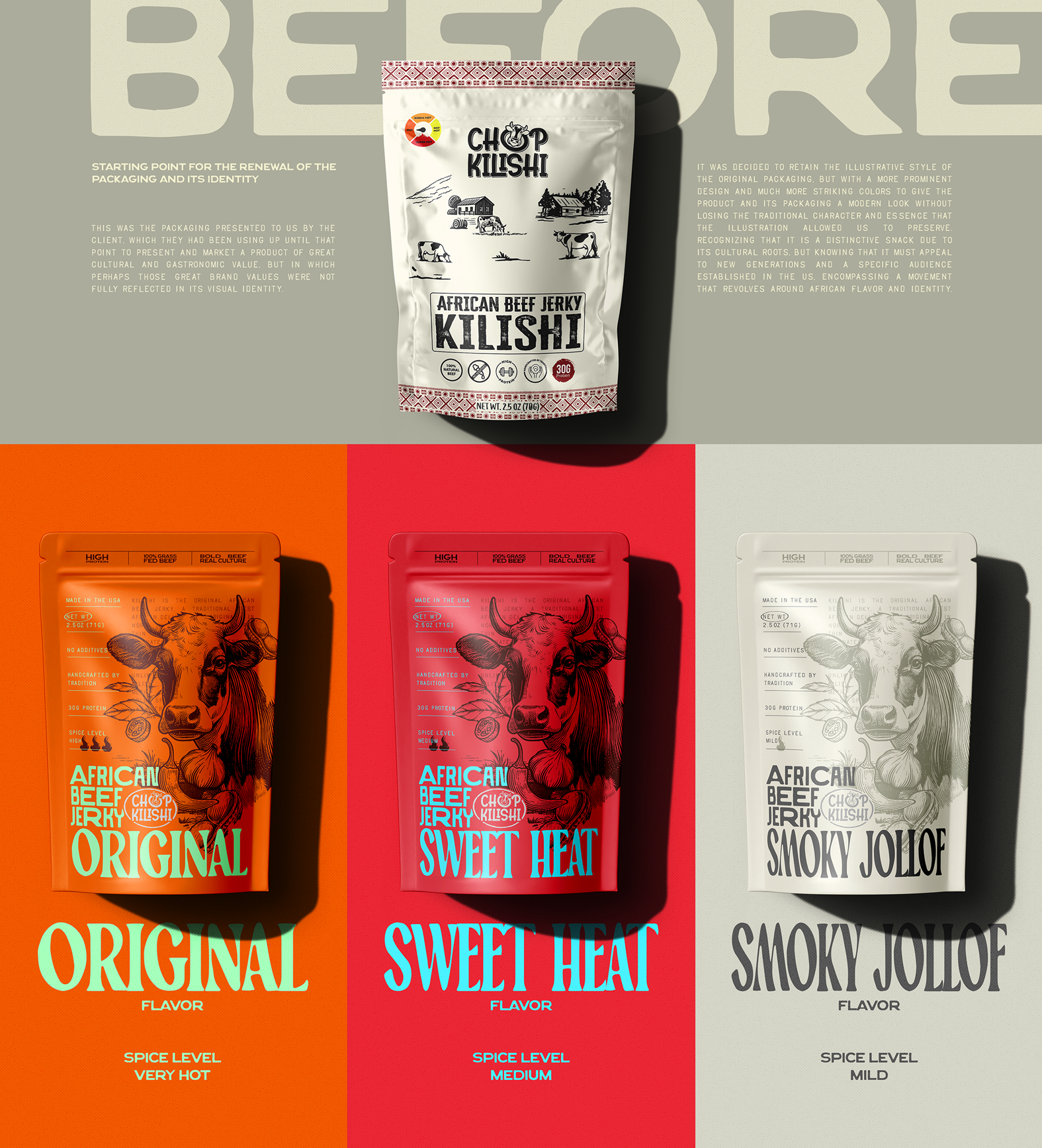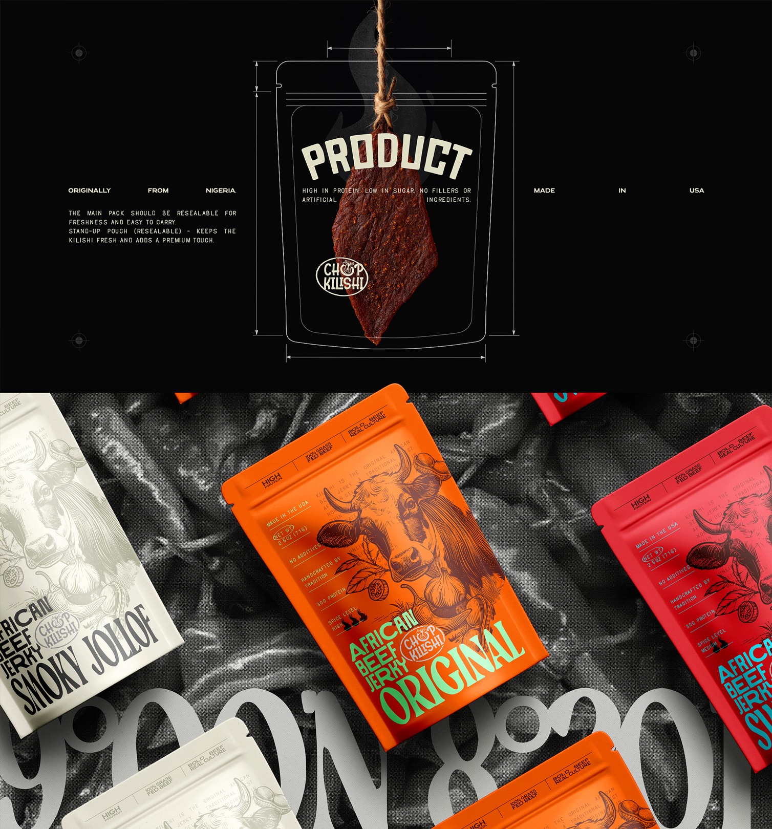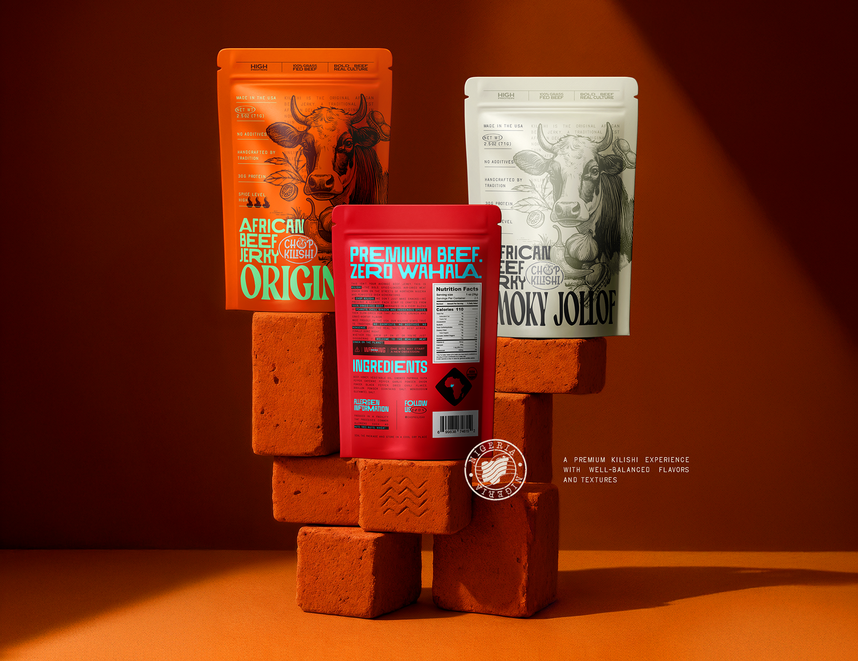 Проект Chop Kilishi ставил своей главной целью познакомить мир с аутентичным килиши — традиционным нигерийским мясным снеком, сохранив его культурную ценность и подчеркнув качество продукта. Дизайнер Mauricio Parra разработал новую айдентику и упаковку, стремясь объединить современный минимализм с уважением к истории, чтобы бренд оставался актуальным и привлекал новое поколение потребителей — в том числе тех, кто живёт за пределами Нигерии и ищет связь со своими корнями через вкус.
