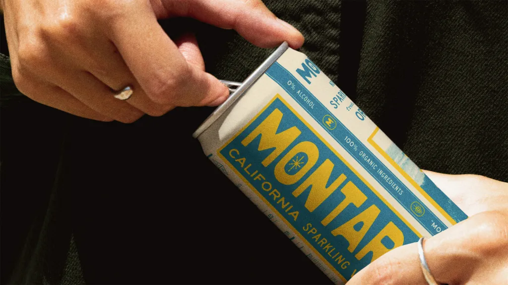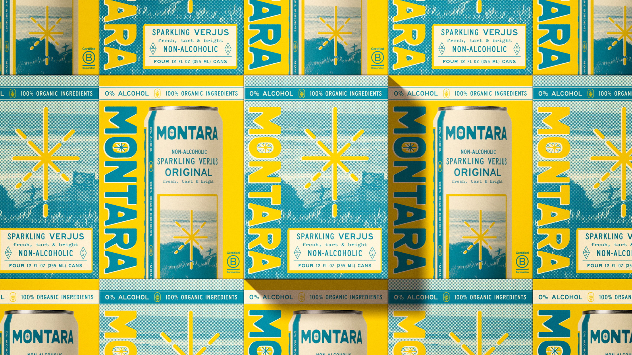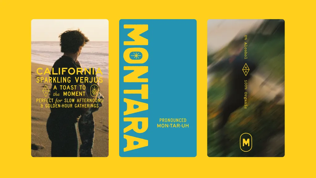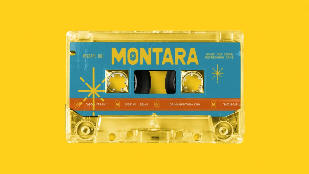 Дизайн отличается чистой, уверенной типографикой — название бренда Montara вертикально выстроено на банке, обеспечивая сильное присутствие на полке. Палитра сочетает электрический жёлтый и океанический синий, создавая ассоциации со свежестью и энергией прибрежного ветра. Символ звезды-луча выполняет двойную функцию: служит визуальной опорой и отсылает к игристости напитка.