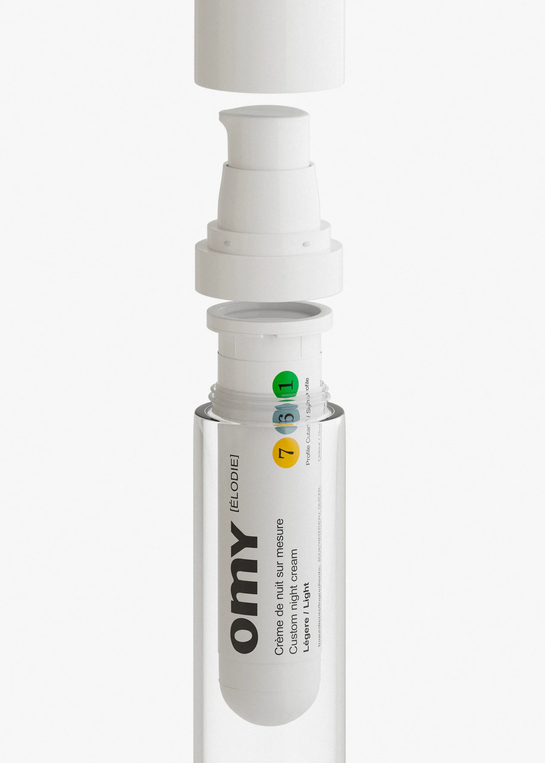 Для линейки персонализированных средств дизайн-команда разработала интеллектуальную систему сменных капсул, призванную усилить устойчивость производства. Каждая капсула устанавливалась в элегантную стеклянную банку и получила цветовую нумерацию, обозначающую индивидуальный код пользователя. Номера и цвета коррелировали с индексом основных функций продукта и составляющих ингредиентов — подход, который трактовал уход за кожей как науку и упрощал процесс его подбора.
