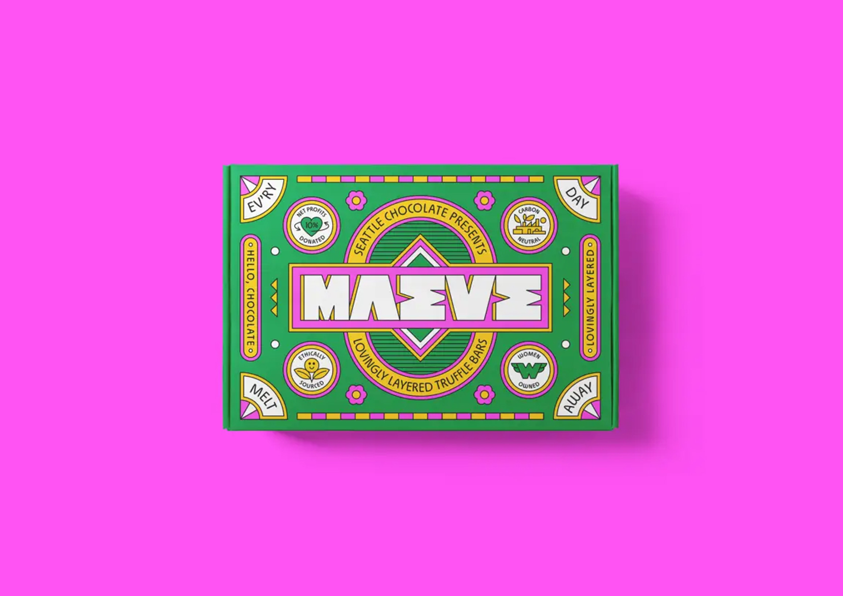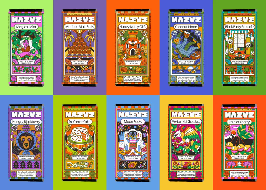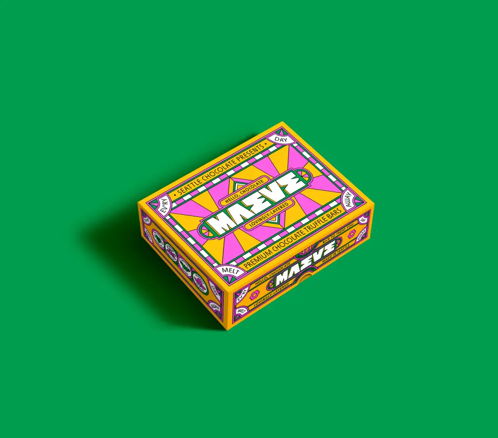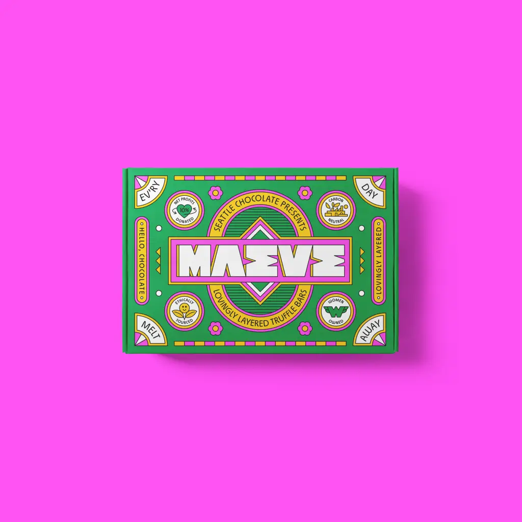После 30 лет работы Seattle Chocolate провела смелый ребрендинг и стала Maeve — брендом, вдохновлённым воинственной королевой из ирландской мифологии. Айдентику разработала студия Young Jerks, создав целый фантазийный мир с богиней-маэстро во главе.