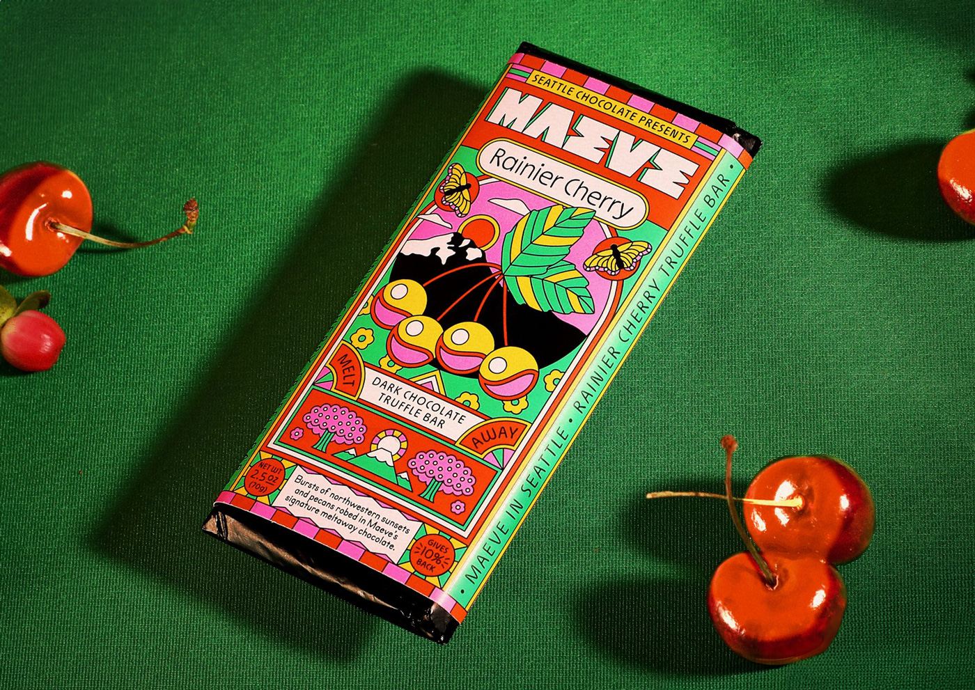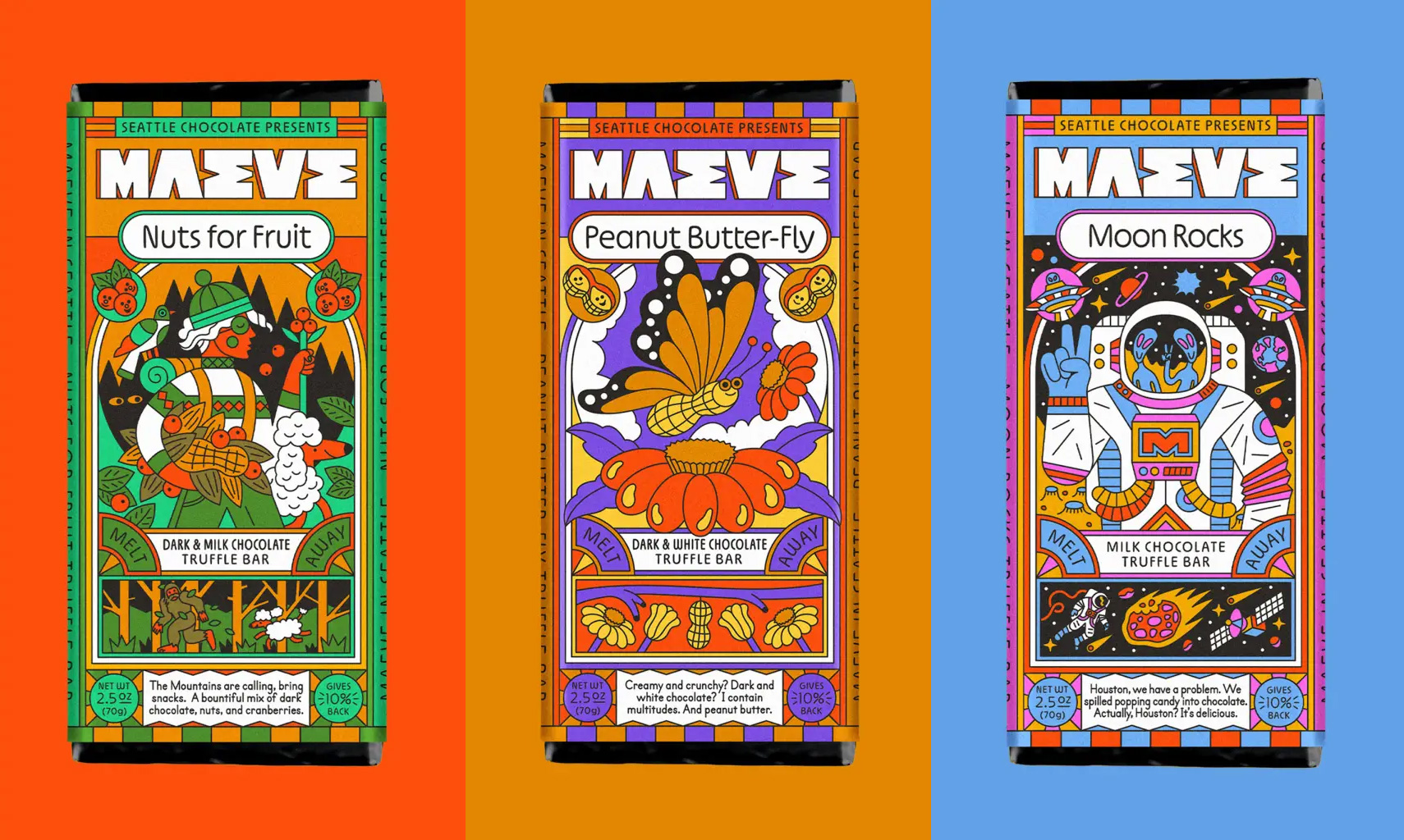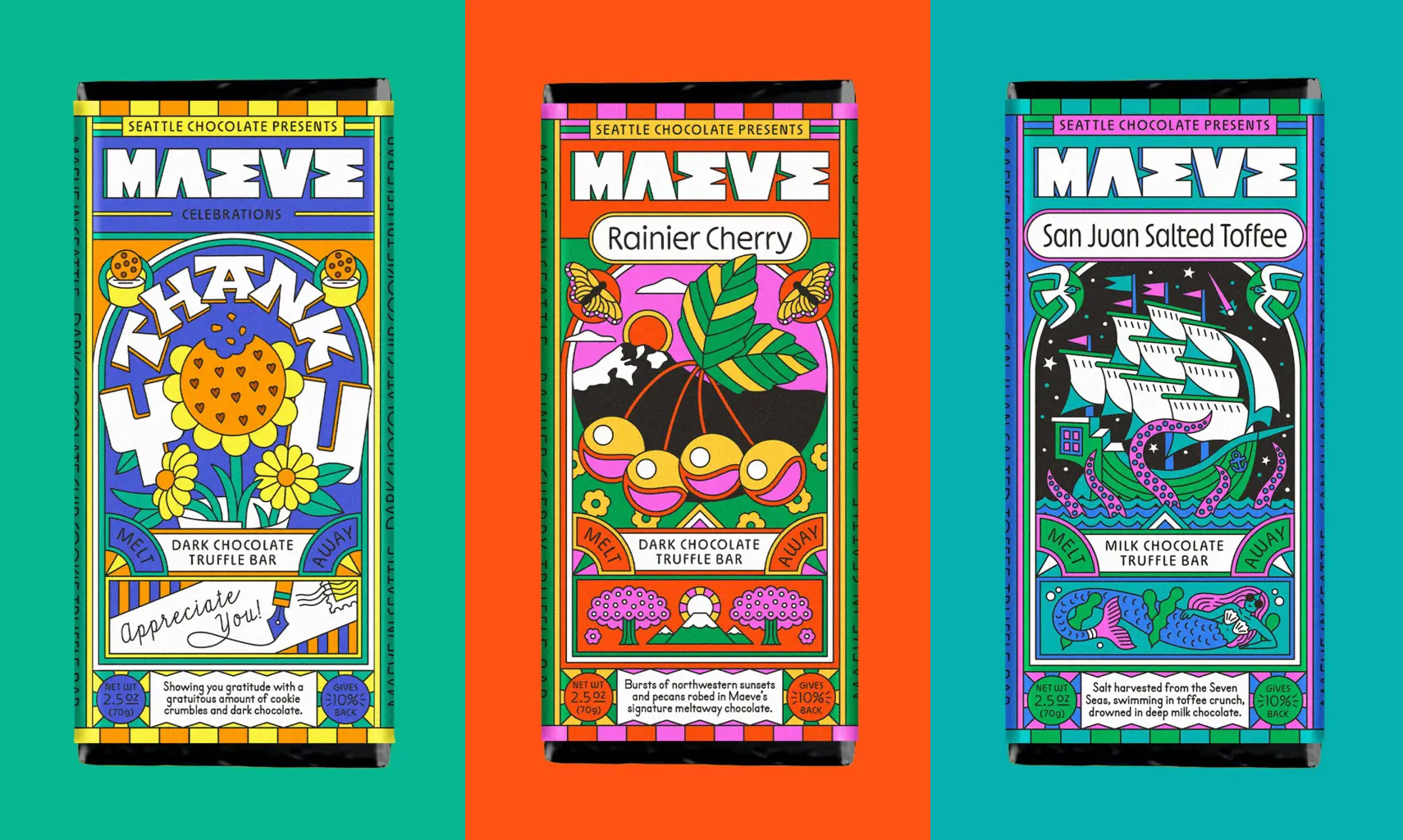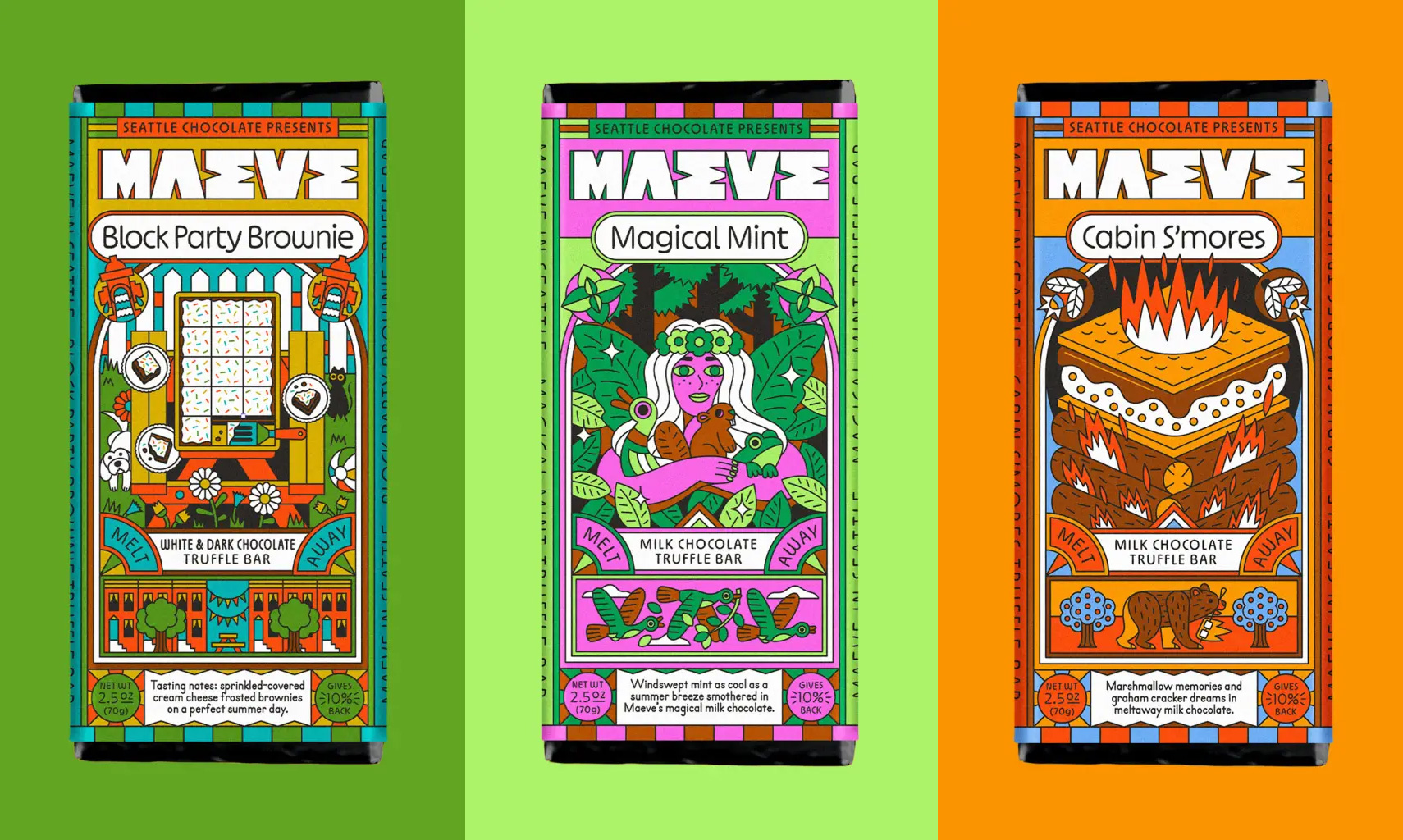 После 30 лет работы Seattle Chocolate провела смелый ребрендинг и стала Maeve — брендом, вдохновлённым воинственной королевой из ирландской мифологии. Айдентику разработала студия Young Jerks, создав целый фантазийный мир с богиней-маэстро во главе.