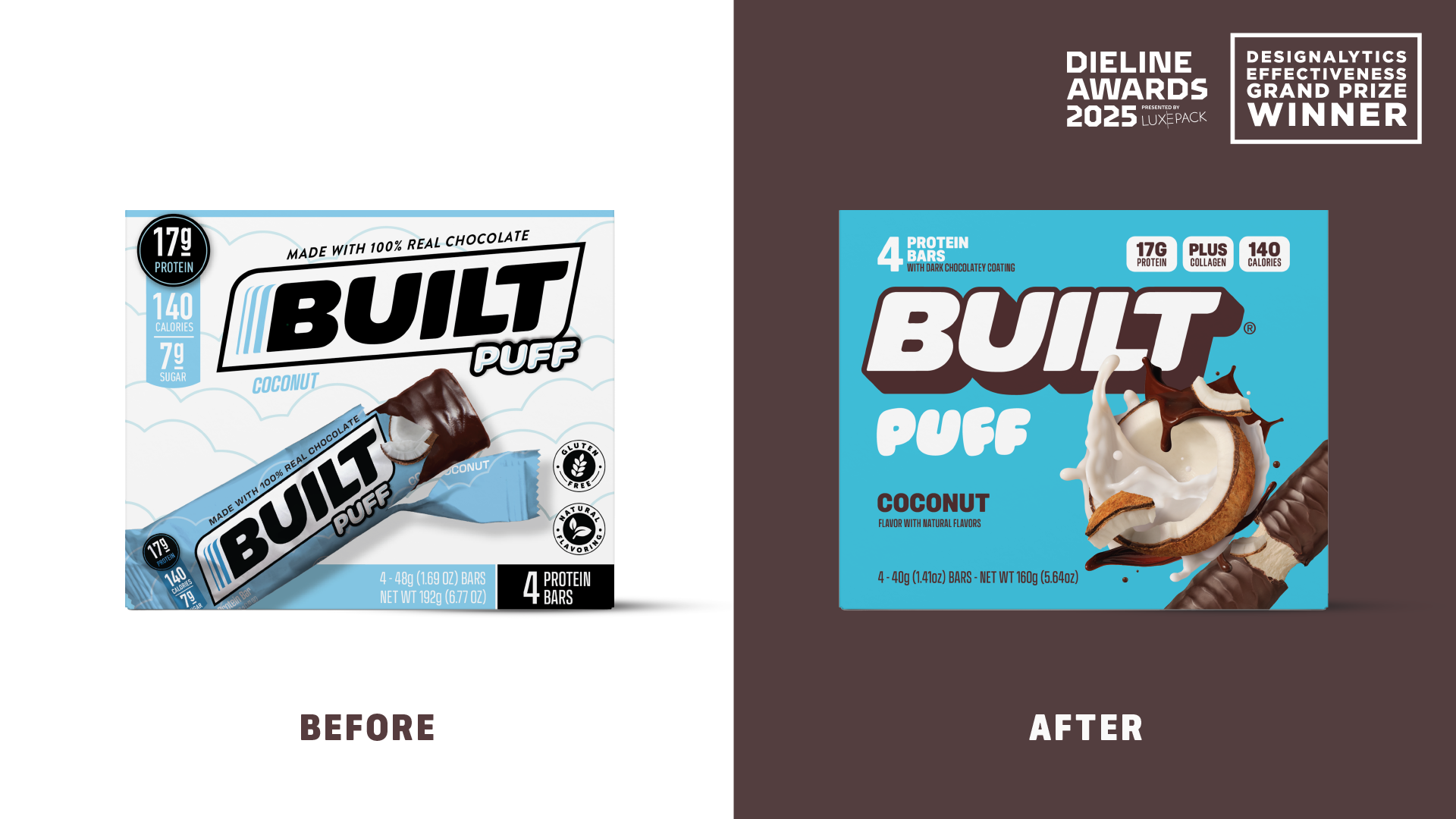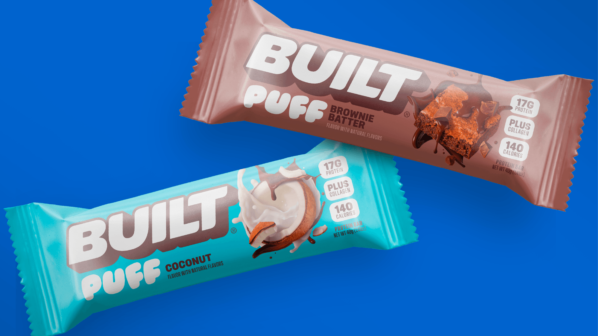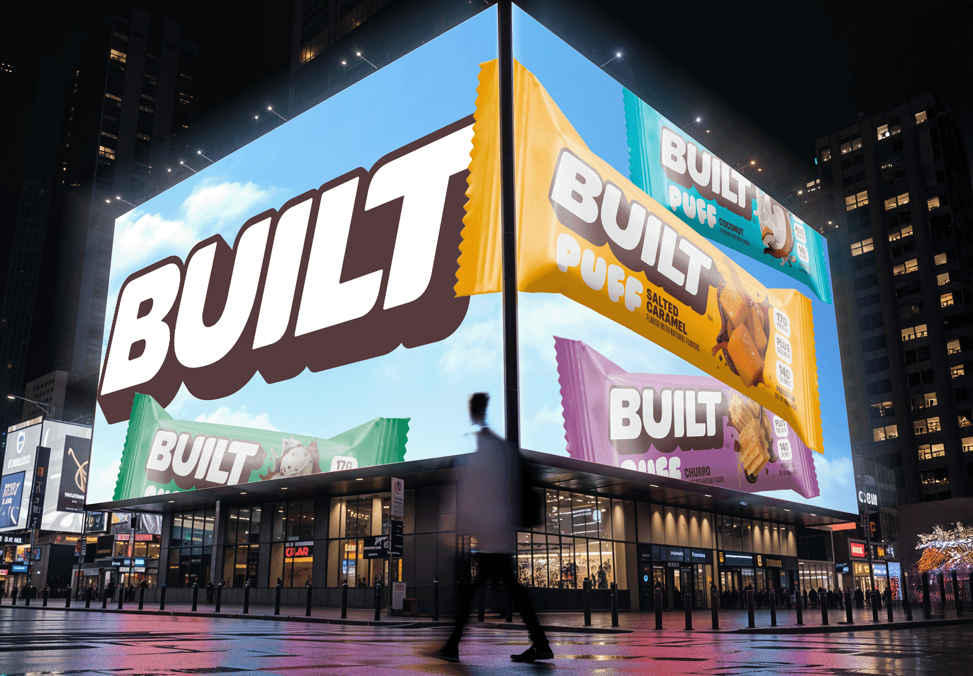 Ключевой задачей редизайна стало дистанцирование от устаревших кодов спорт-нутришн-брендов и усиление того, чем BUILT является на самом деле: эмоциональным, доступным и «вкус-первым» продуктом с массовой привлекательностью. Обновлённая айдентика и упаковка должны были не только работать эффективнее в ритейле, но и подчёркивать продуктовый опыт — в частности, уникальную маршмеллоу-текстуру линейки Puffs — и чётко разграничивать её с классическими батончиками.