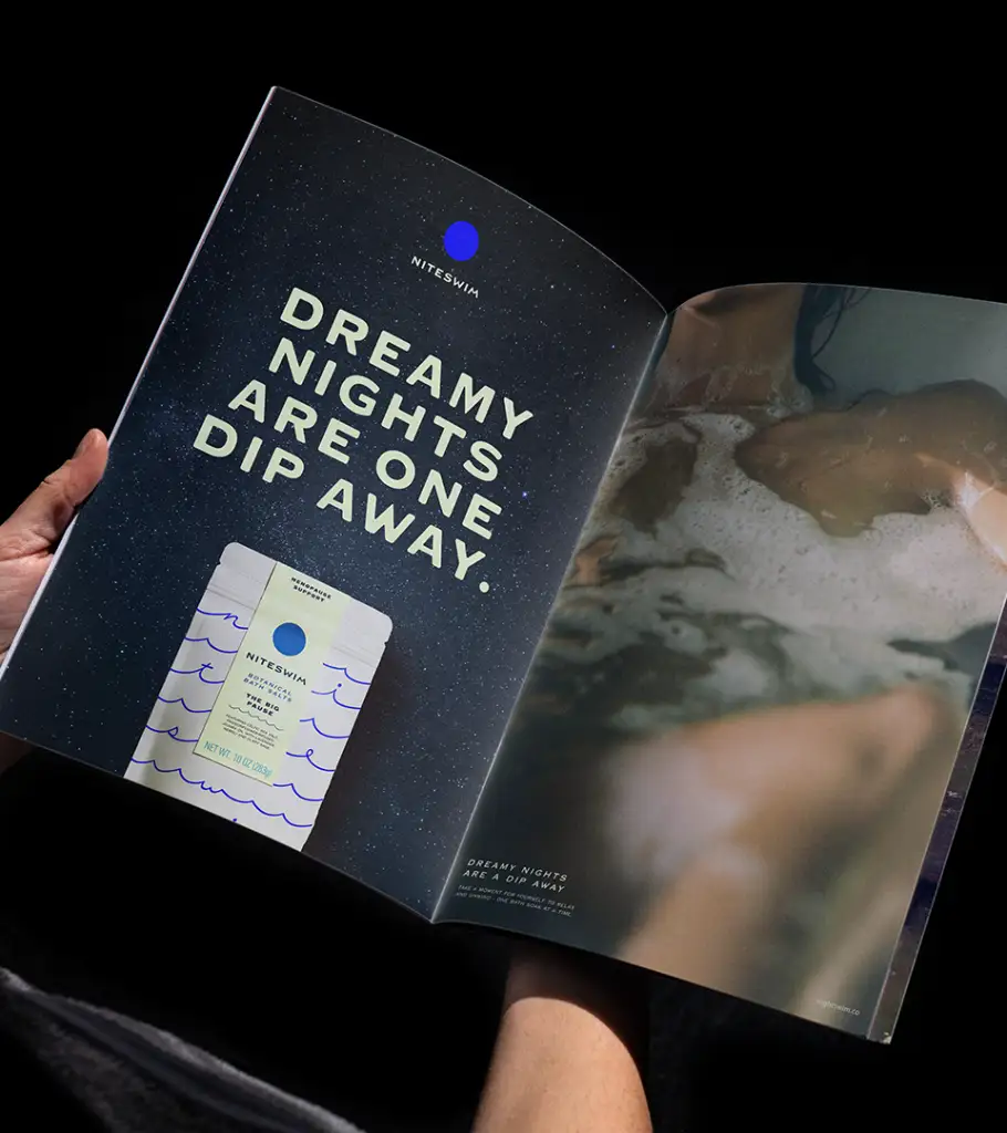 Название Niteswim стало ключевой отправной точкой. В нём уже заложен образ неподвижности, погружённости и присутствия — состояний, которые легли в основу всей айдентики. Отсюда — интерес к темам целостности и свечения: полная луна, белый свет в темноте, мягкое сияние на границе видимого. Даже типографика работает на это ощущение: волны спрятаны в очертаниях букв, создавая эффект текучести, который ощущается скорее телесно, чем визуально.